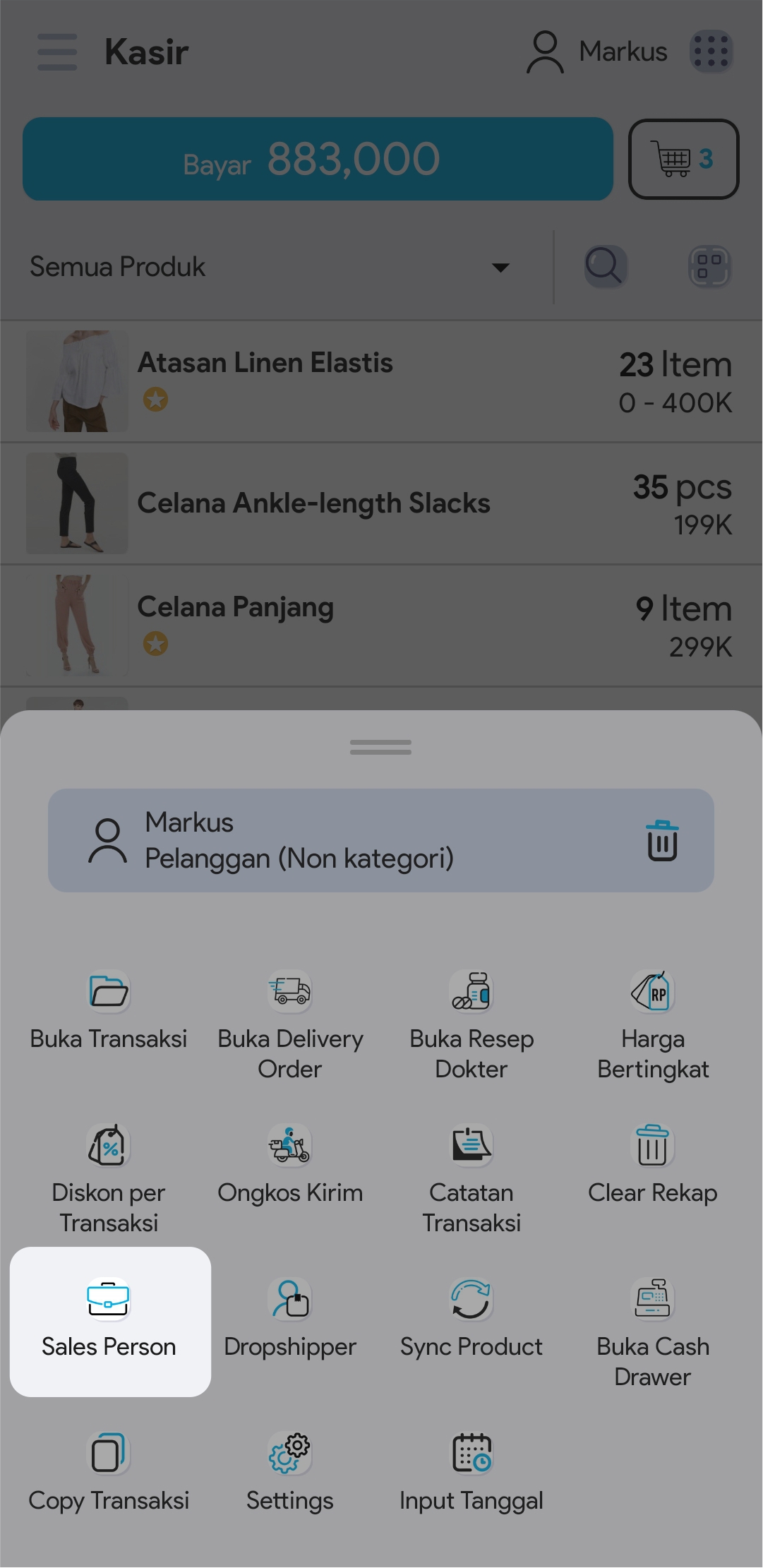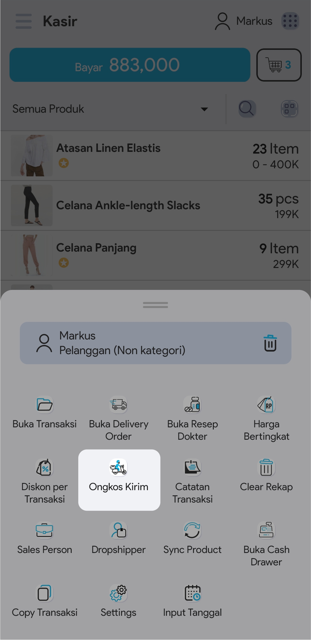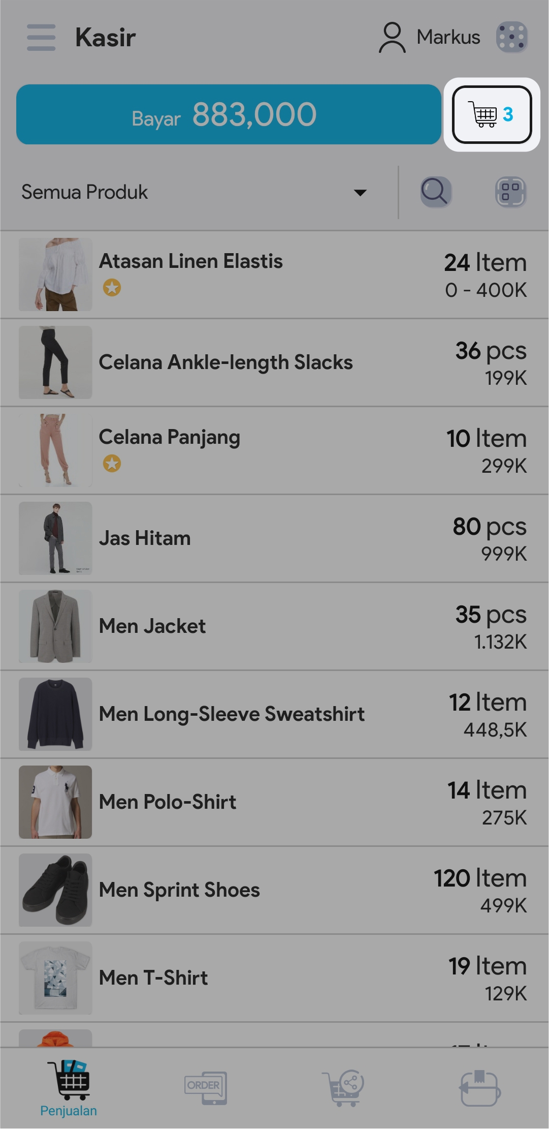 5. Masukkan jumlah produk dengan cara mengetuk produk sebanyak jumlah produk yang ingin ditransaksikan atau atur jumlah produk di segmen Keranjang