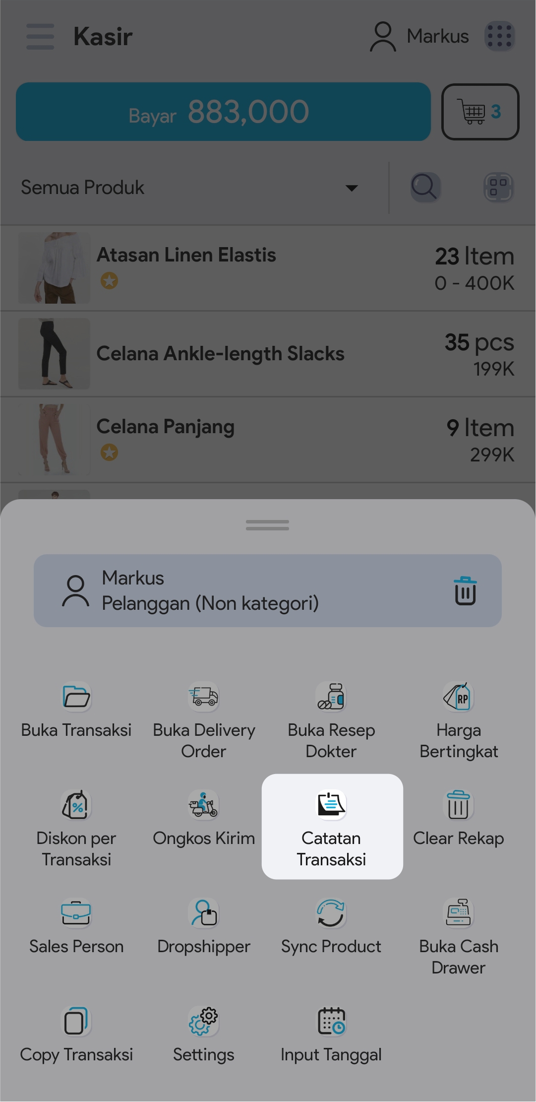 7. Pilih produk untuk mengatur jumlah produk, mencatat diskon per produk (opsional) atau mencatat permintaan khusus. Catatan yang dibuat dapat disimpan dan dipergunakan untuk transaksi yang lain.