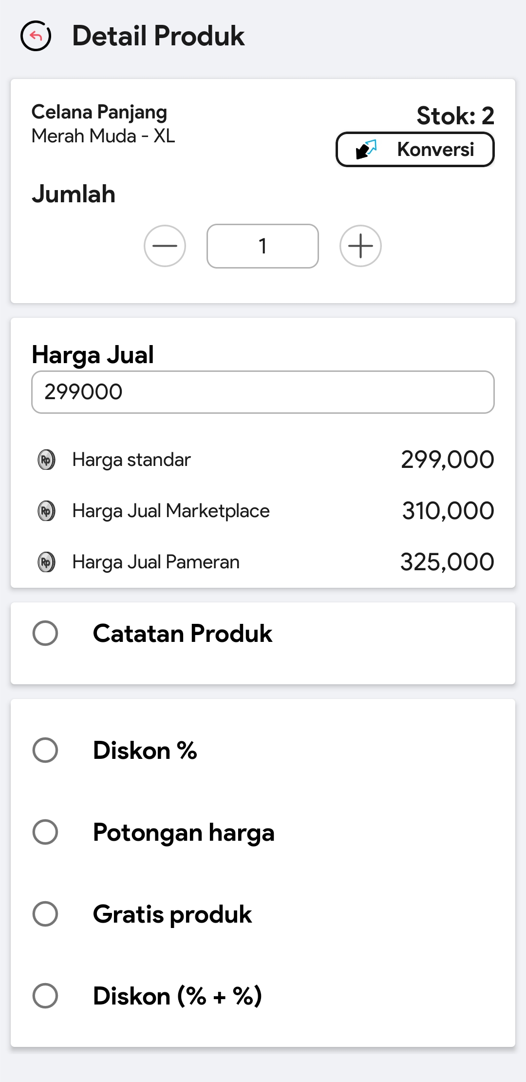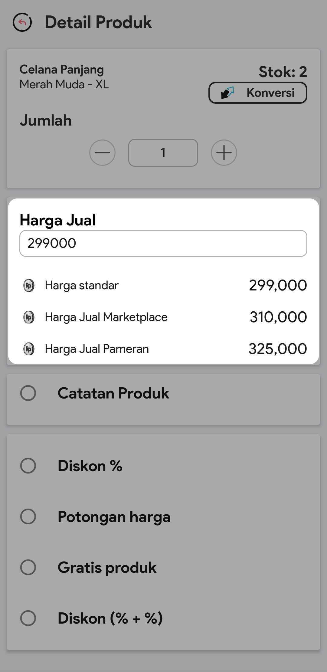 Apabila Anda telah melakukan pengaturan harga bertingkat pada Fasilitas Produk, maka akan muncul pilihan harga jual bertingkat.