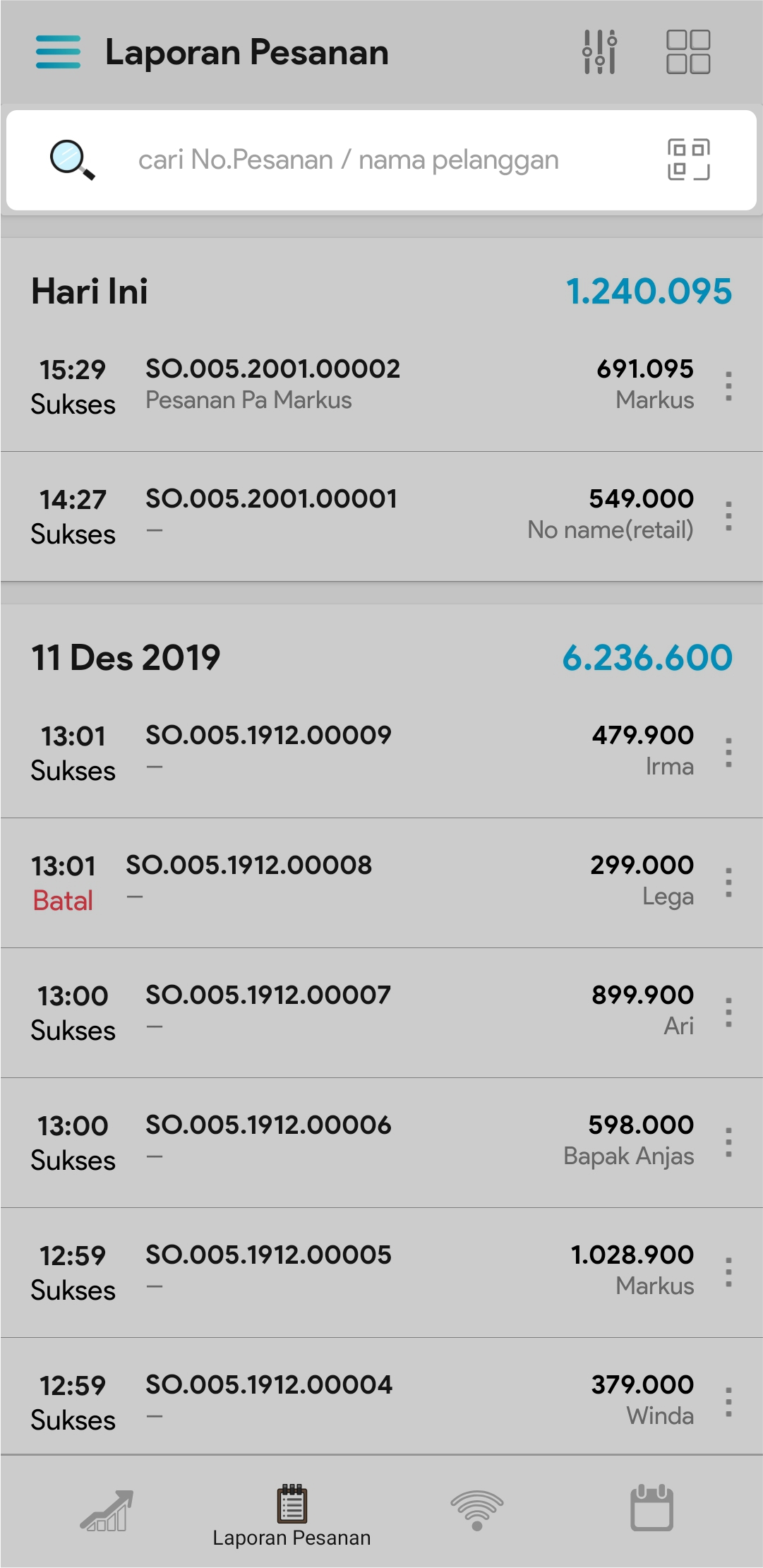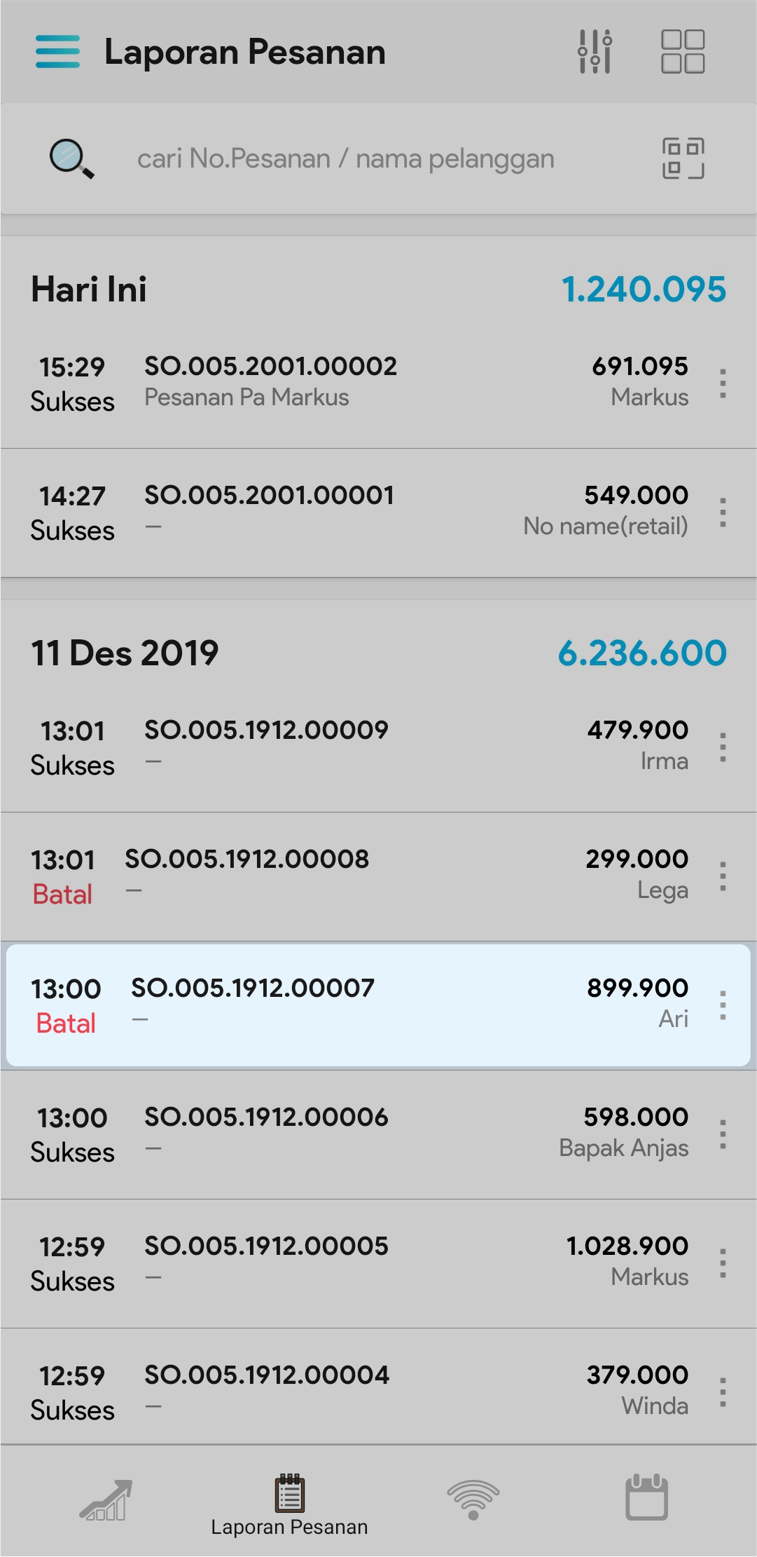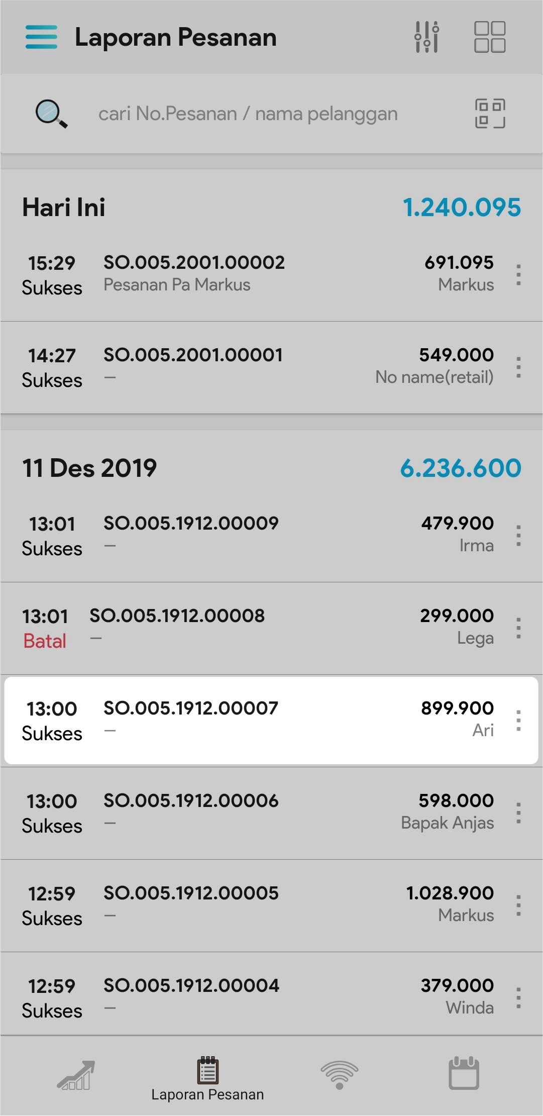2. Masukkan nama pelanggan atau no pesanan pada kolom pencarian atau gunakan scanner barcode untuk mencari transaksi pesanan pelanggan tertentu