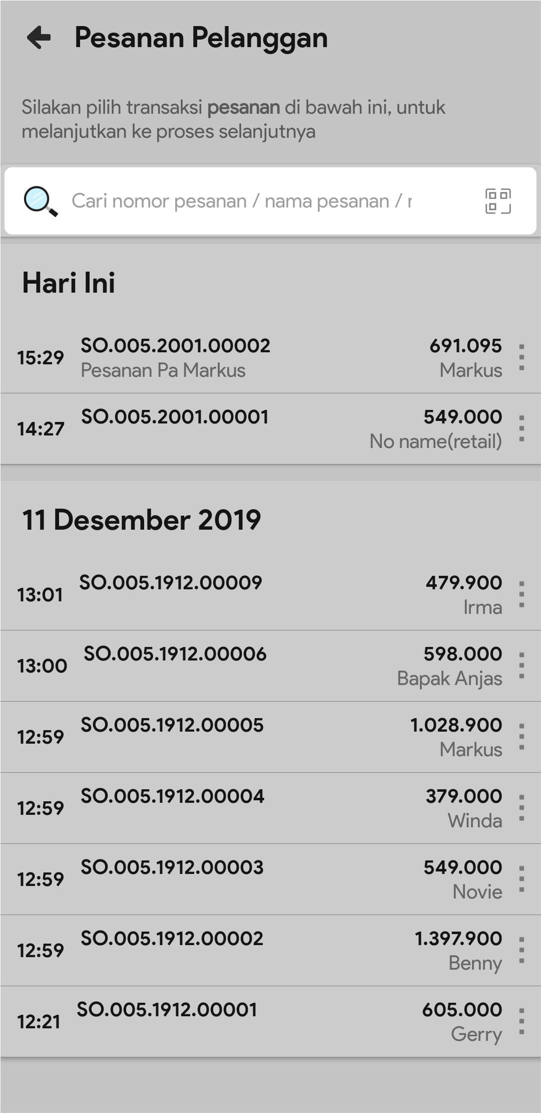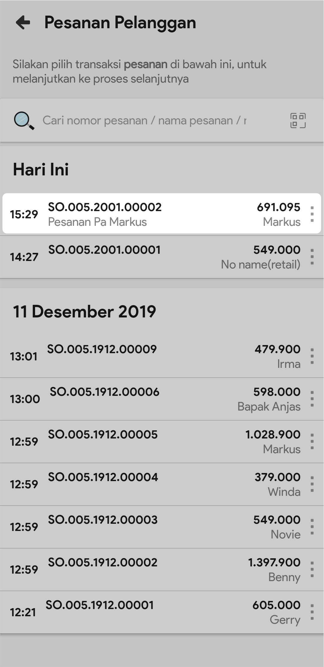 4. Masukkan nama pelanggan, nama pesanan atau no pesanan pada kolom pencarian atau lakukan scan QR Code dari pesanan yang sudah dibuat