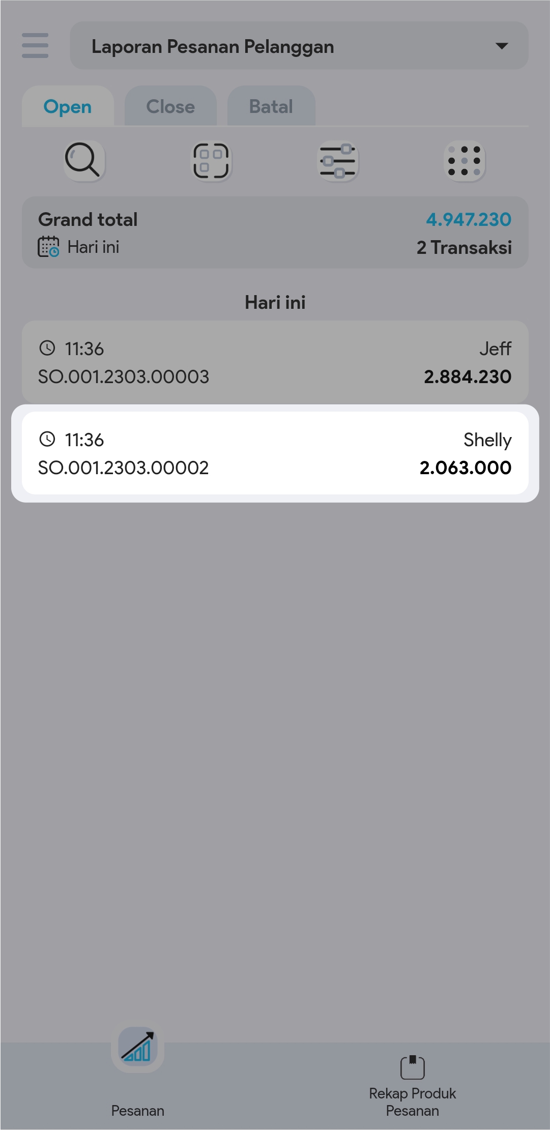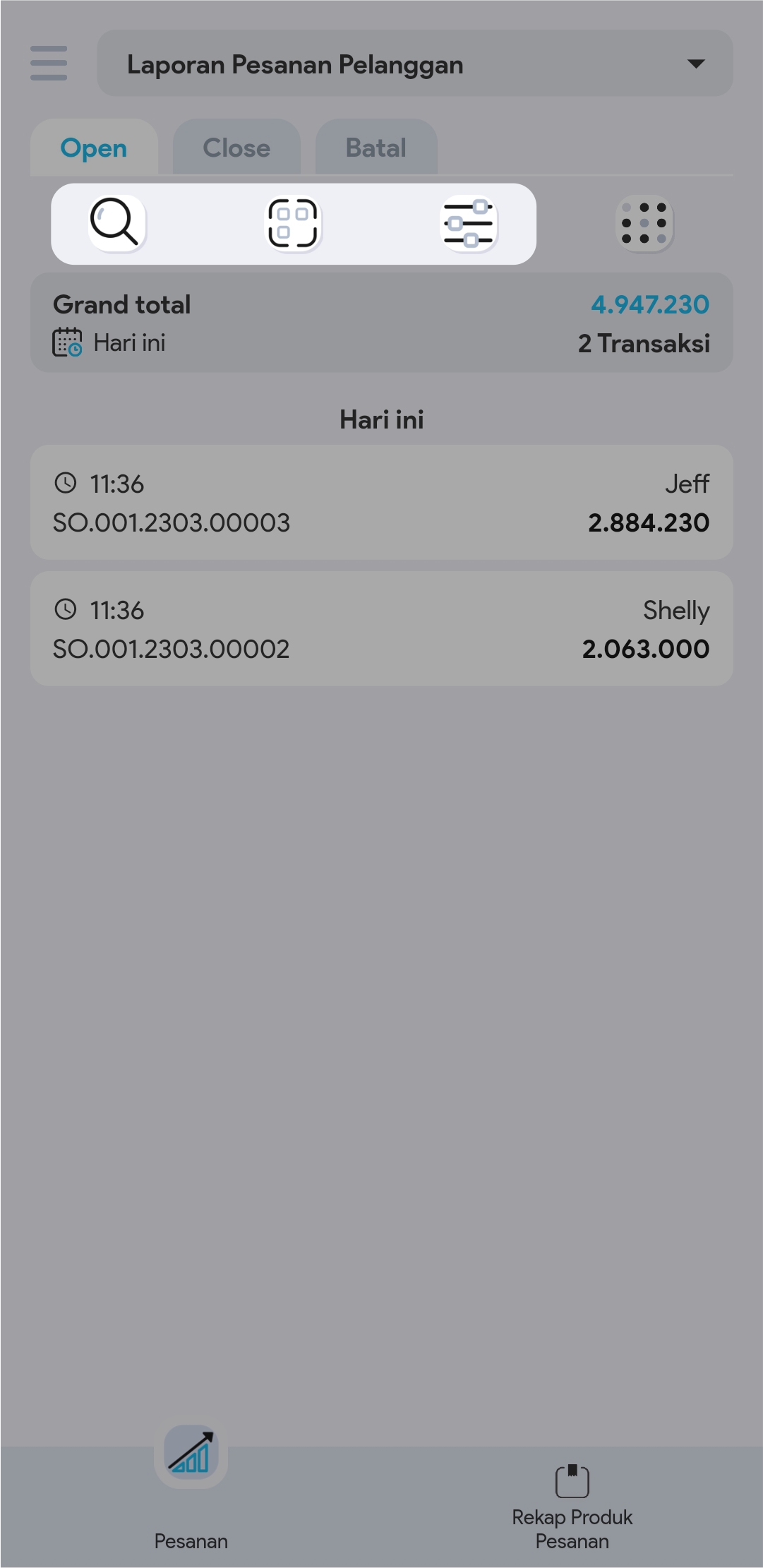 2.  Anda dapat menggunakan Search, Scan atau Filter, untuk mencari pesanan yang ingin ditambahkan DP-nya
