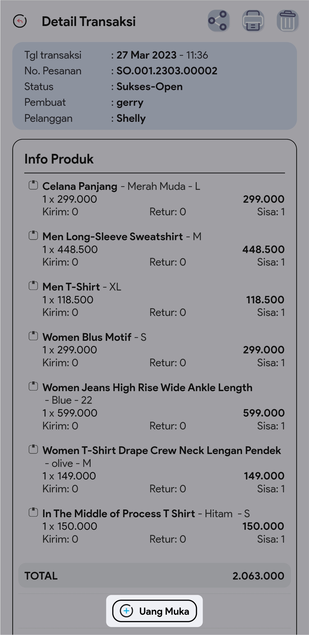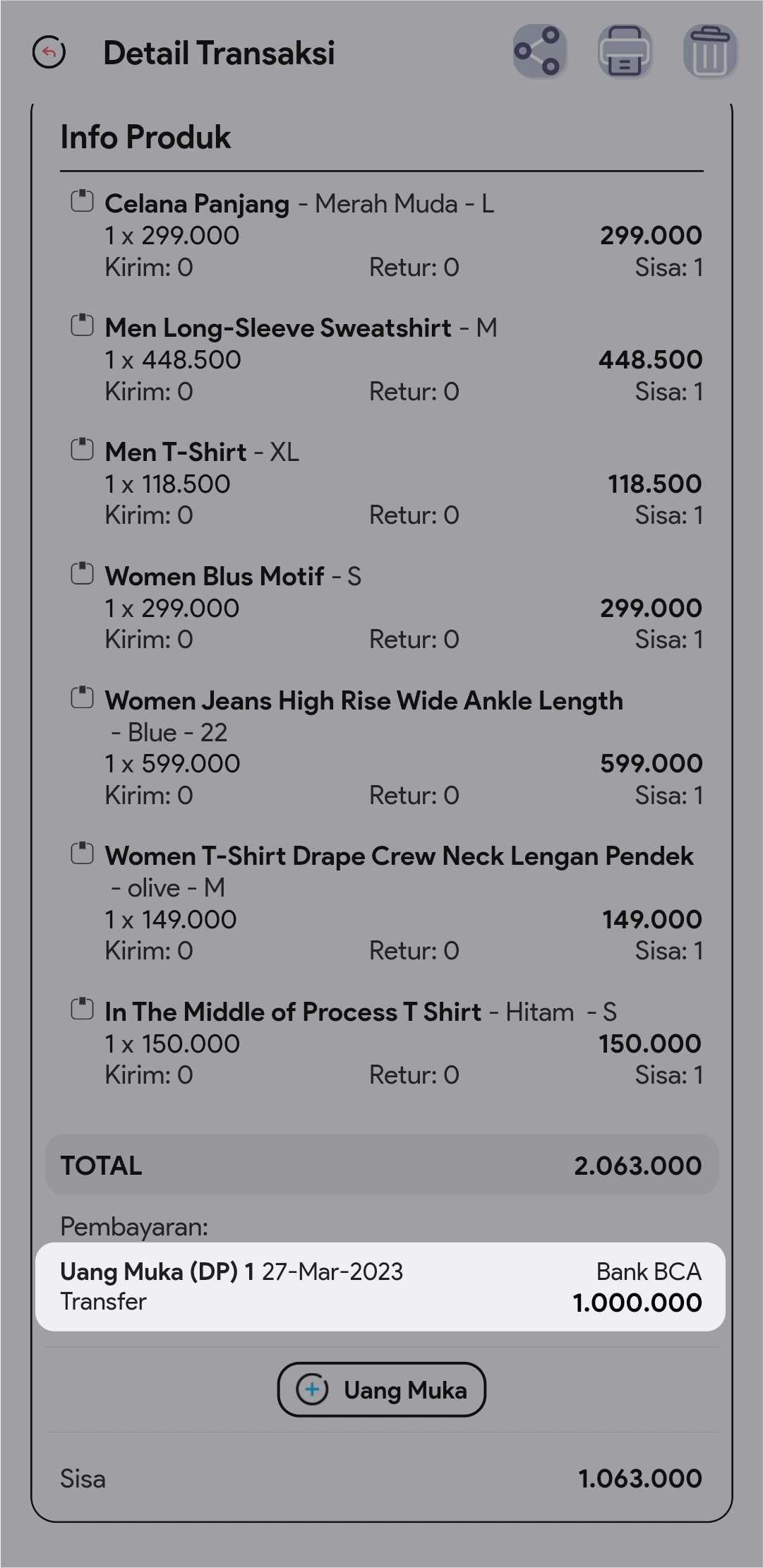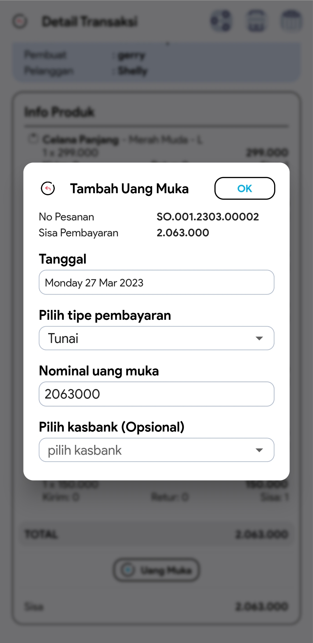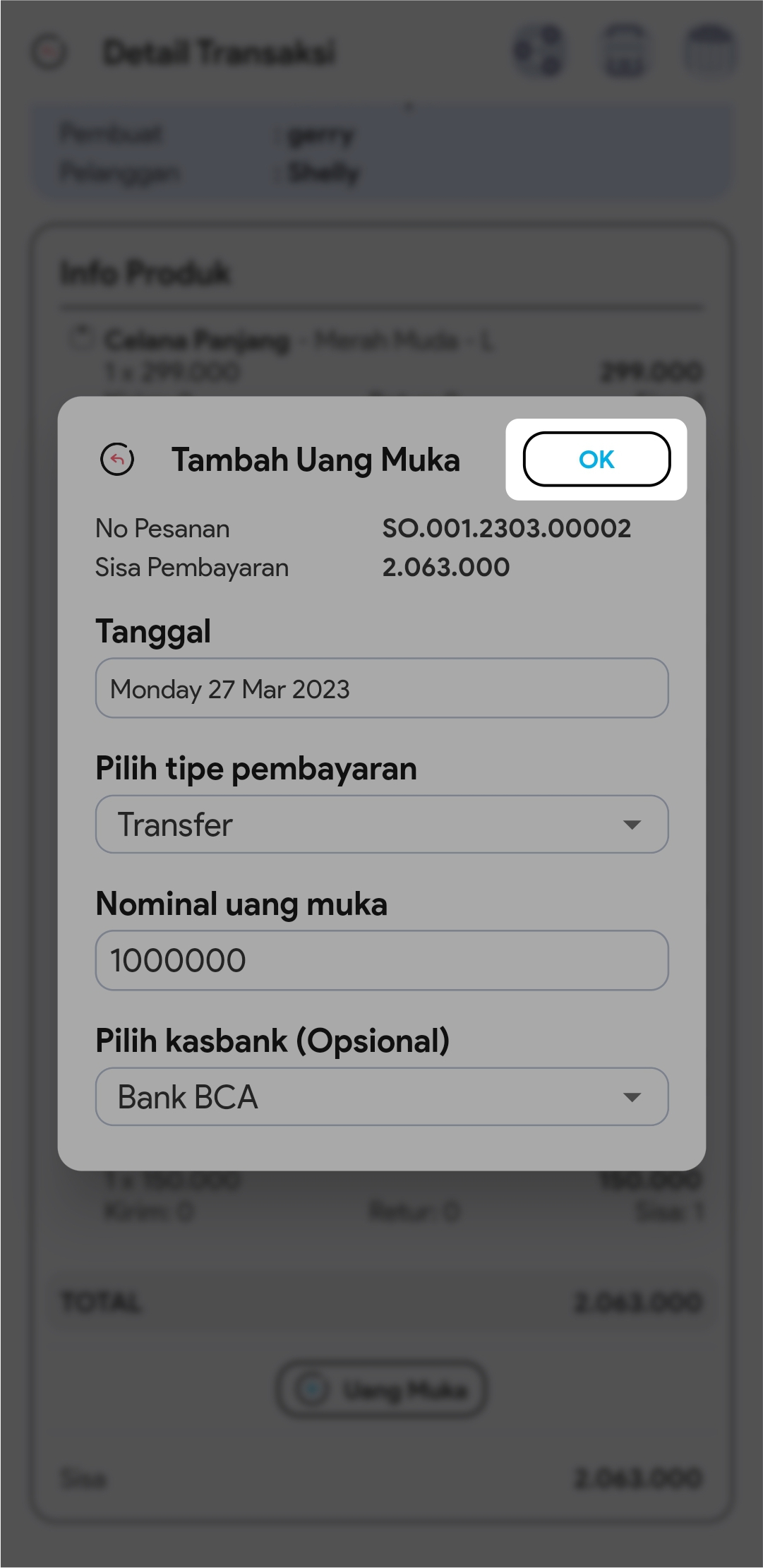4.  Di halaman detail, klik button + Uang Muka
