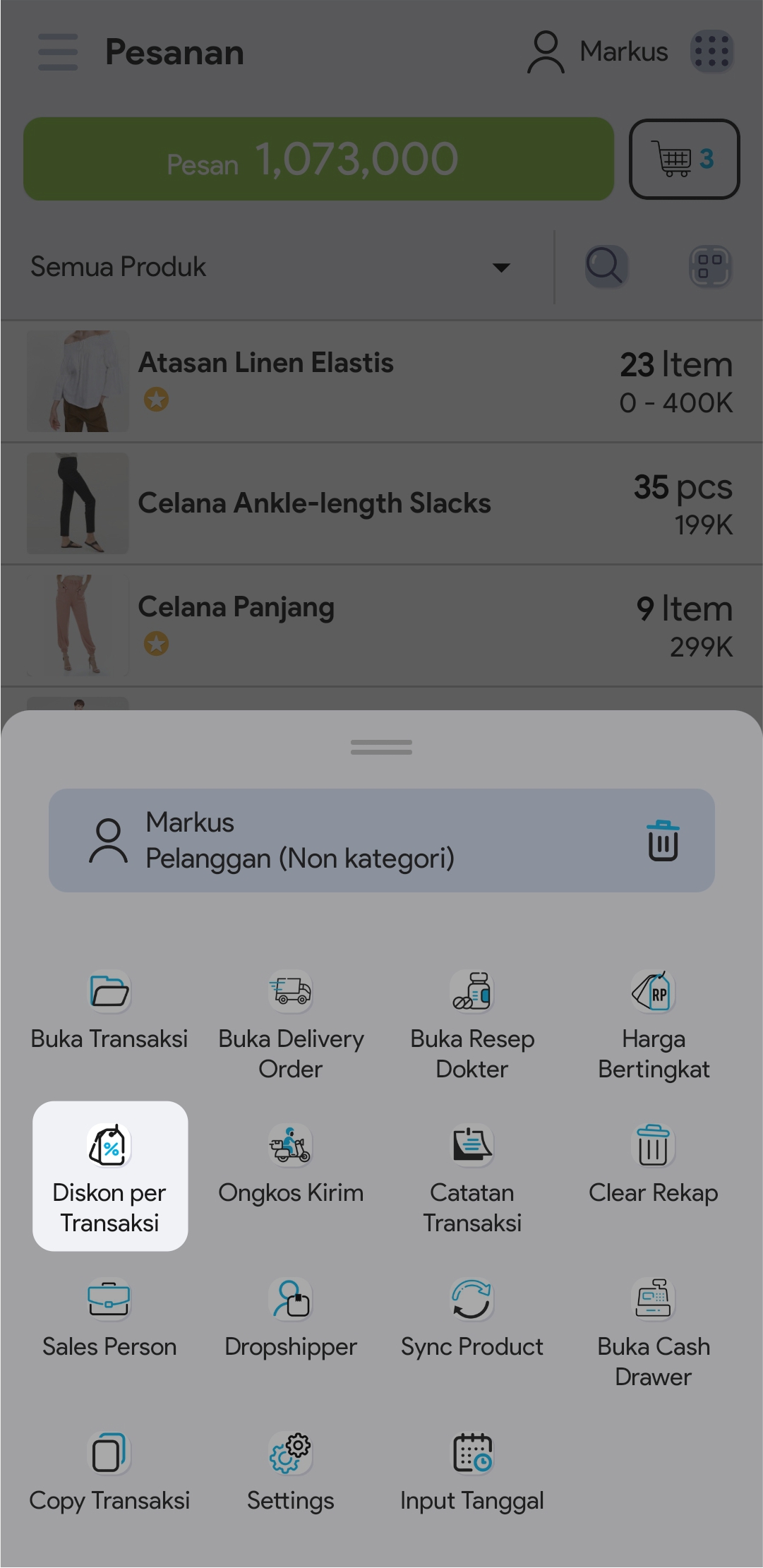 9. Pilih Diskon Per Transaksi untuk memberikan diskon bagi keseluruhan nominal total pesanan