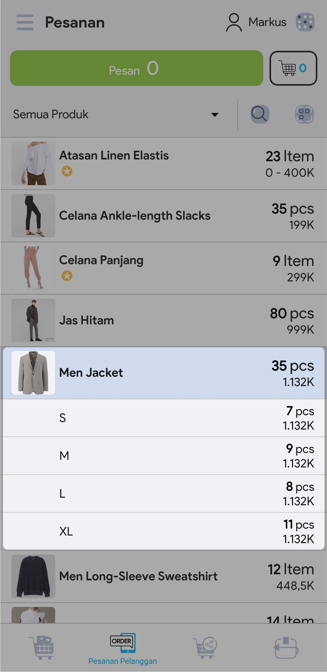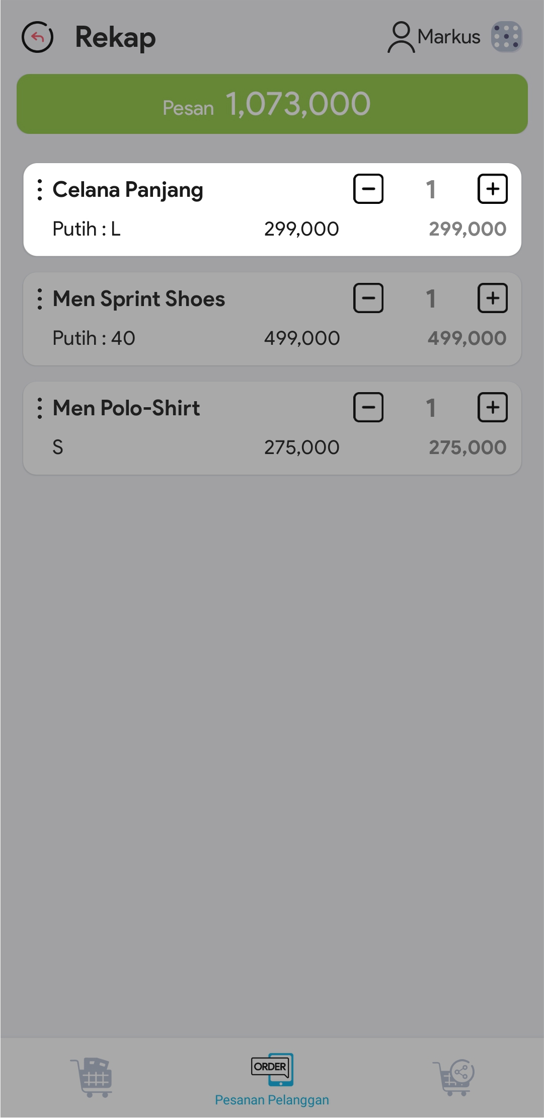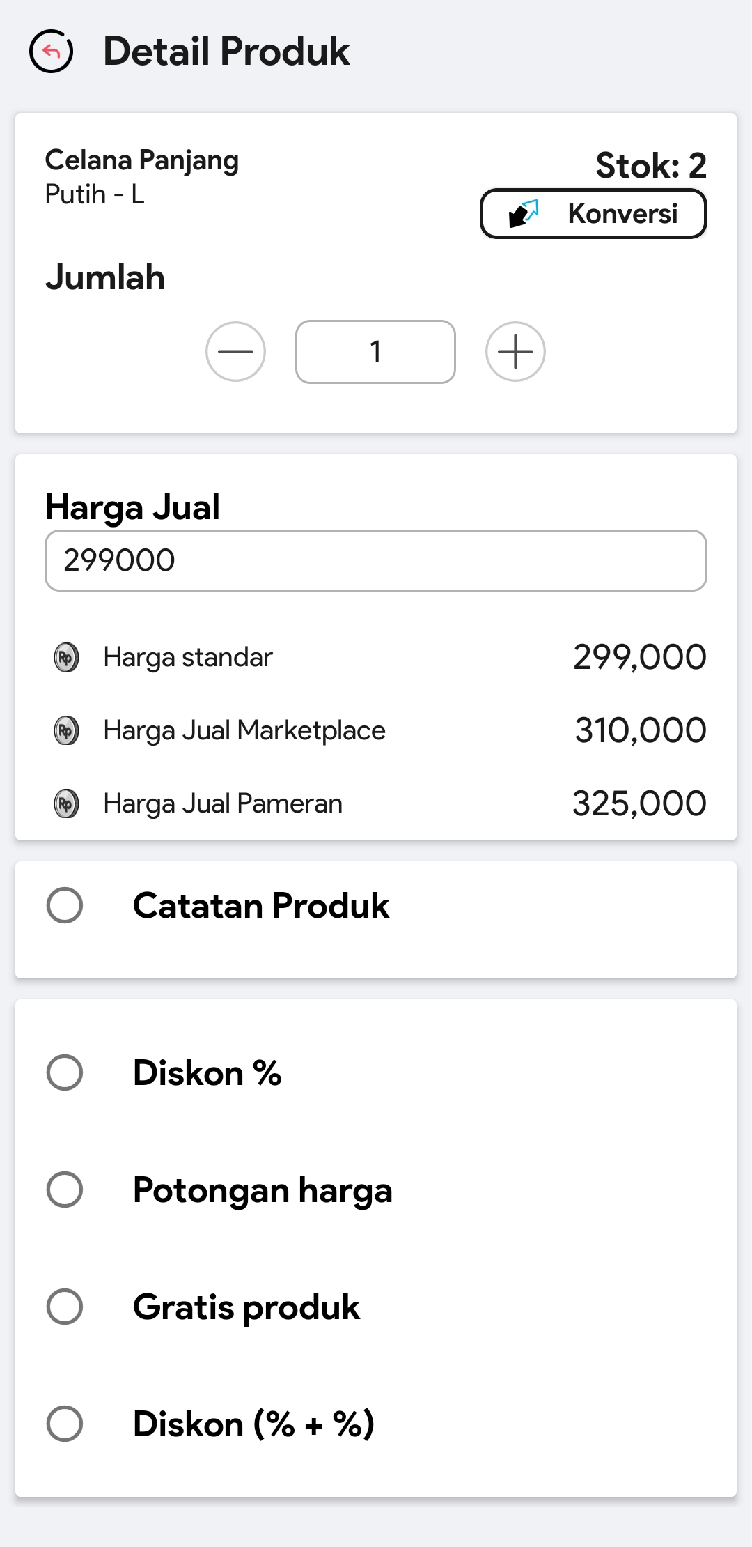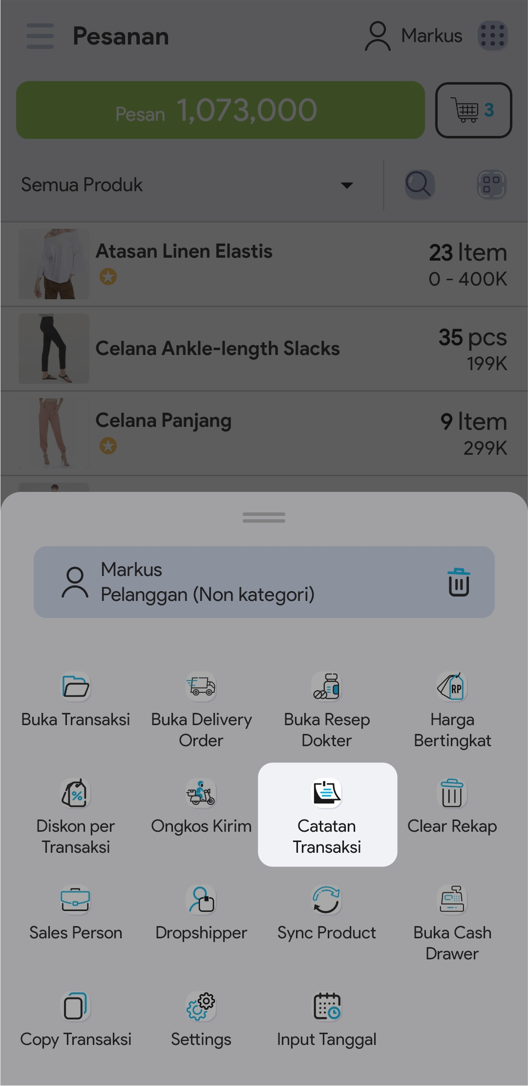 7. Pilih produk untuk mengatur jumlah produk, mencatat diskon per produk (opsional) atau mencatat permintaan khusus. Catatan yang dibuat dapat disimpan dan dipergunakan untuk transaksi yang lain