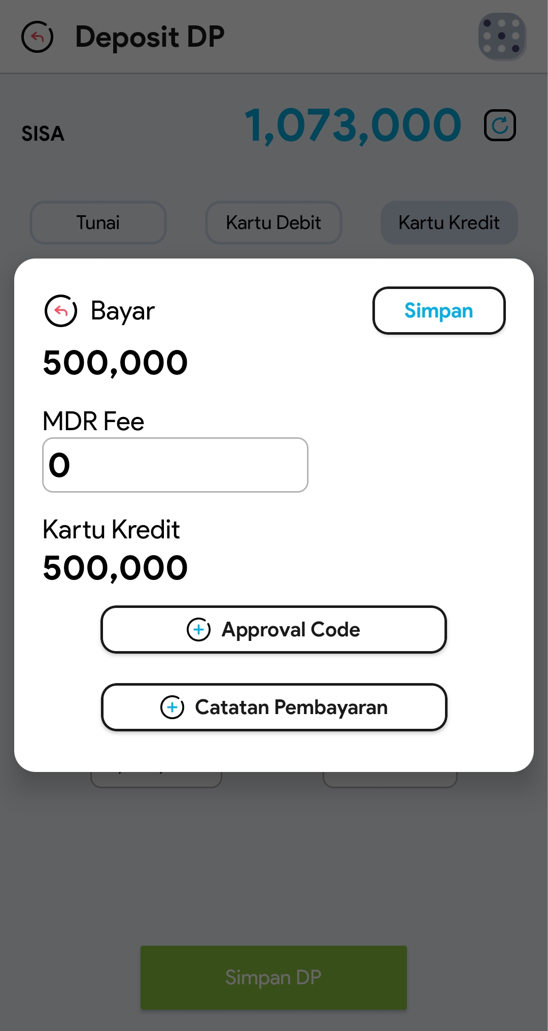 19. Catatan pembayaran dan approval code (opsional) dapat digunakan sebagai pelengkap data pada tipe pembayaran kartu debit atau kartu kredit. Contoh: nama bank dari kartu yang digunakan untuk pembayaran. Silahkan atur biaya MDR kartu kredit apakah ditanggung oleh pembeli atau tidak di fasilitas Daftar Outlet.