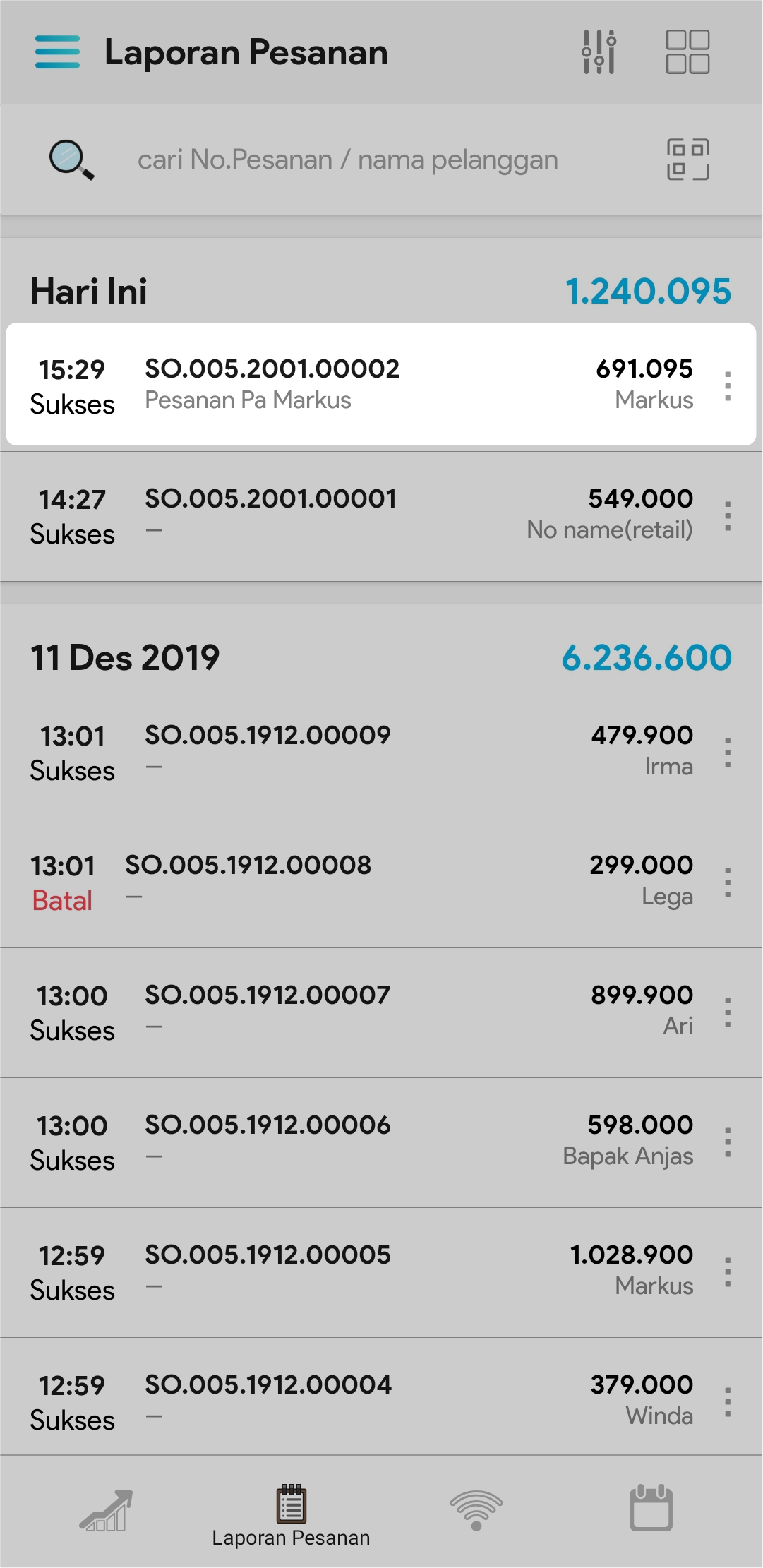 2. Masukkan nama pelanggan atau no pesanan pada kolom pencarian atau gunakan scanner barcode untuk mencari transaksi pesanan pelanggan tertentu
