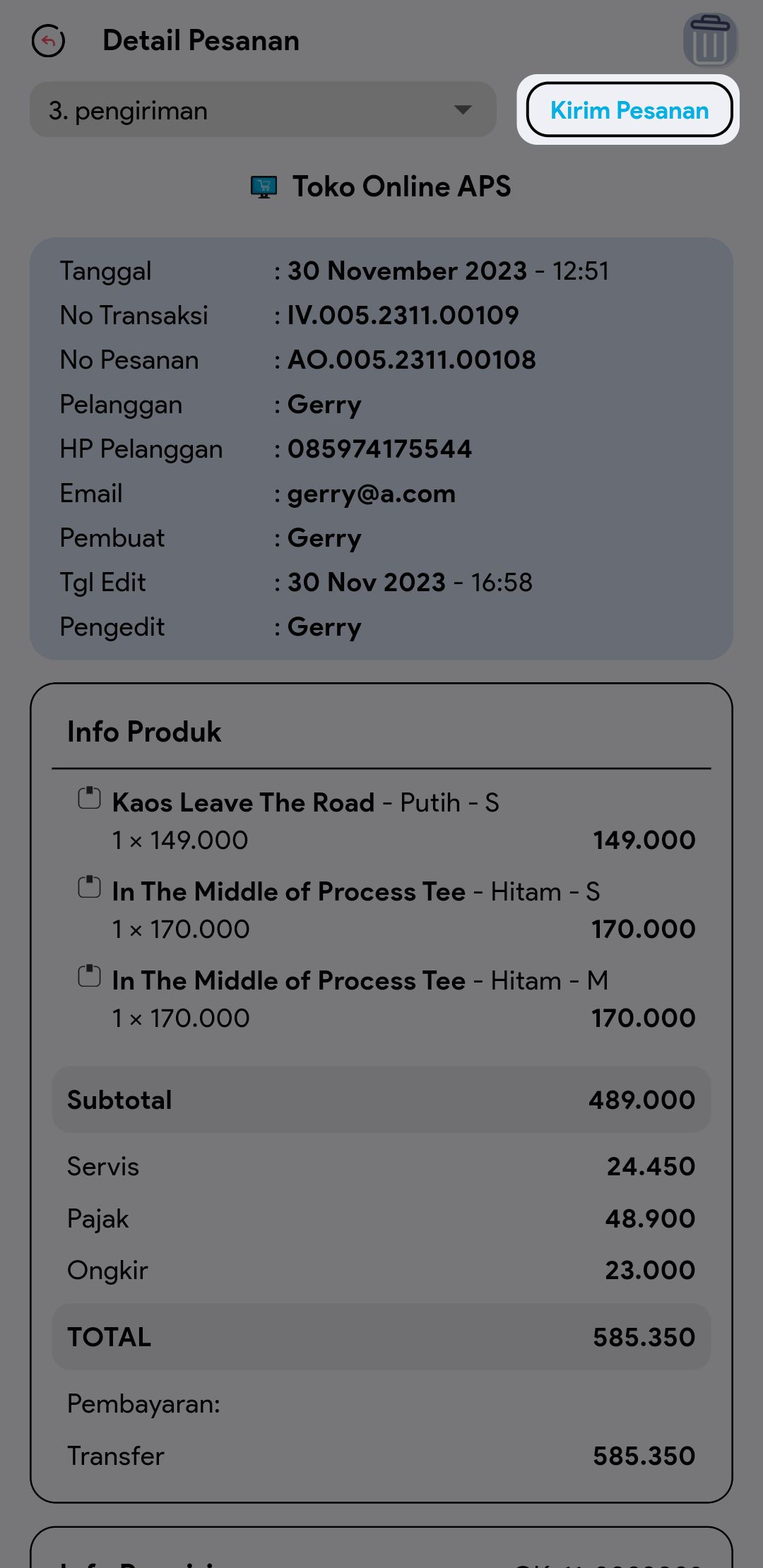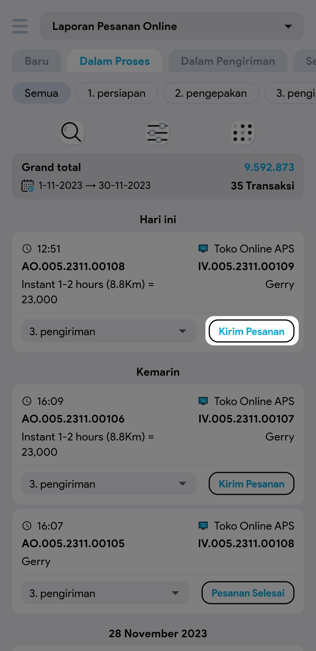 2. Pada tabulasi pesanan dalam proses klik button kirim pesanan di index atau pun di detail pesanan