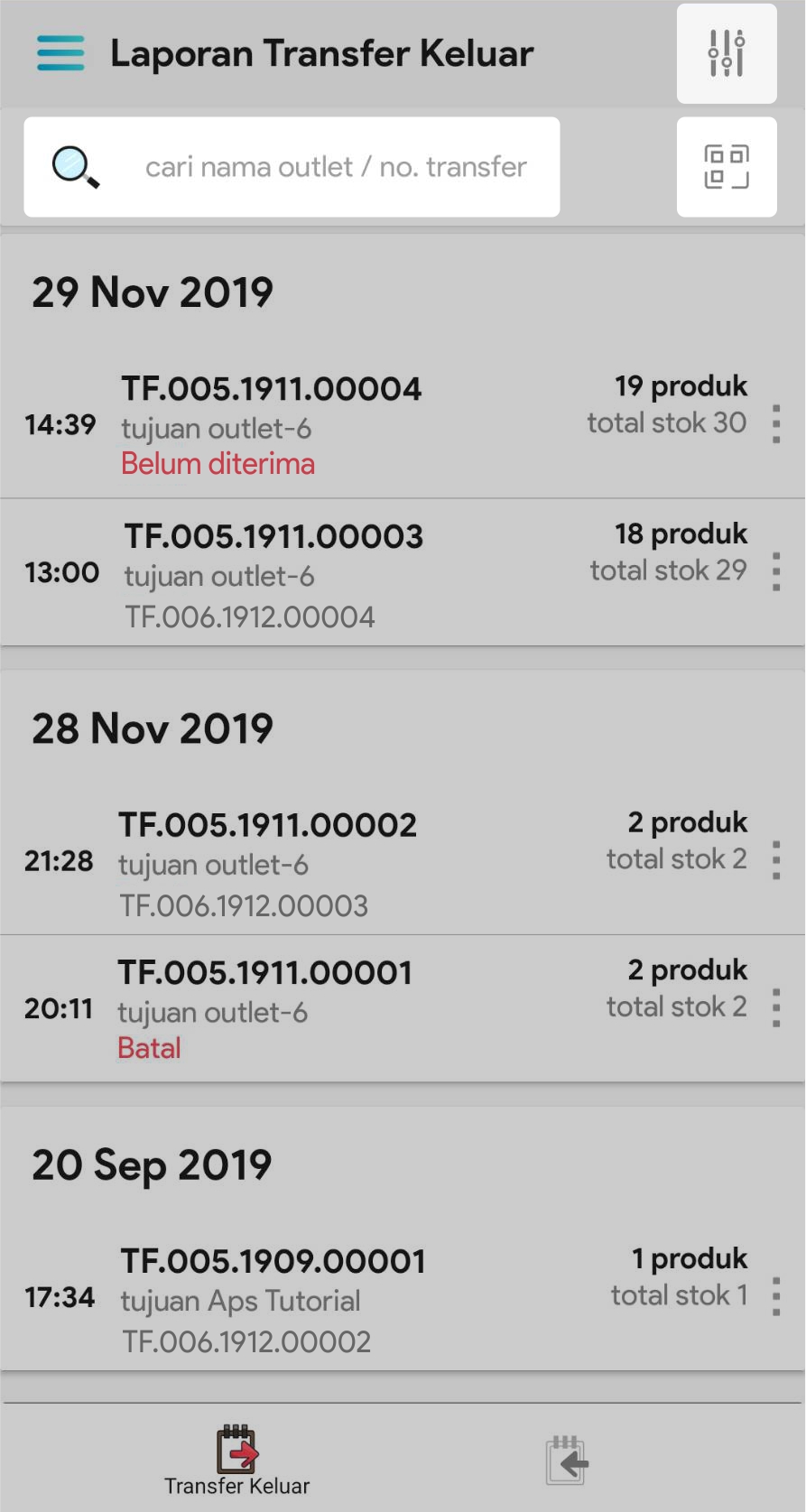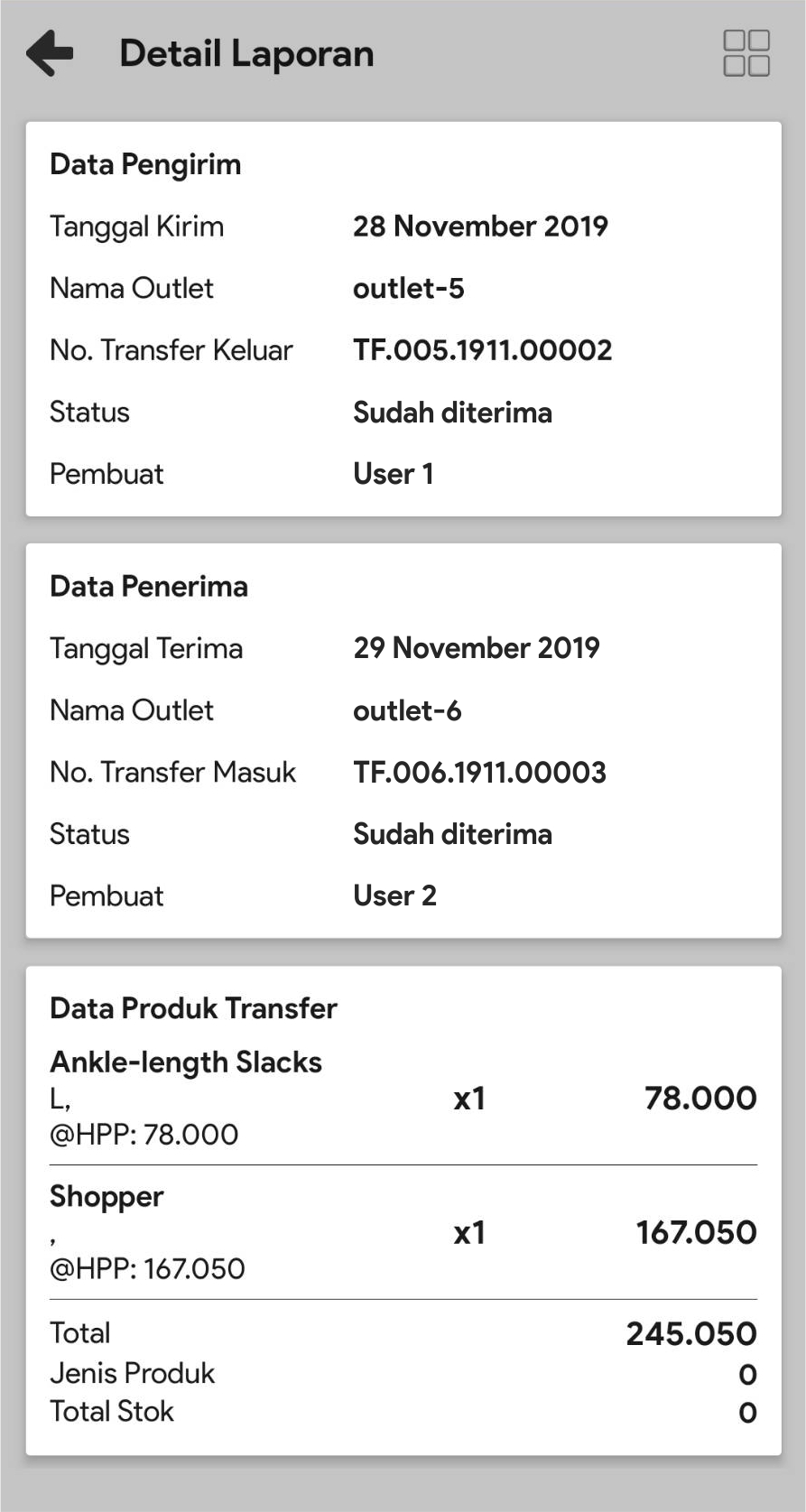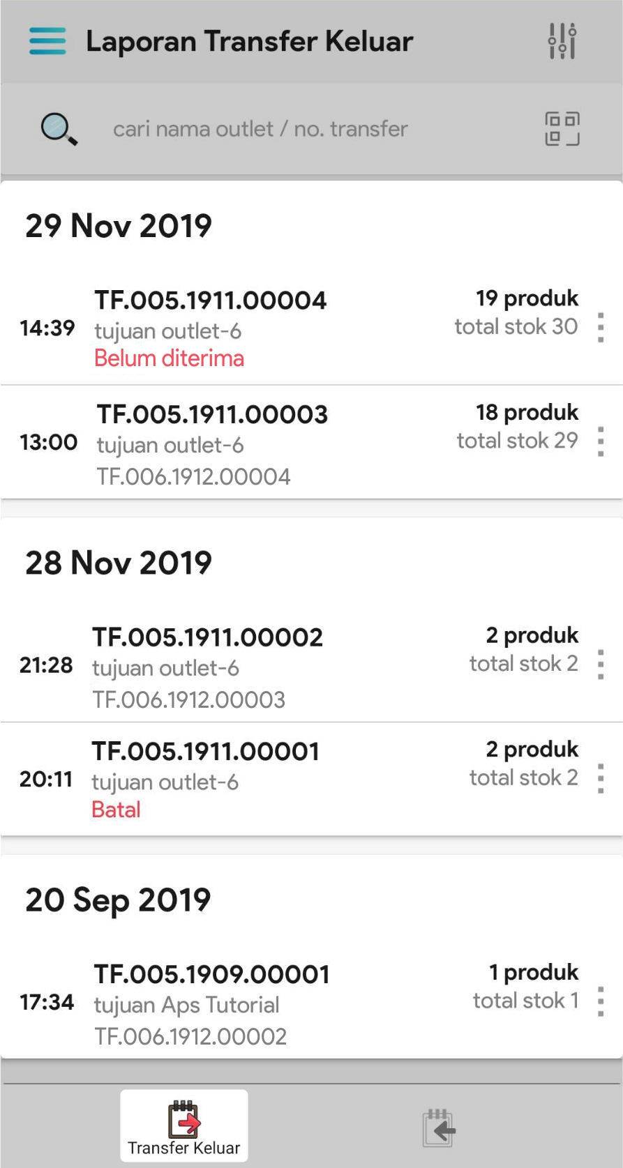 Data Pengirim : tanggal kirim, outlet pengirim, no transfer keluar, status dan pembuat transfer keluar