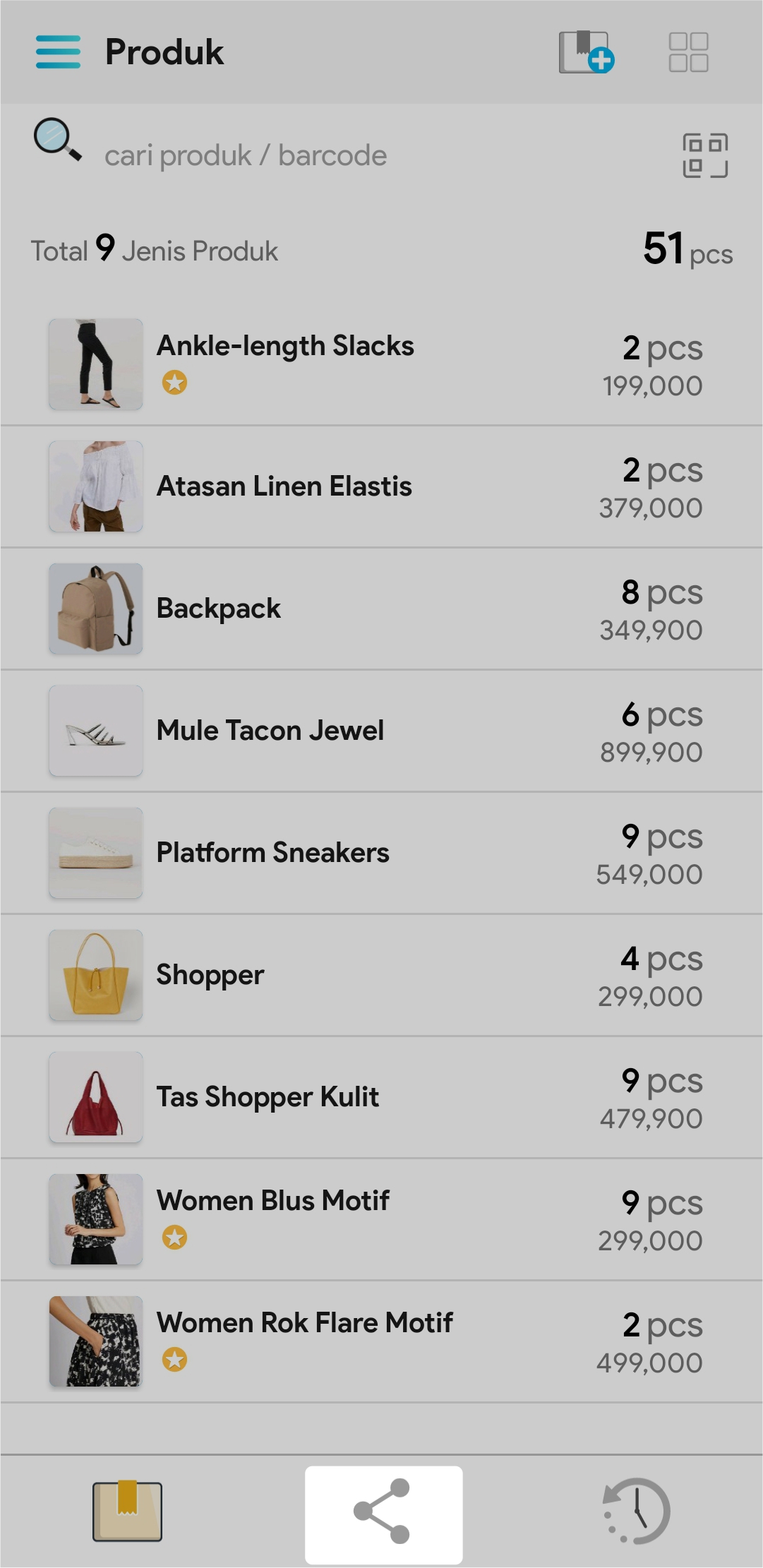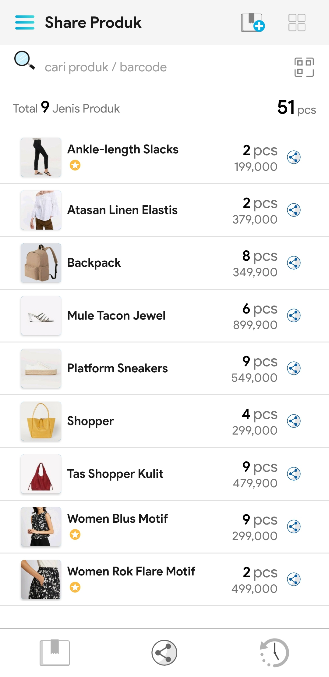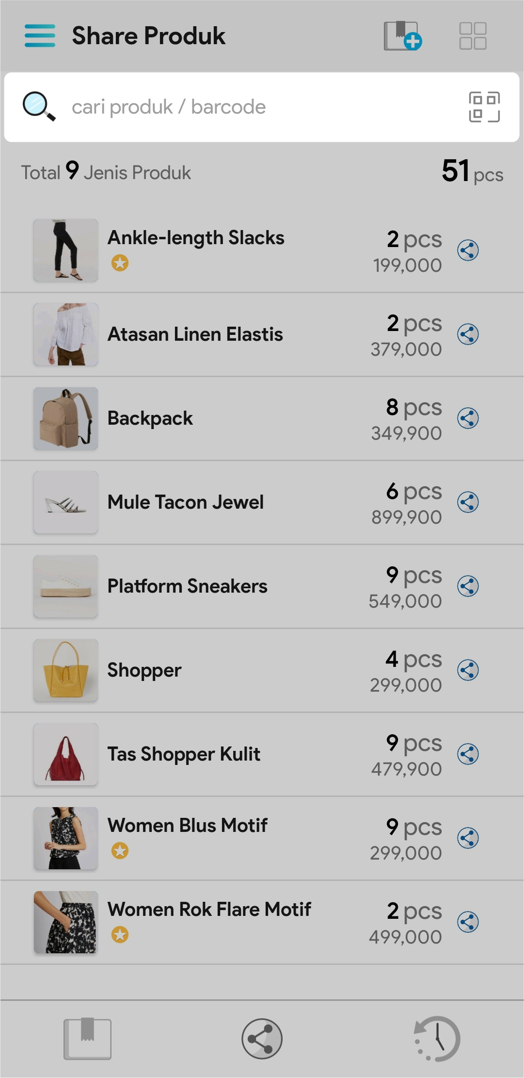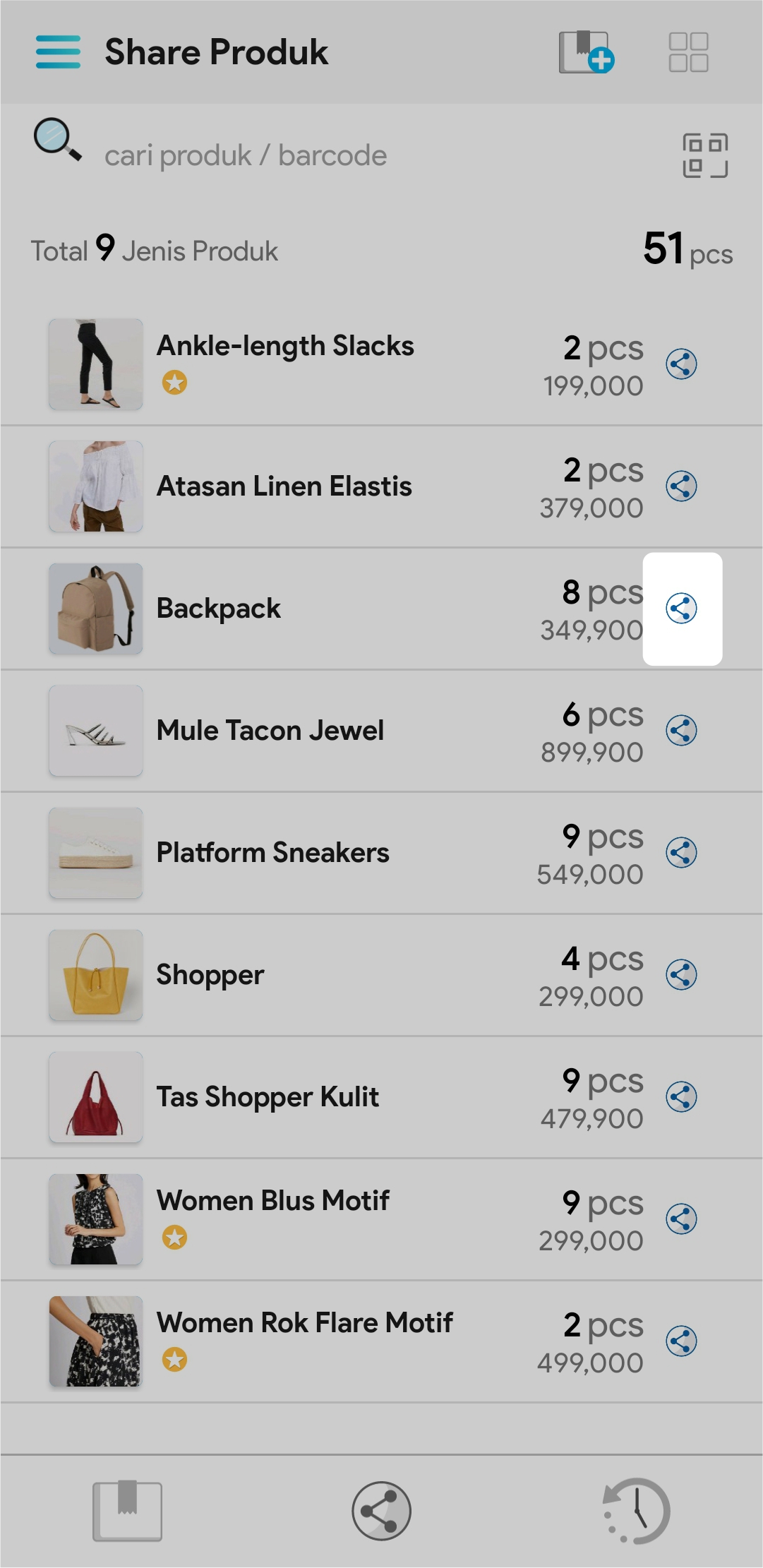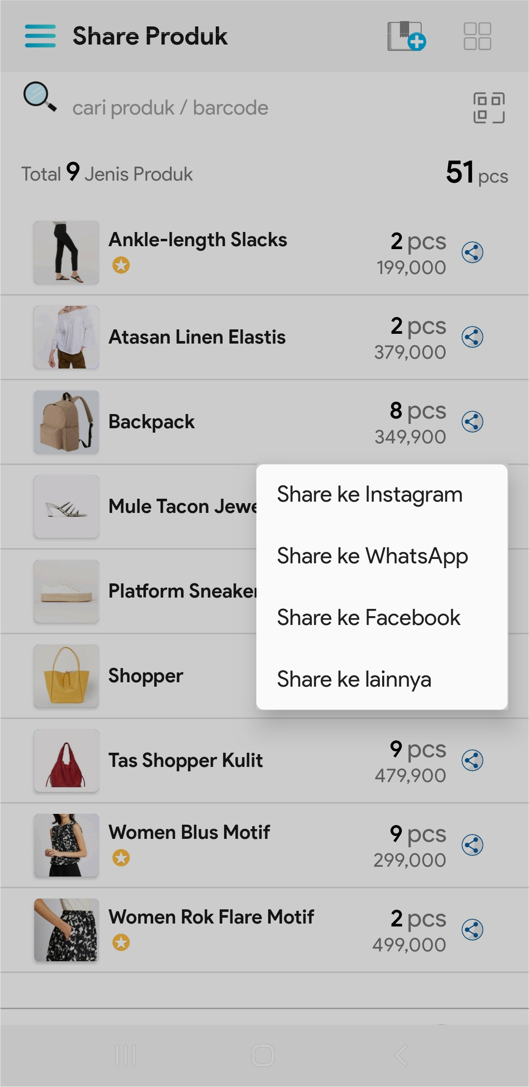 3. Cari nama produk atau barcode produk yang akan di share pada kolom pencarian