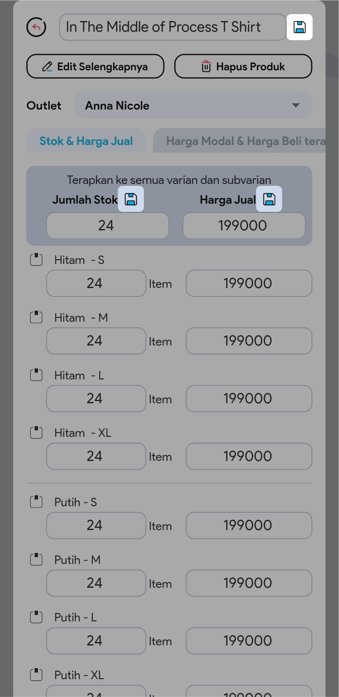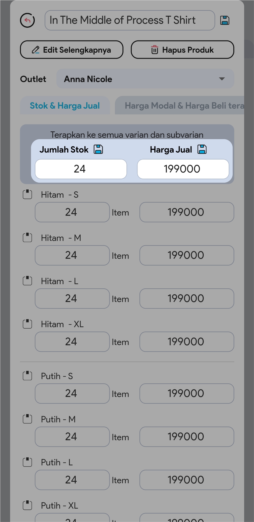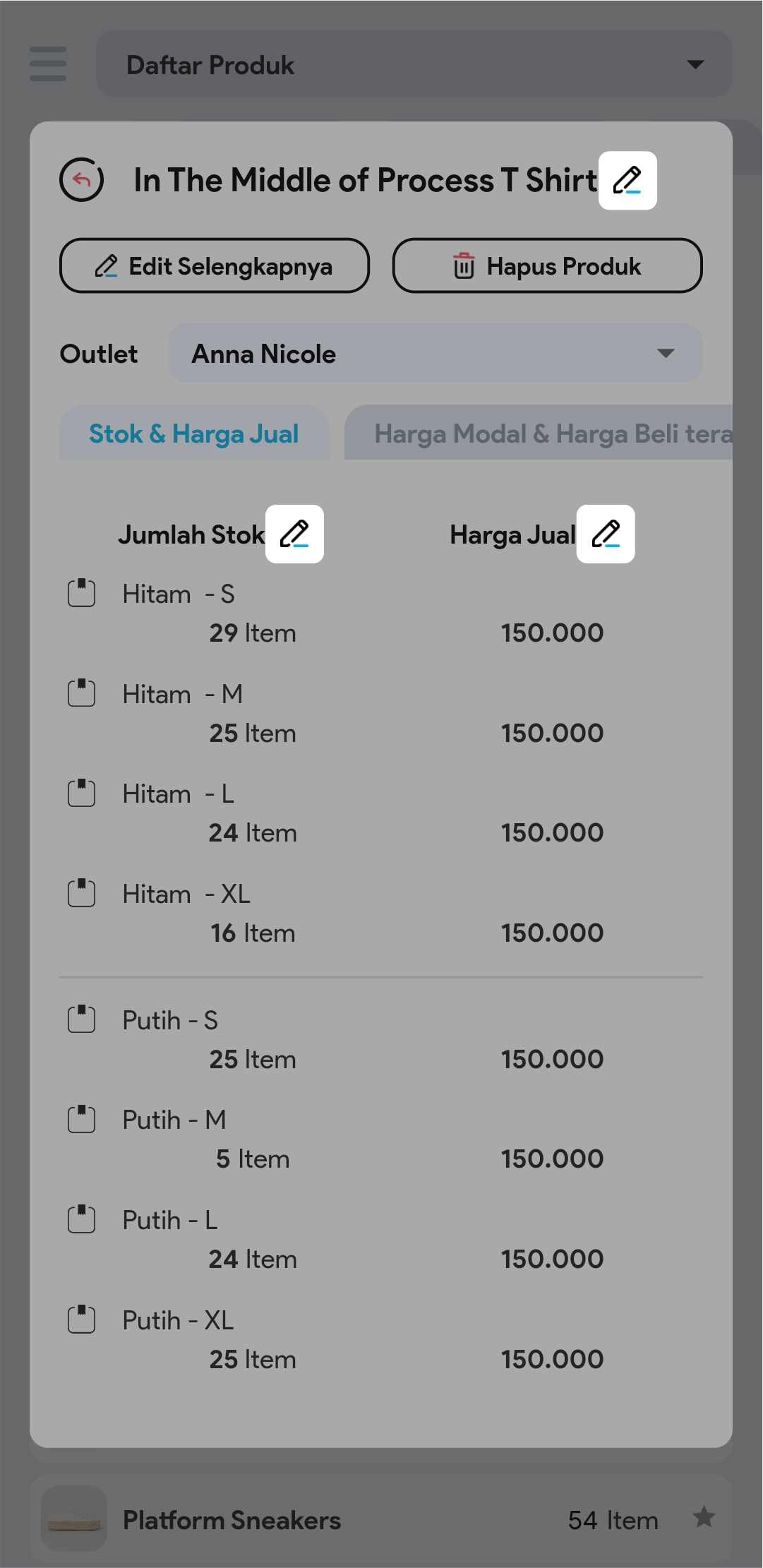 4.  Edit Nama Produk / Jumlah Stok / Harga Jual dengan meng-klik Icon Edit pada bagian yang ingin Anda ubah