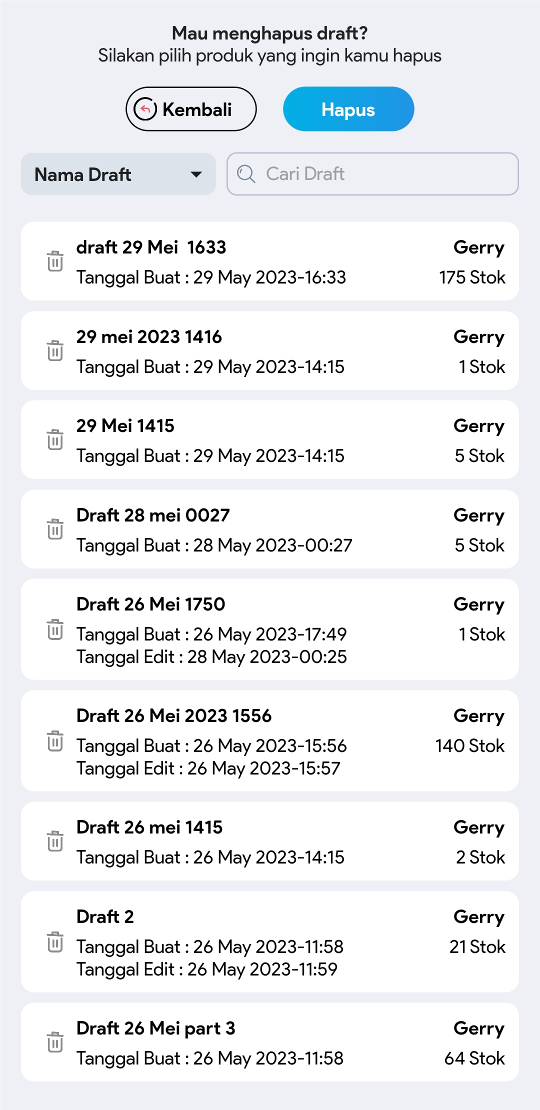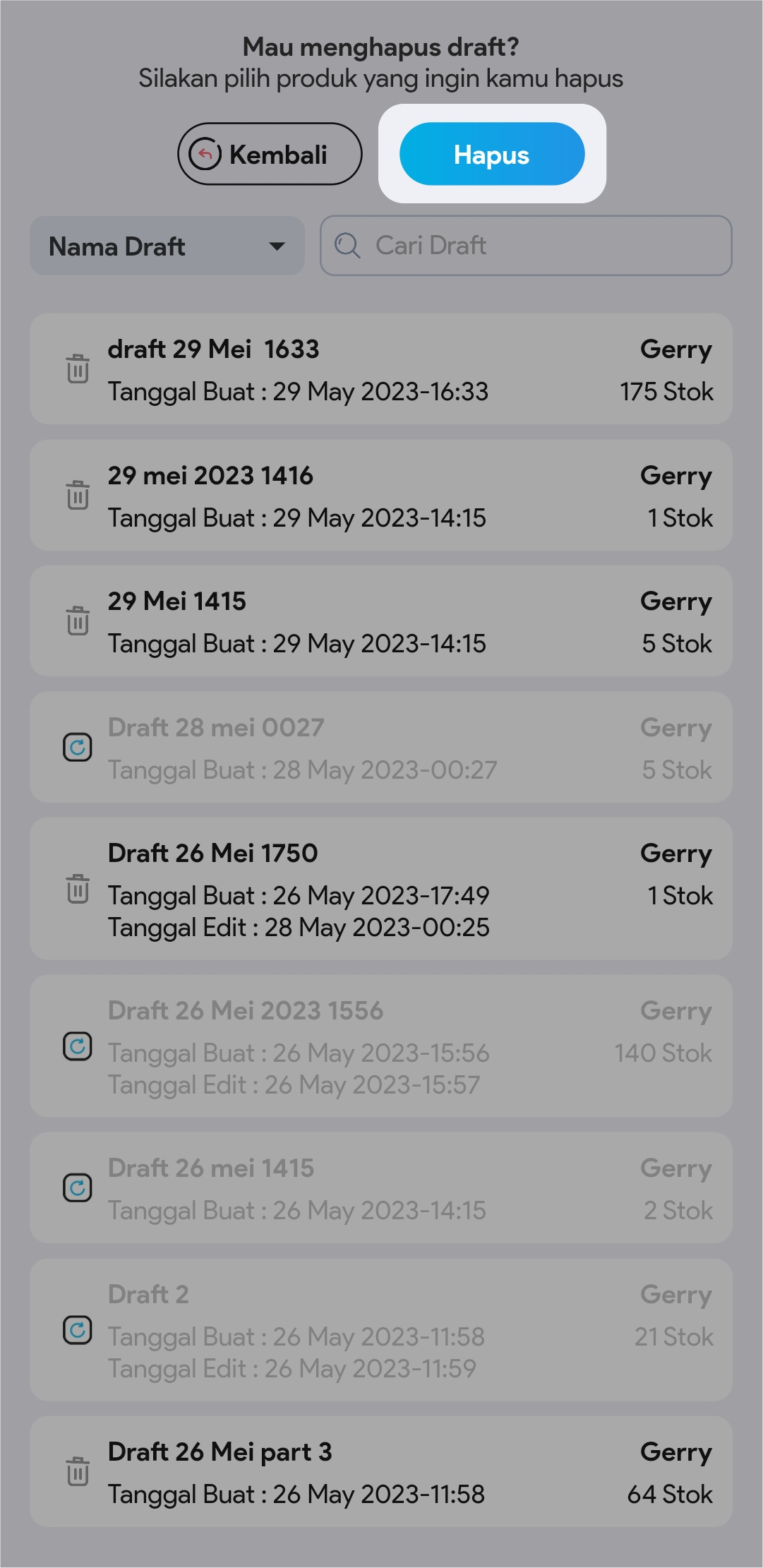 5. Pilih draft yang dingin dihapus dengan mengklik icon tempat sampah. Anda bisa menggunakan pencarian draft / nama pembuat draft, untuk memudahkan pencarian