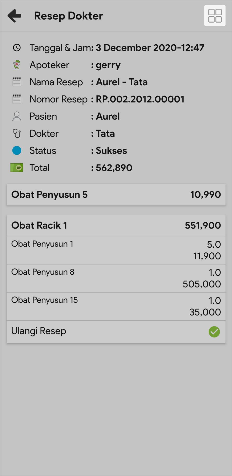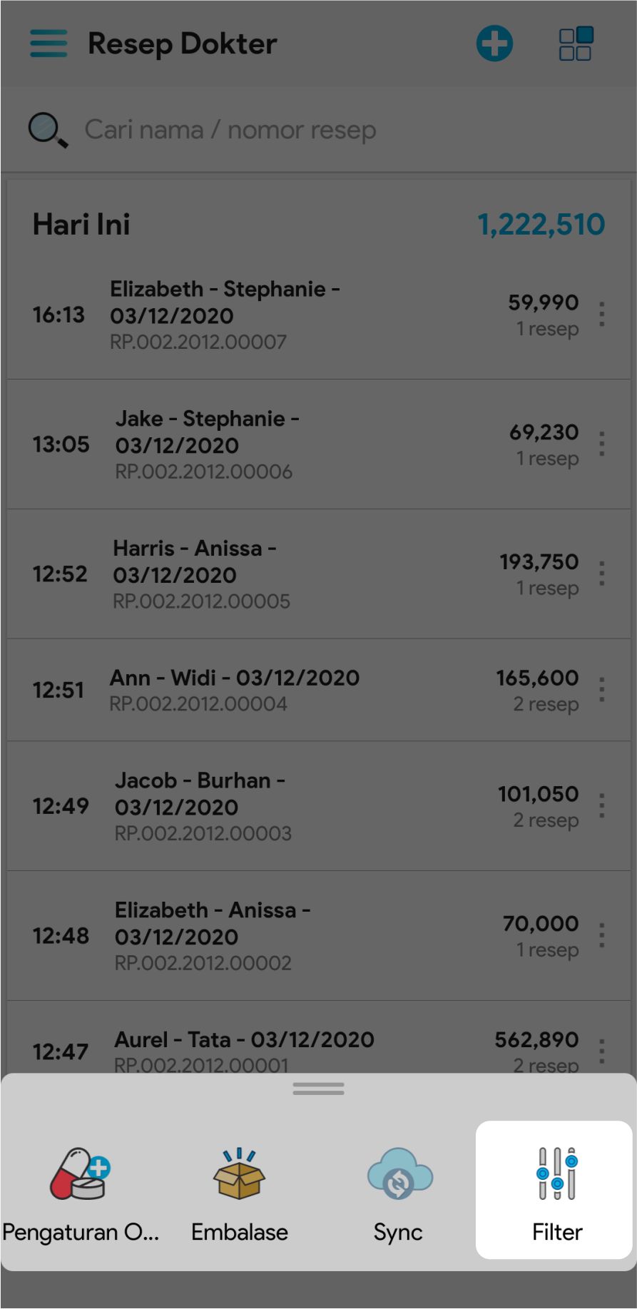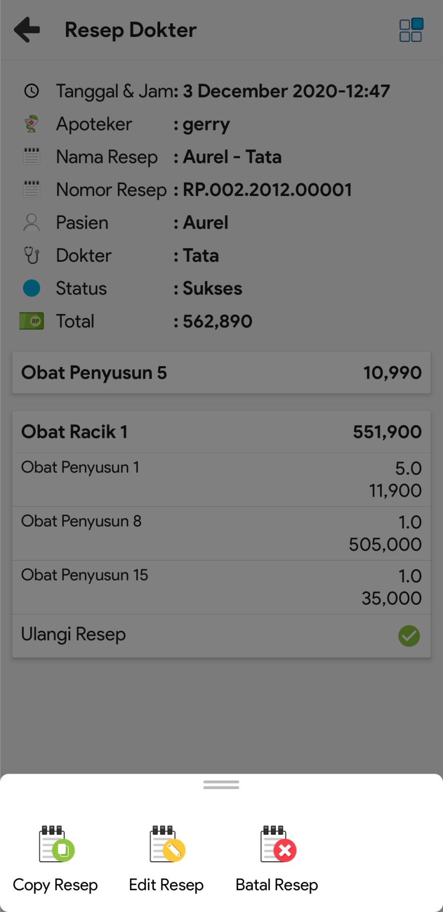 6. Untuk mencopy resep, mengedit resep ataupun membatalkan resep, klik icon More dan pilih icon sesuai fungsi yang ingin Anda lakukan.