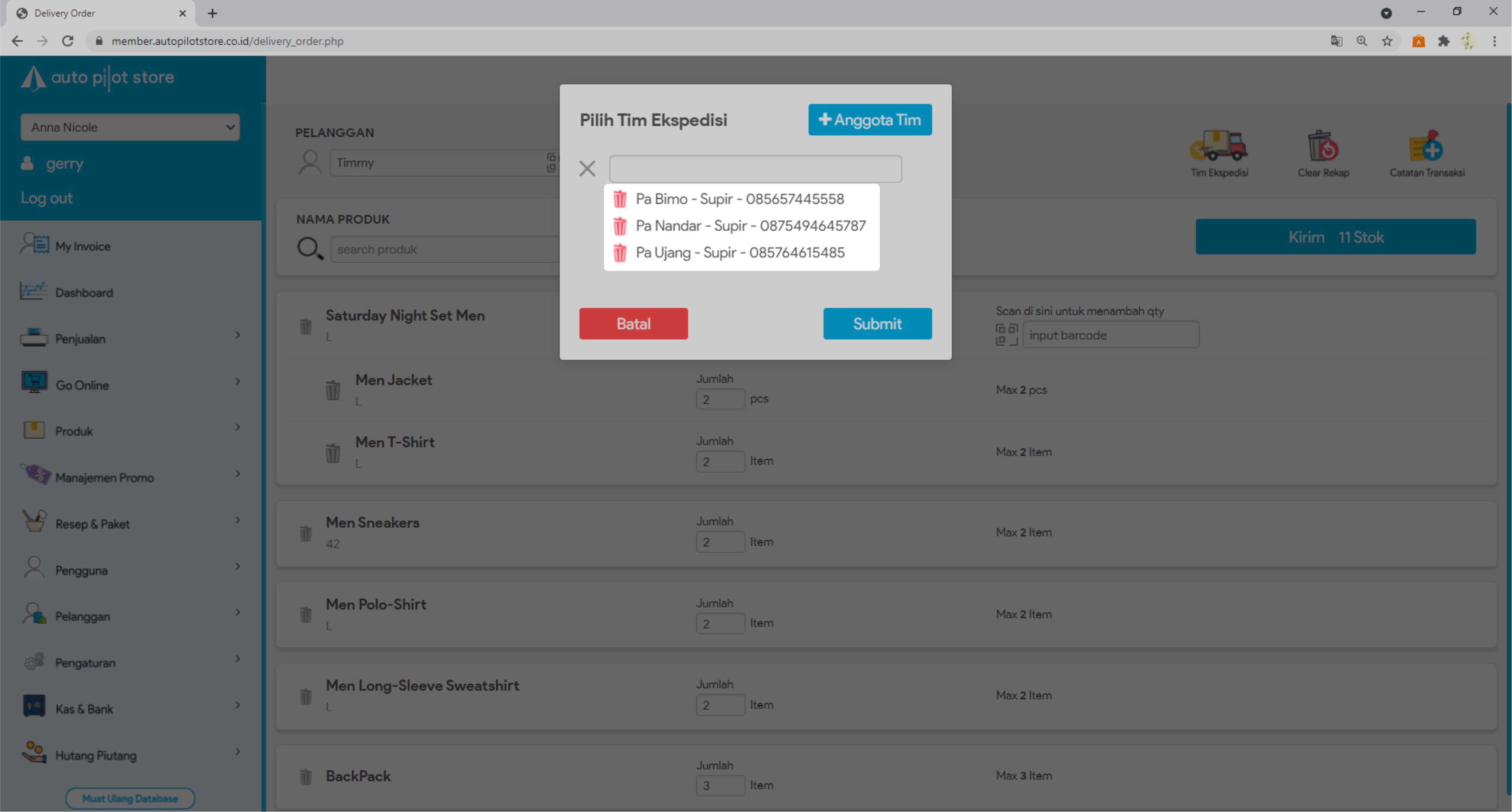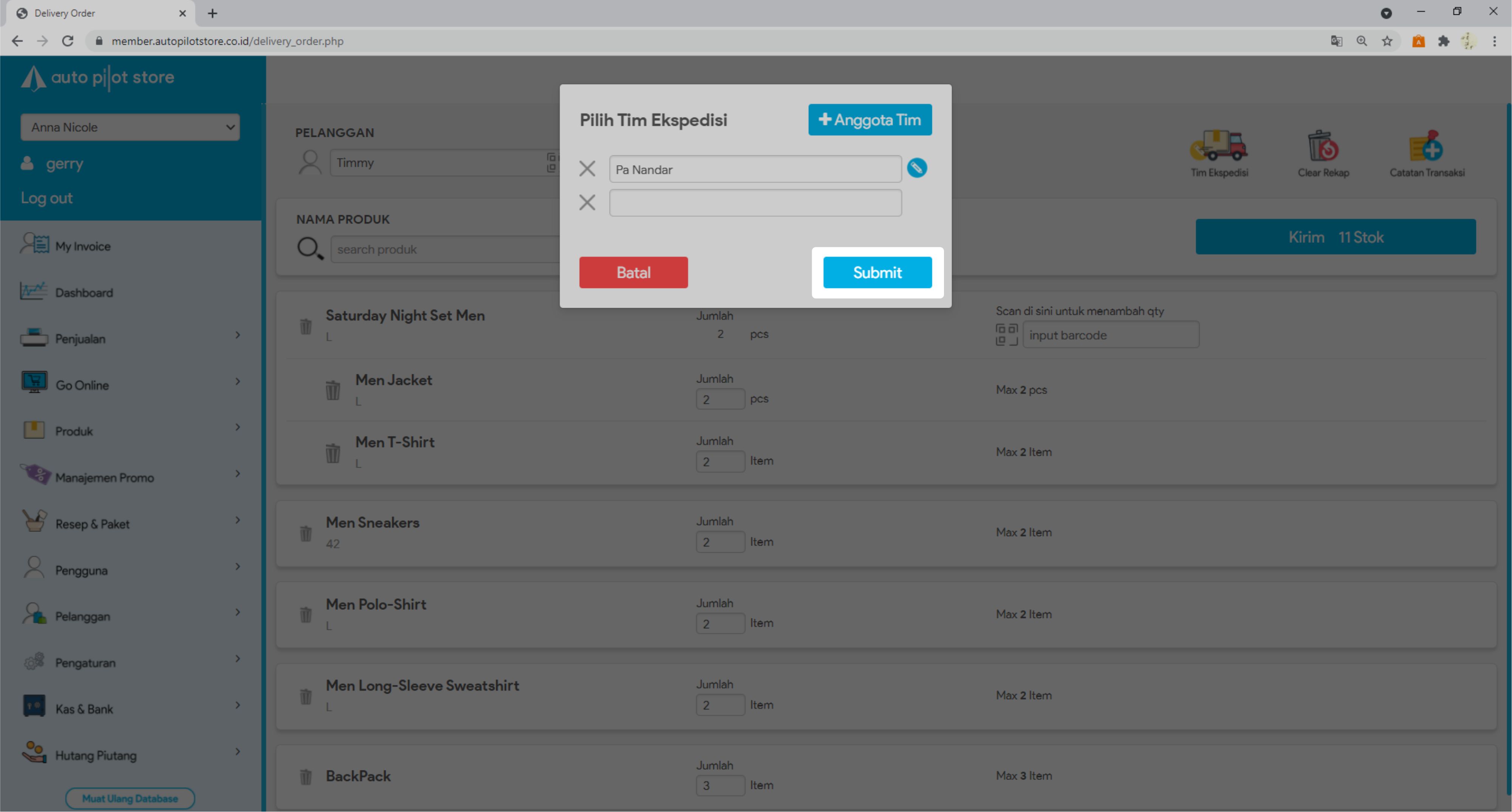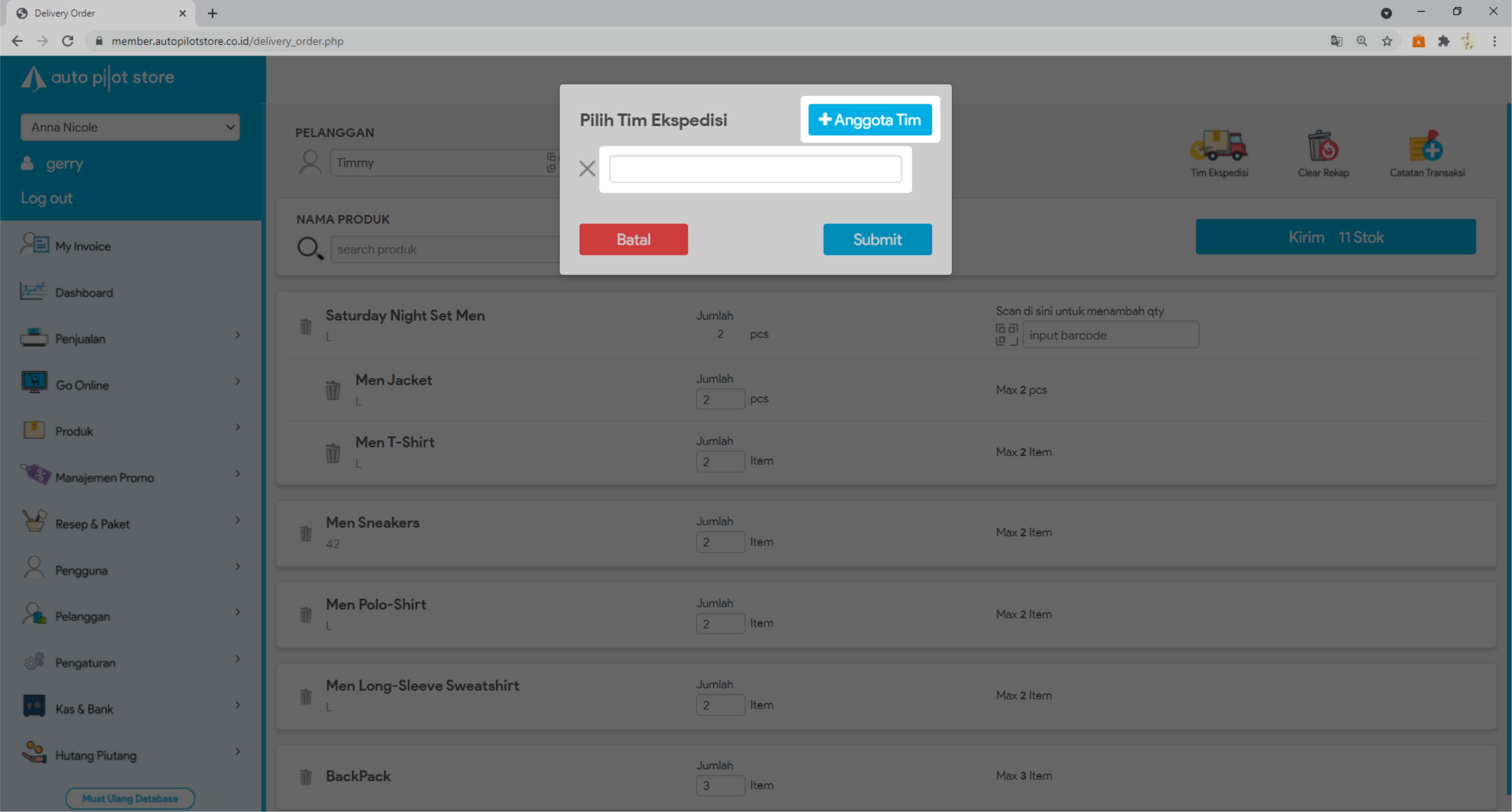 10. Anda bisa menambah data tim ekspedisi yang akan melakukan pengiriman barang dengan mengklik icon Tim Ekspedisi