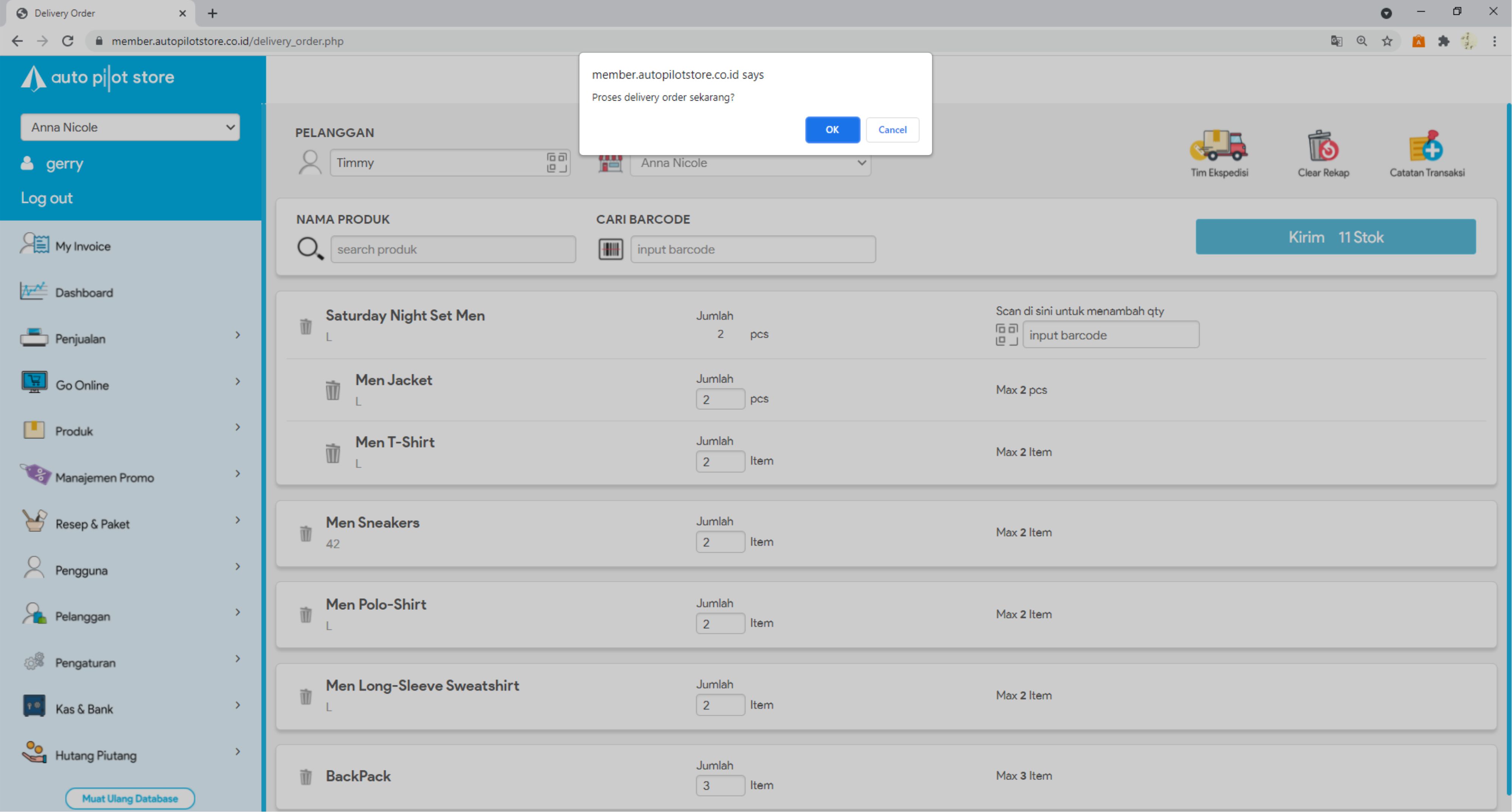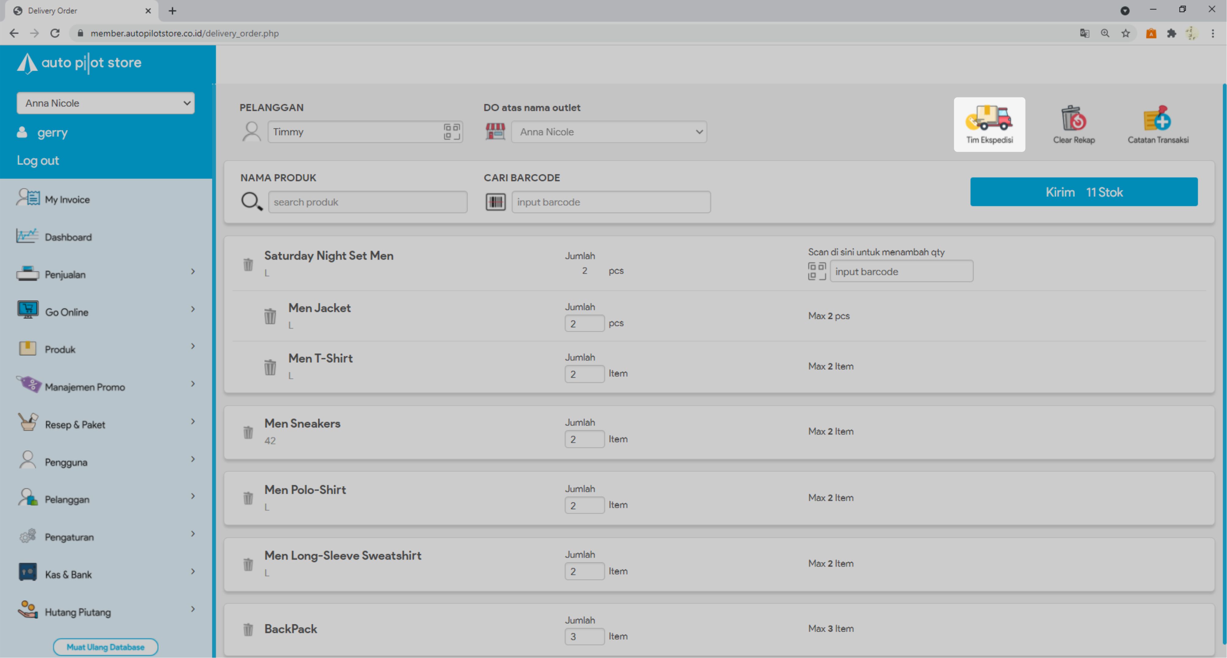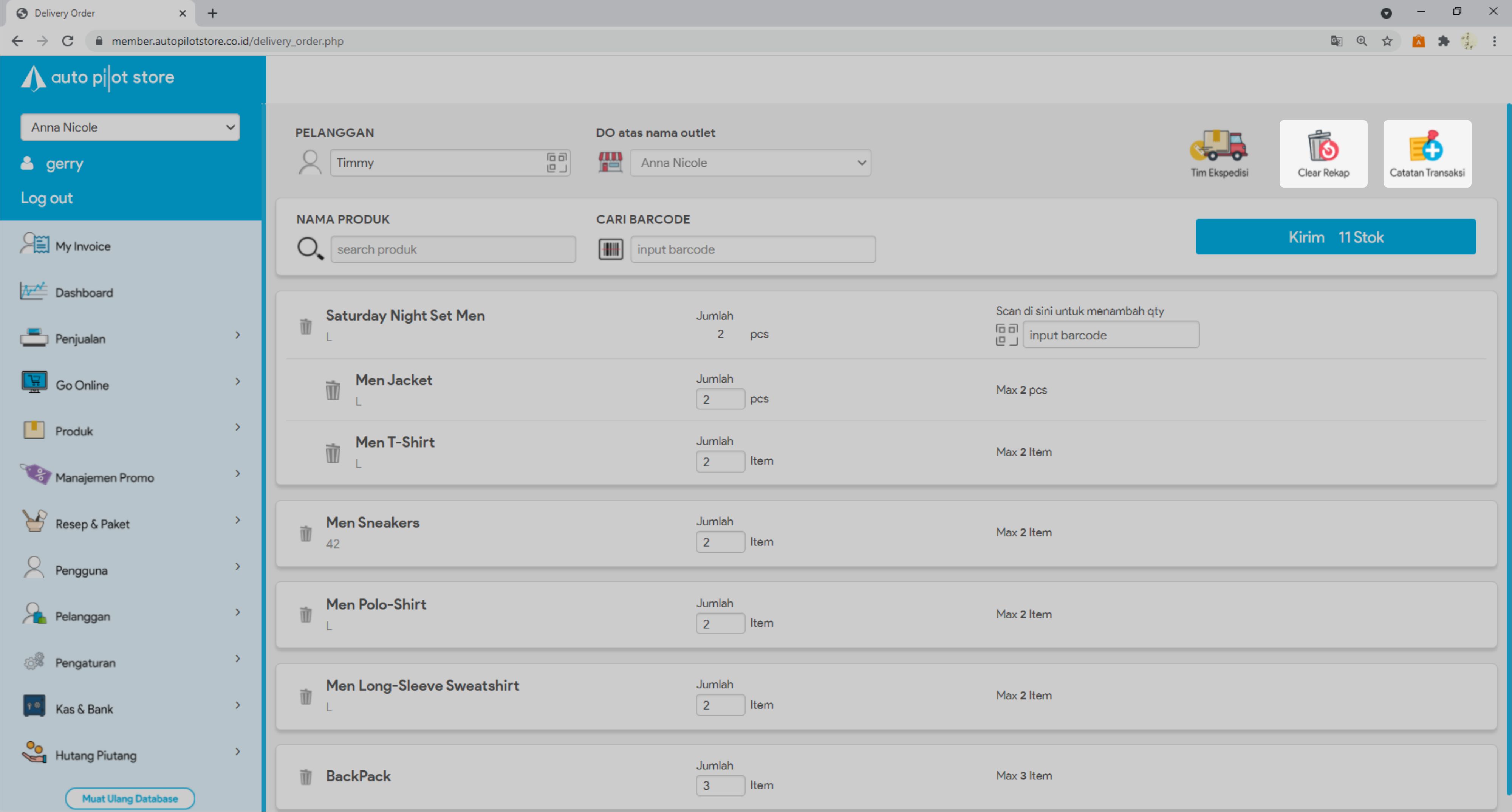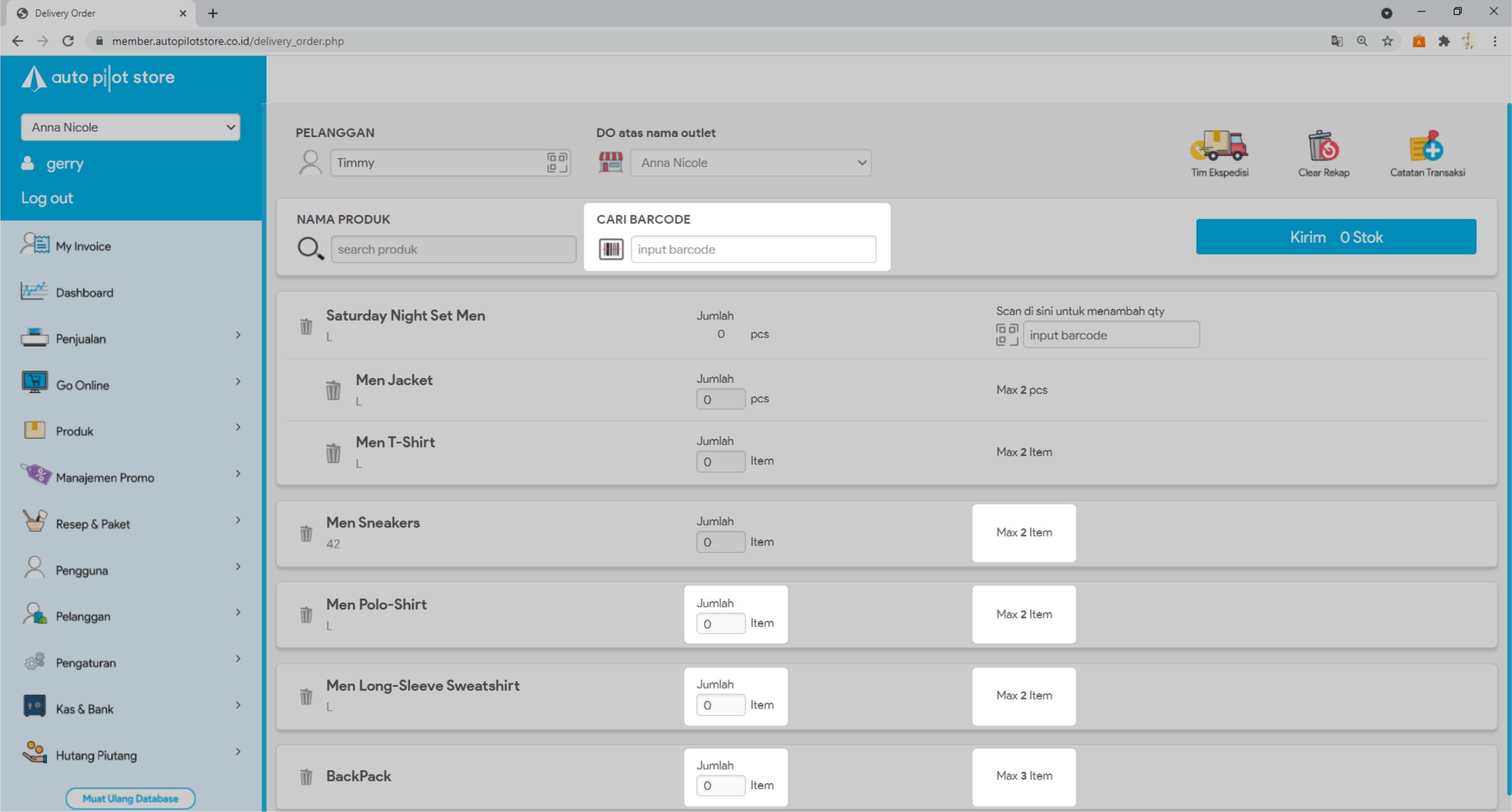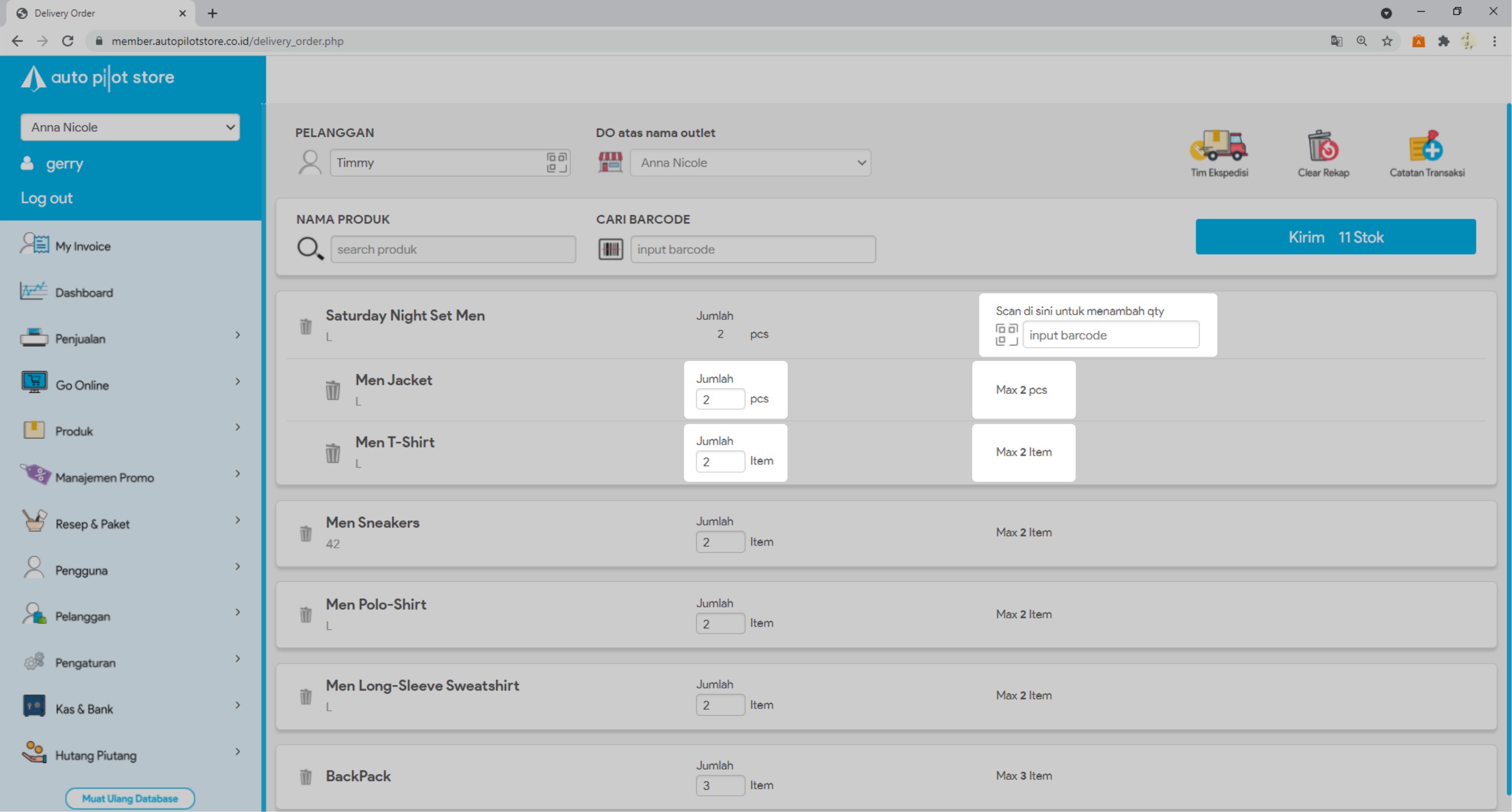 8. Masukkan jumlah stok yang akan dikirim atau scan barcode produk untuk menambah stok yang akan dikirim.