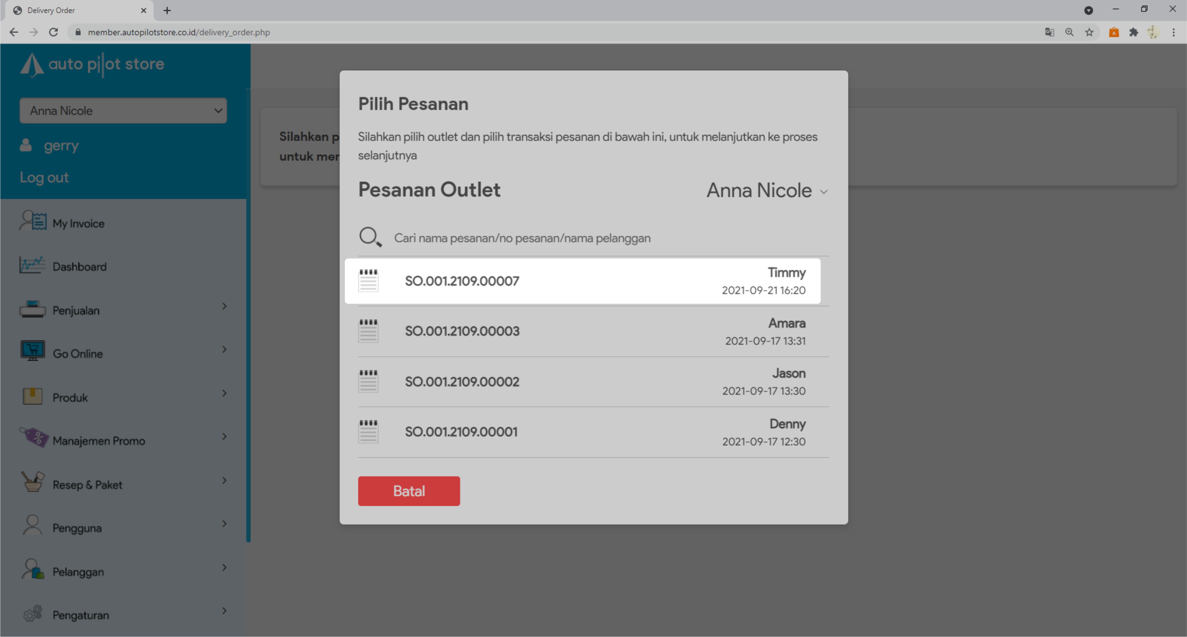 7. Pilih pesanan yang akan dibuat delivery ordernya