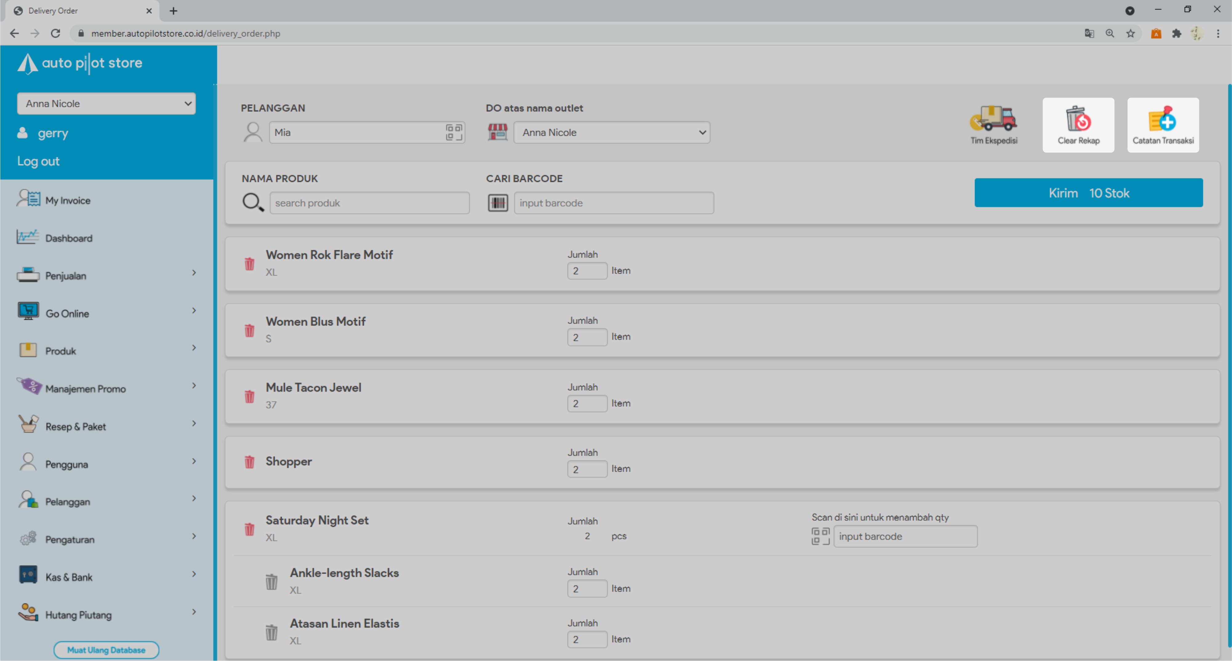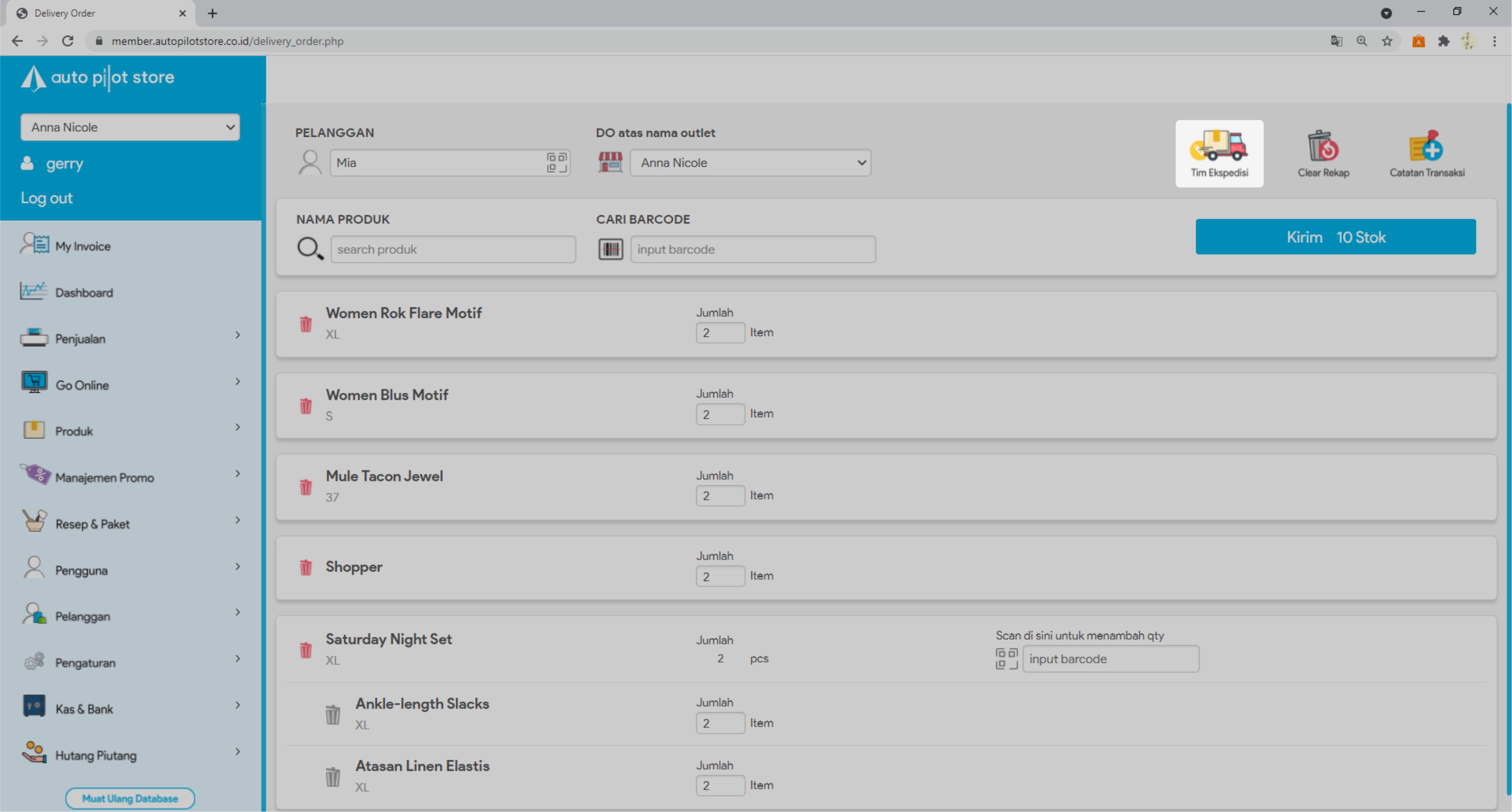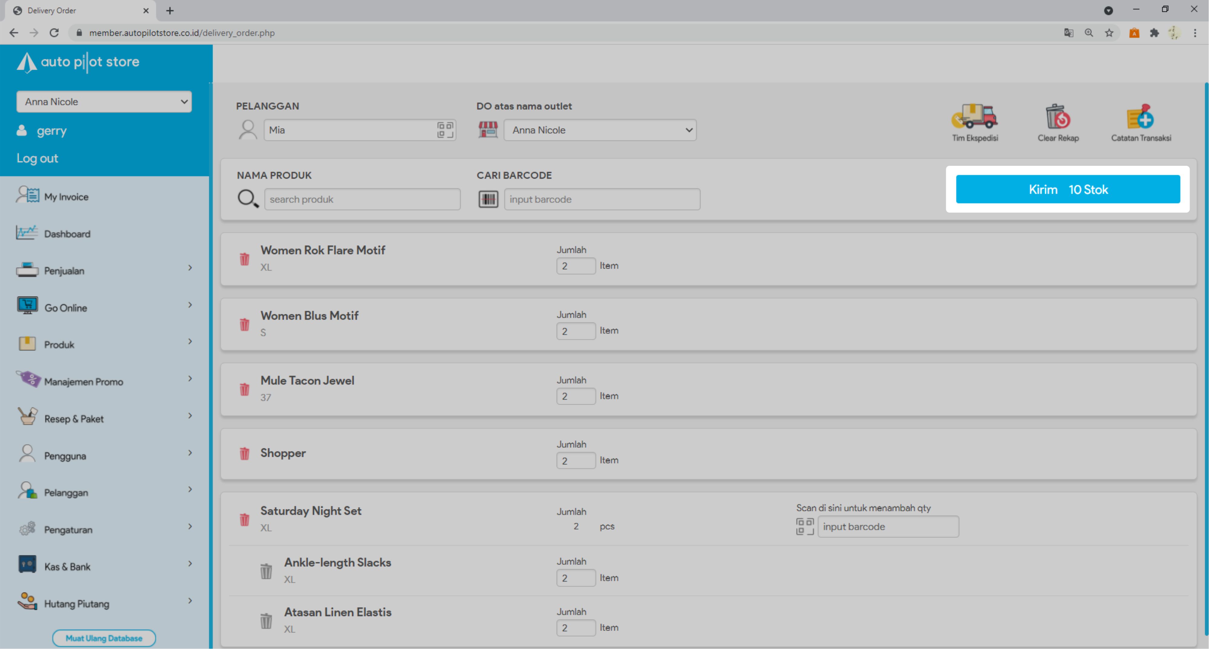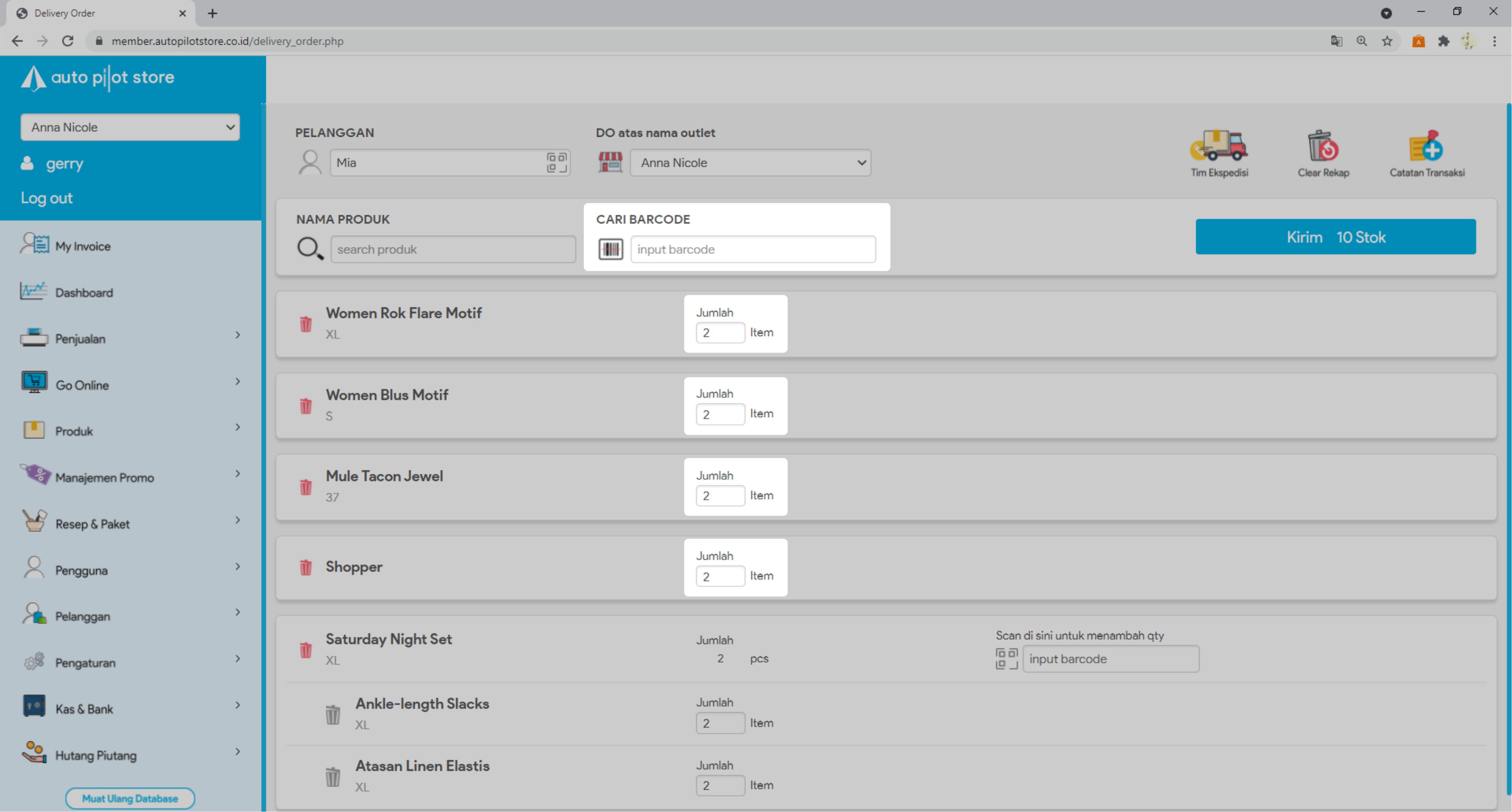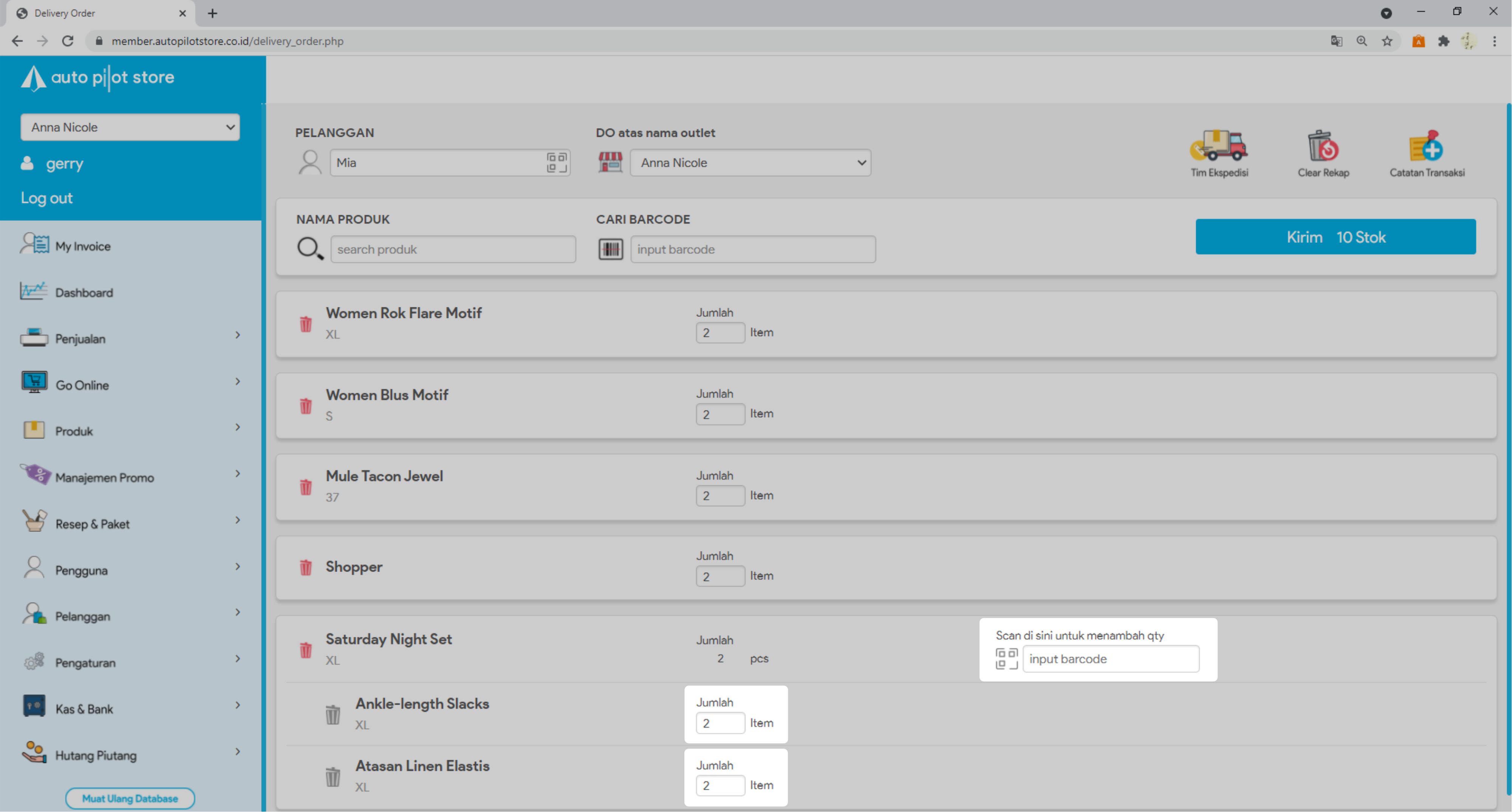 8. Masukkan jumlah stok yang akan dikirim atau scan barcode produk untuk menambah jumlah stok yang akan dikirim.