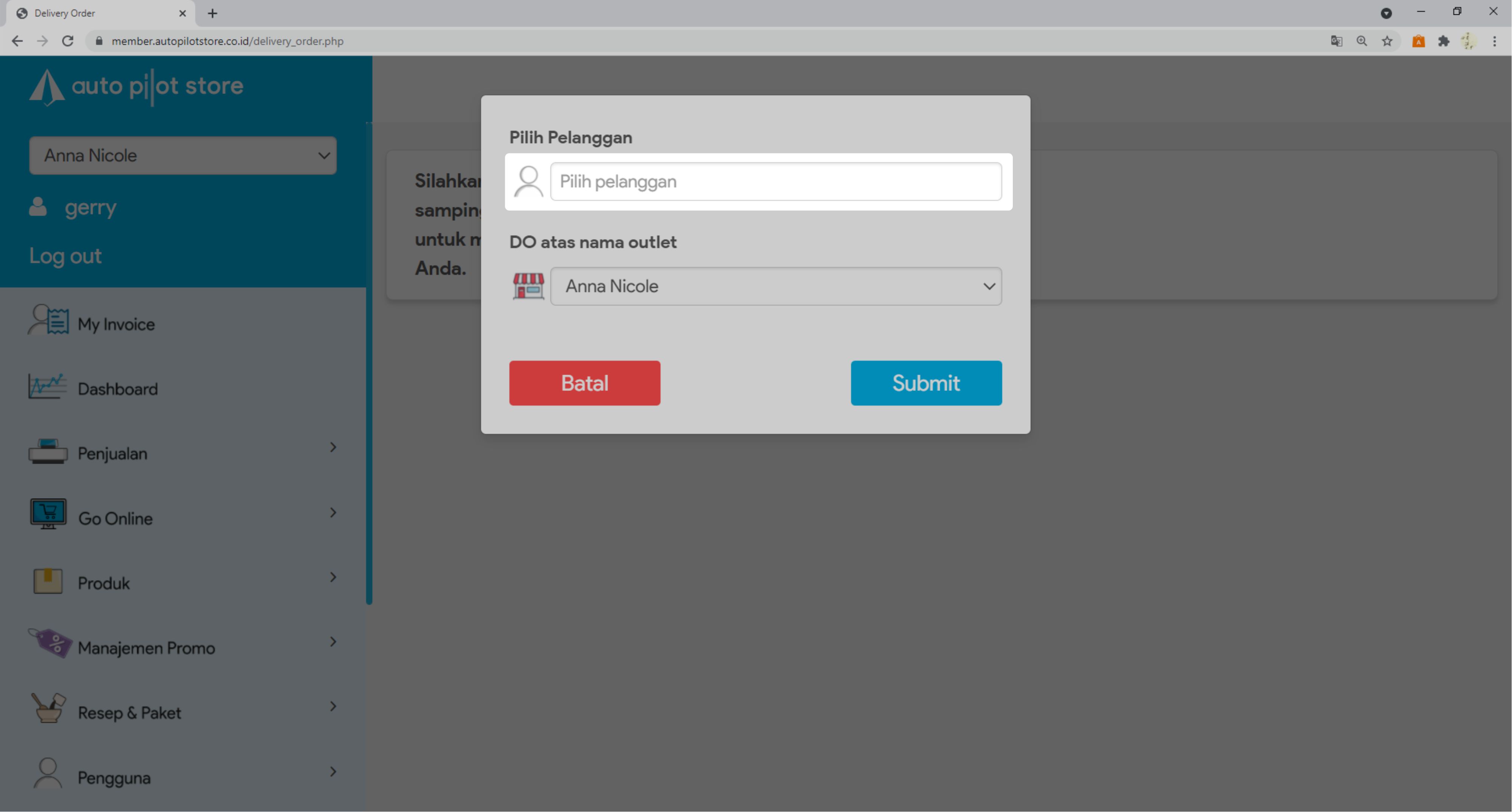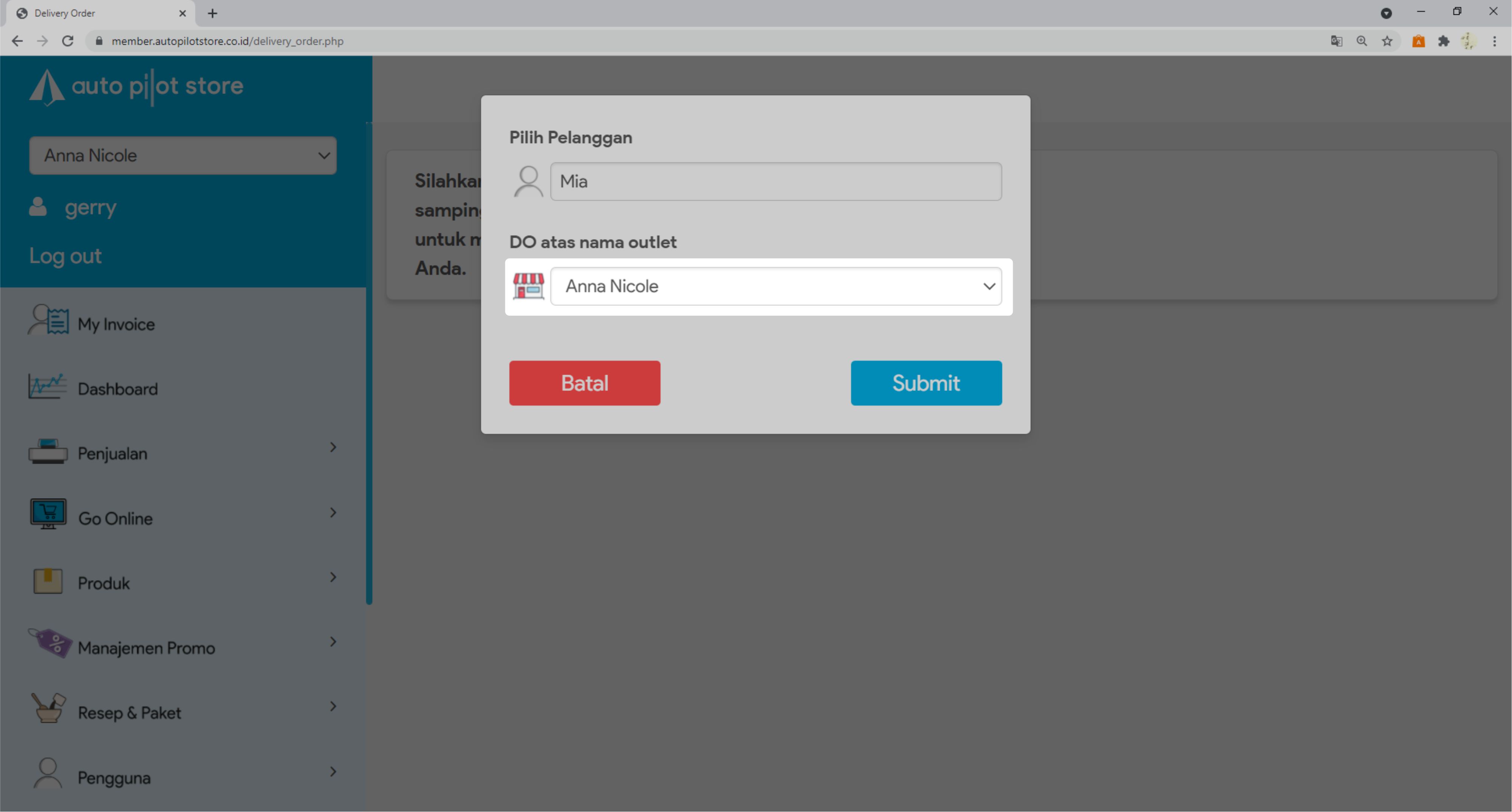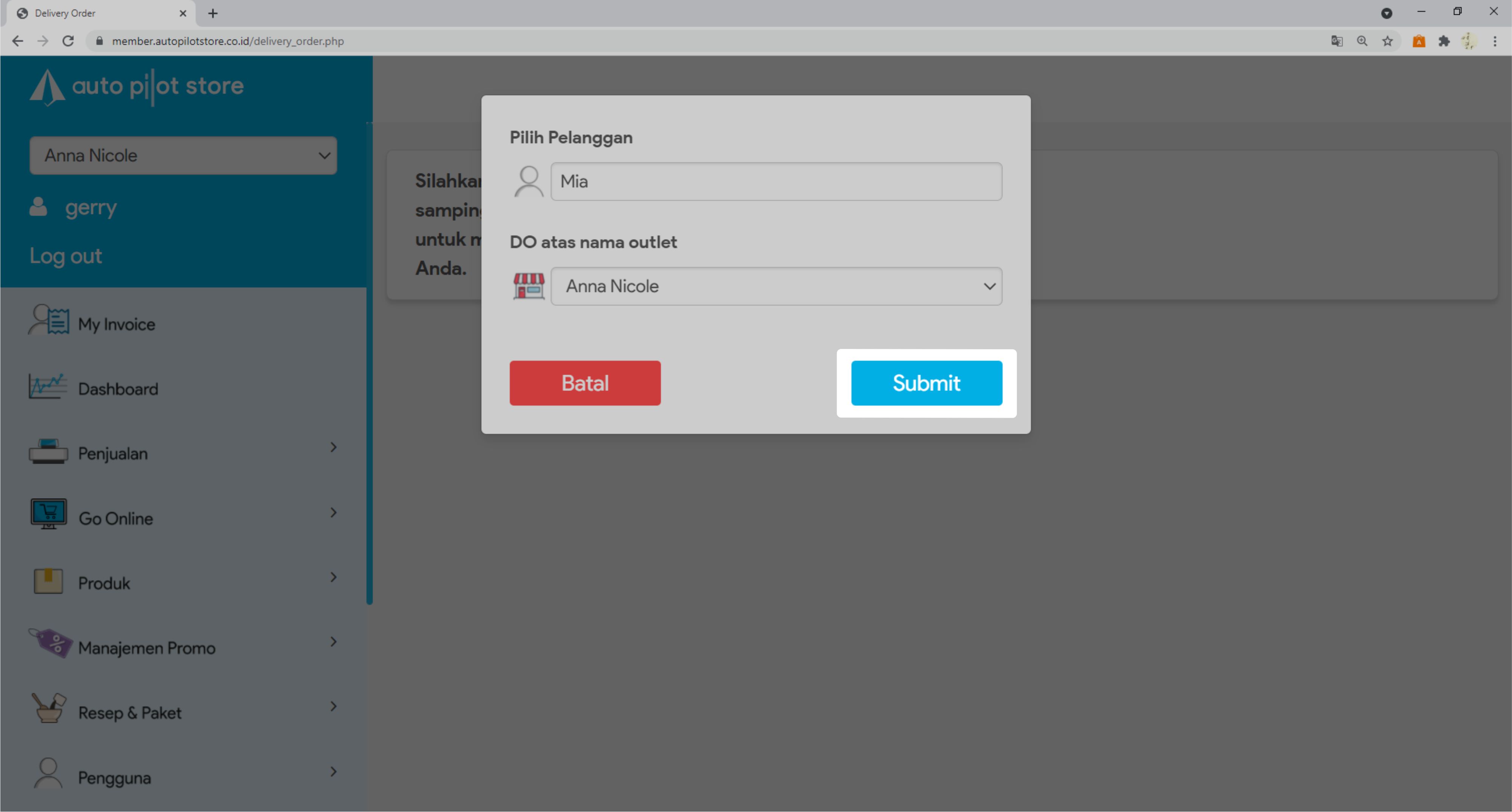 6. Pilih Outlet Tujuan delivery order dibuat, lalu klik Submit