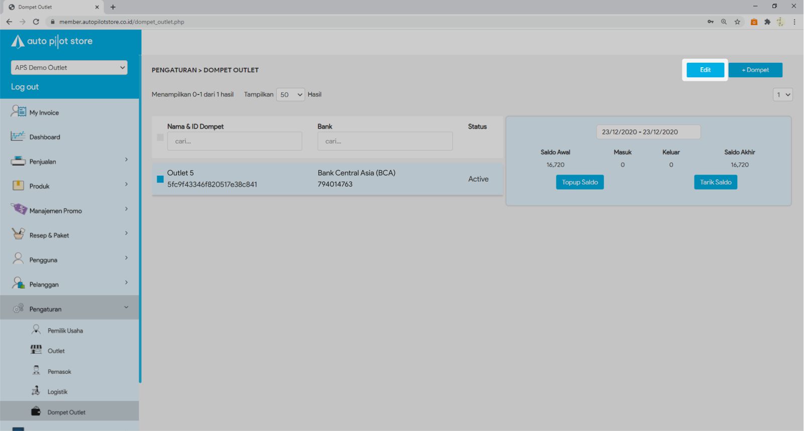 10. Status Dompet Outlet menjadi Active dan sudah dapat digunakan