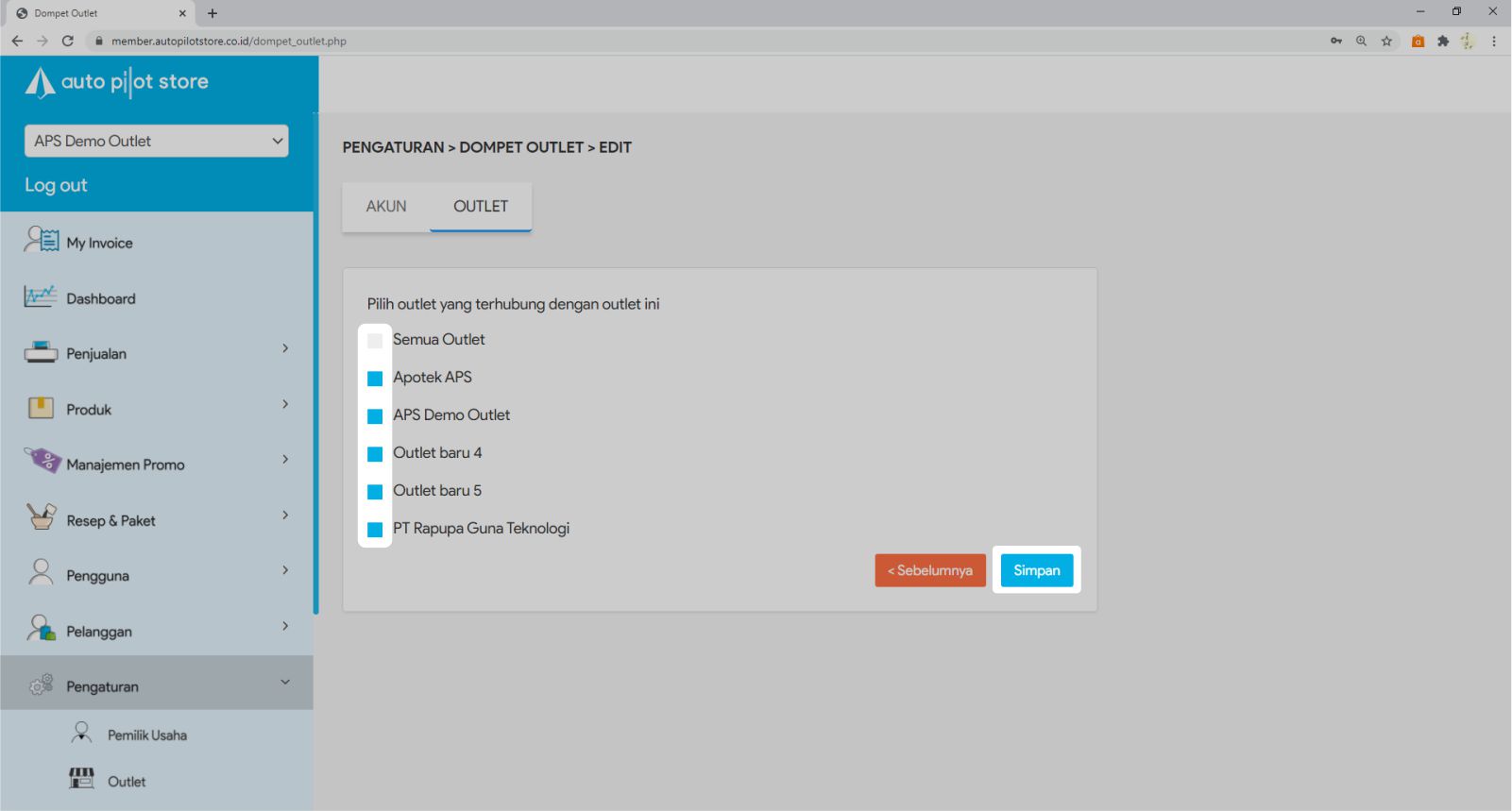 7. Pada Tabulasi Outlet, beri tanda di depan outlet yang terhubung dengan Dompet Outlet atau pilih semua outlet