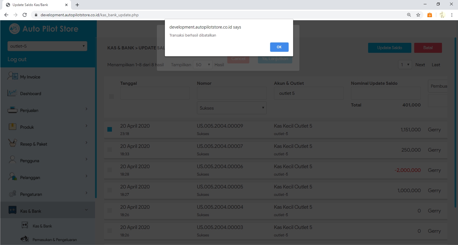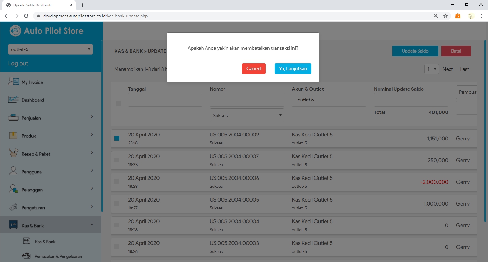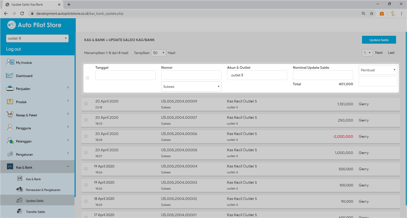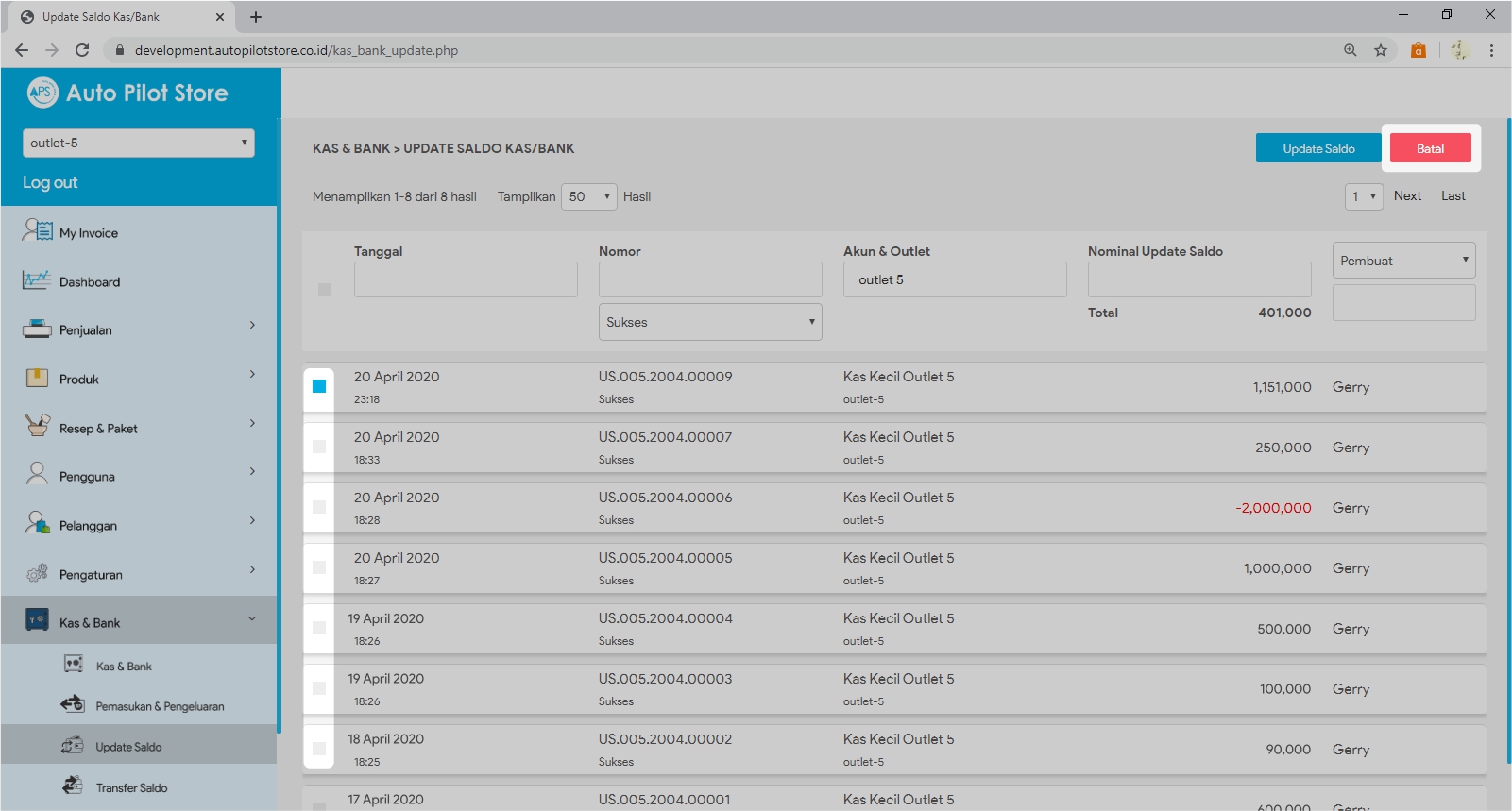 3. Cari transaksi update saldo yang ingin dibatalkan. Gunakan pembatasan tanggal, nomor, nama akun kas/bank atau nama outlet.