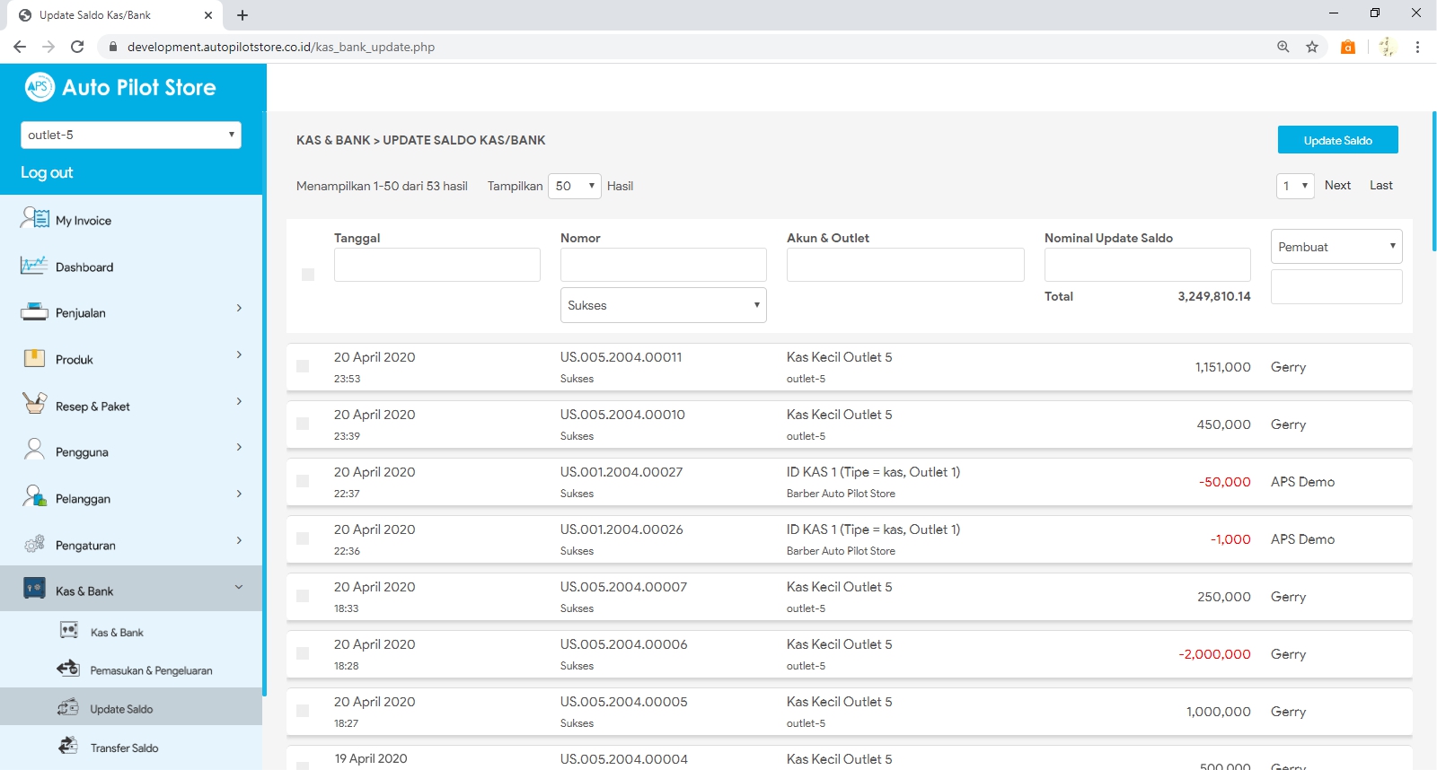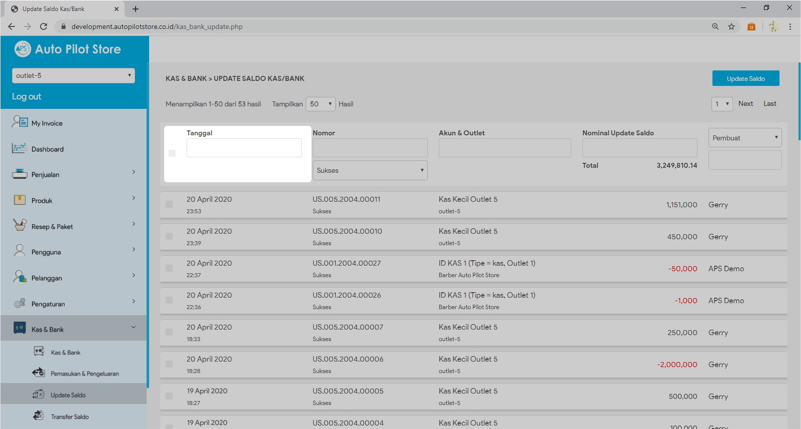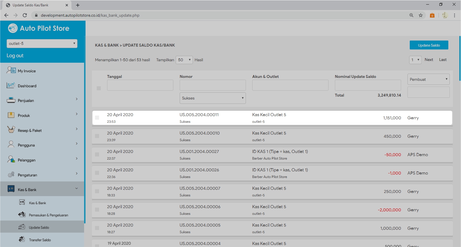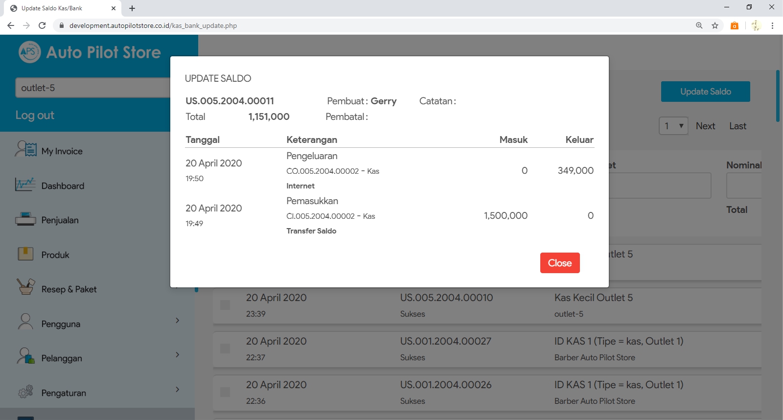 6. Pilih transaksi update saldo yang diinginkan untuk melihat informasi yang lebih detail dari update saldo tersebut.