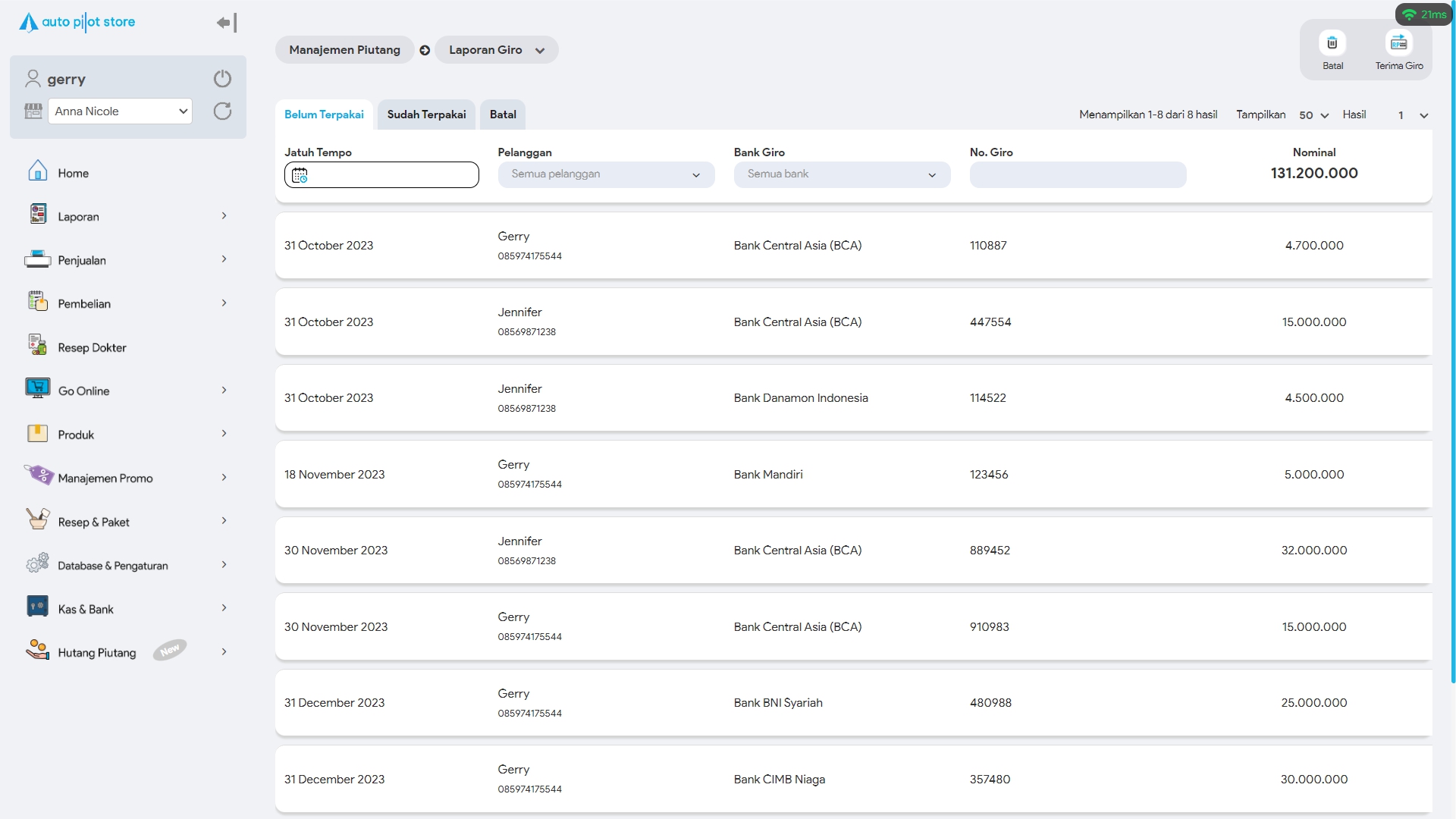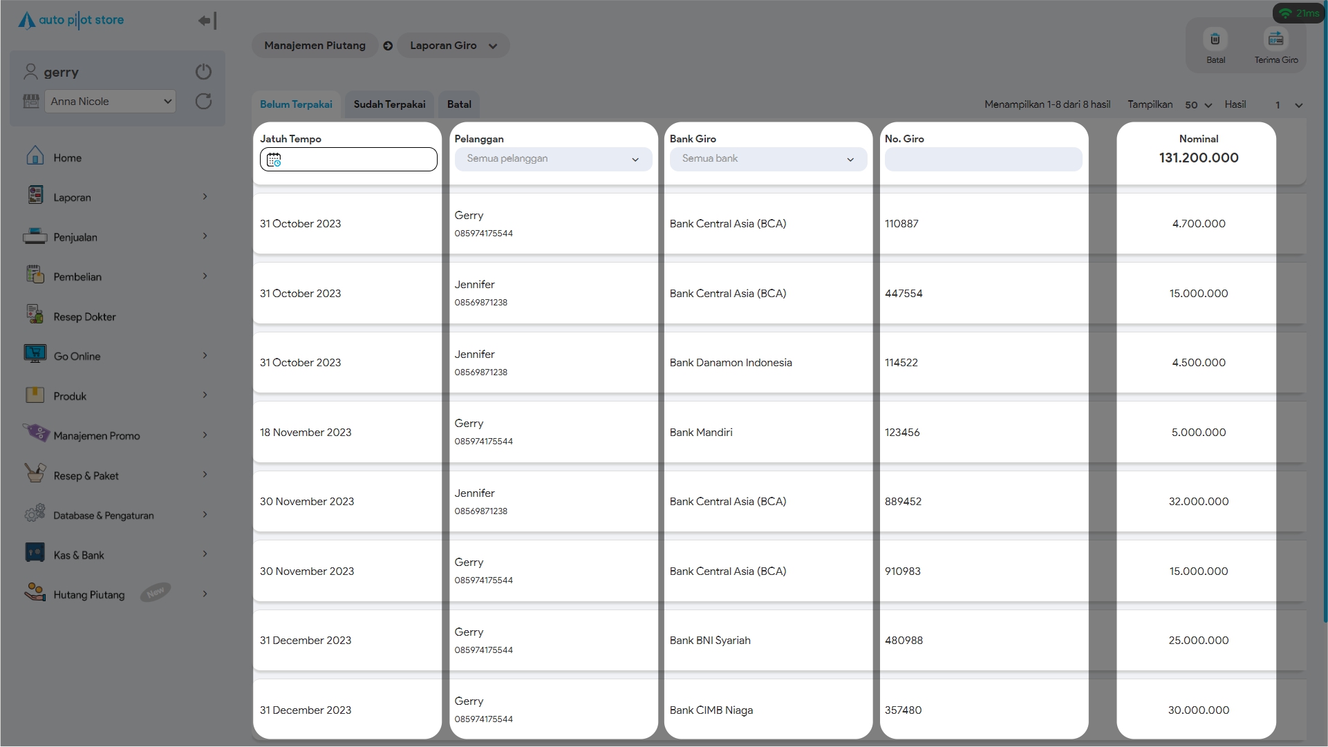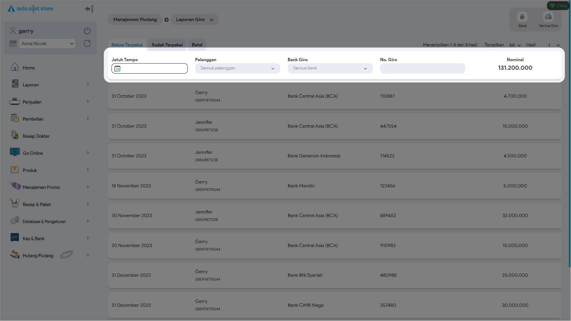 6. Untuk mencari giro tertentu, gunakan pembatasan filter jika diperlukan (tanggal jatuh tempo, pelanggan, bank giro, no giro)