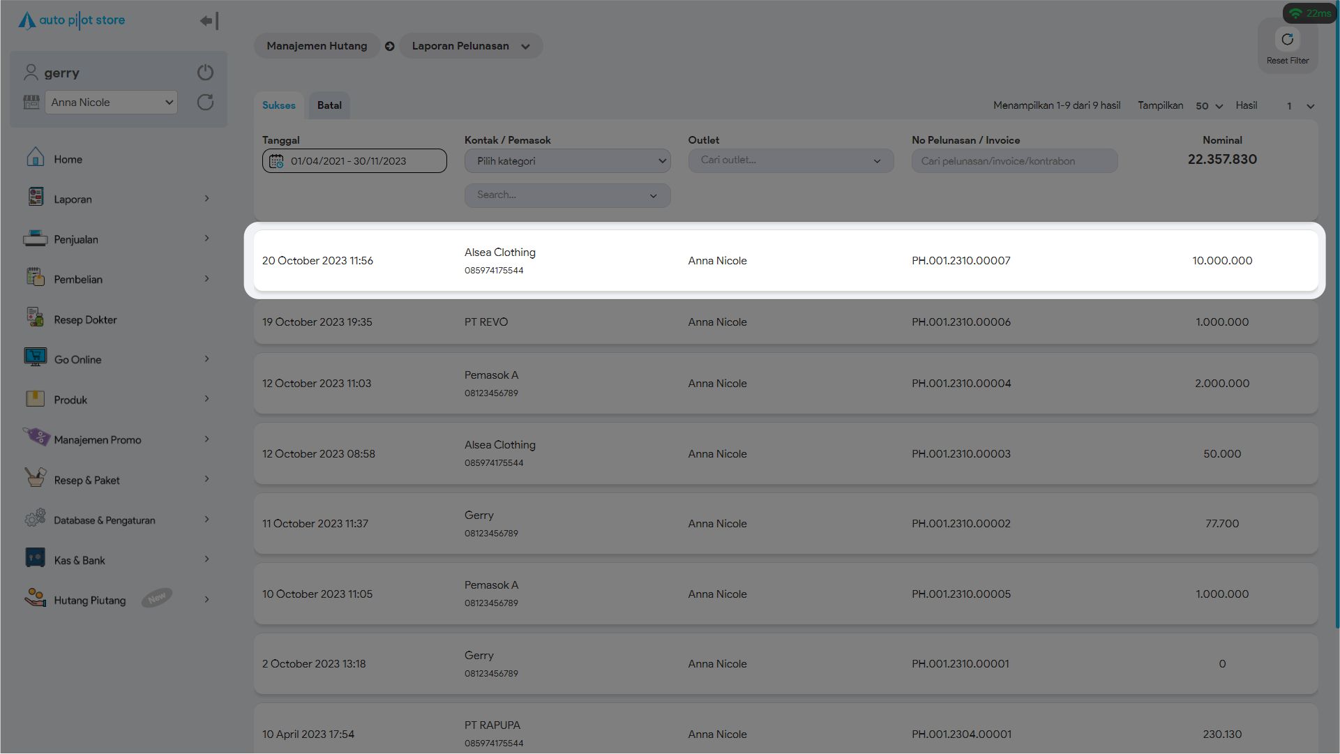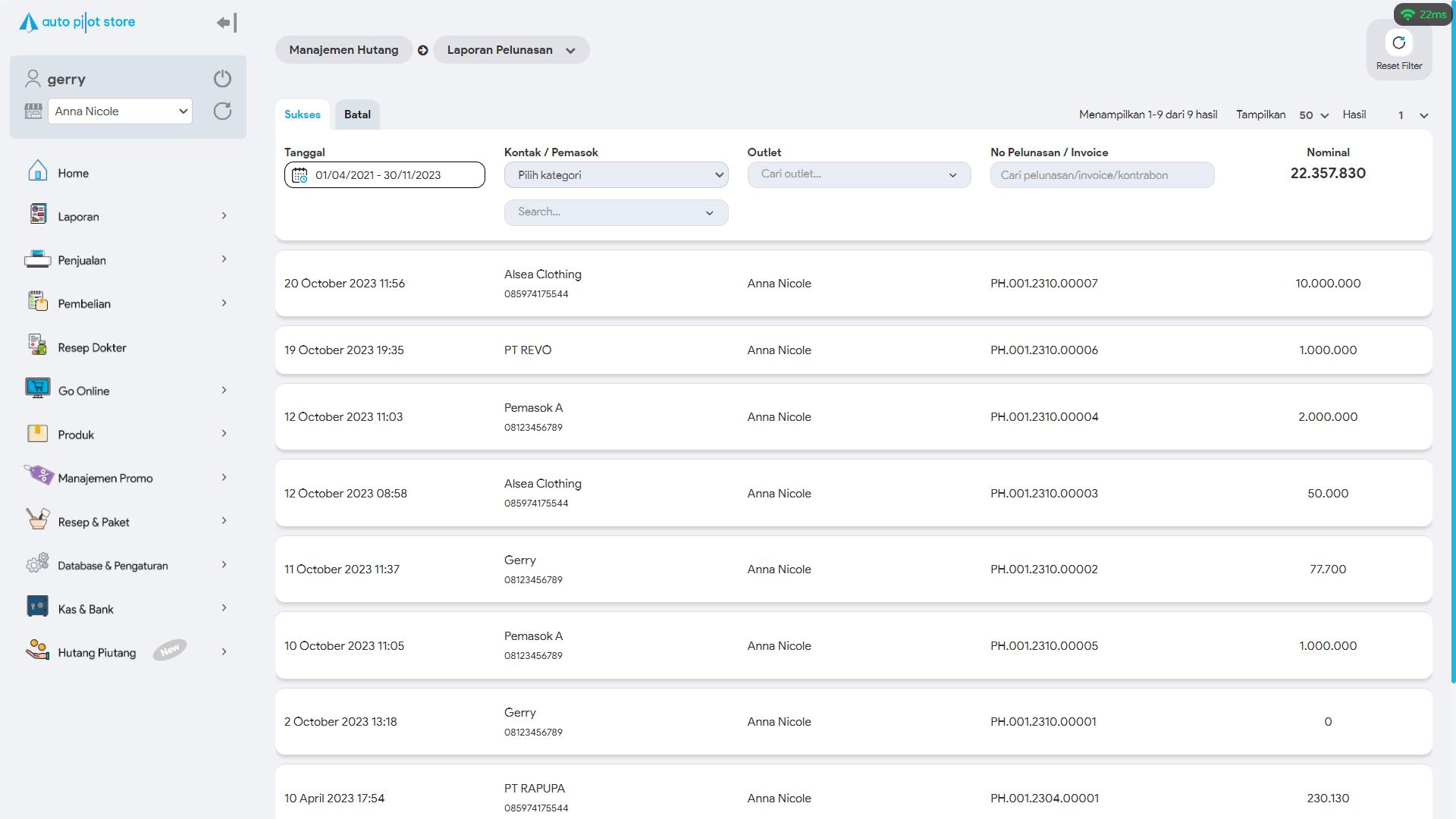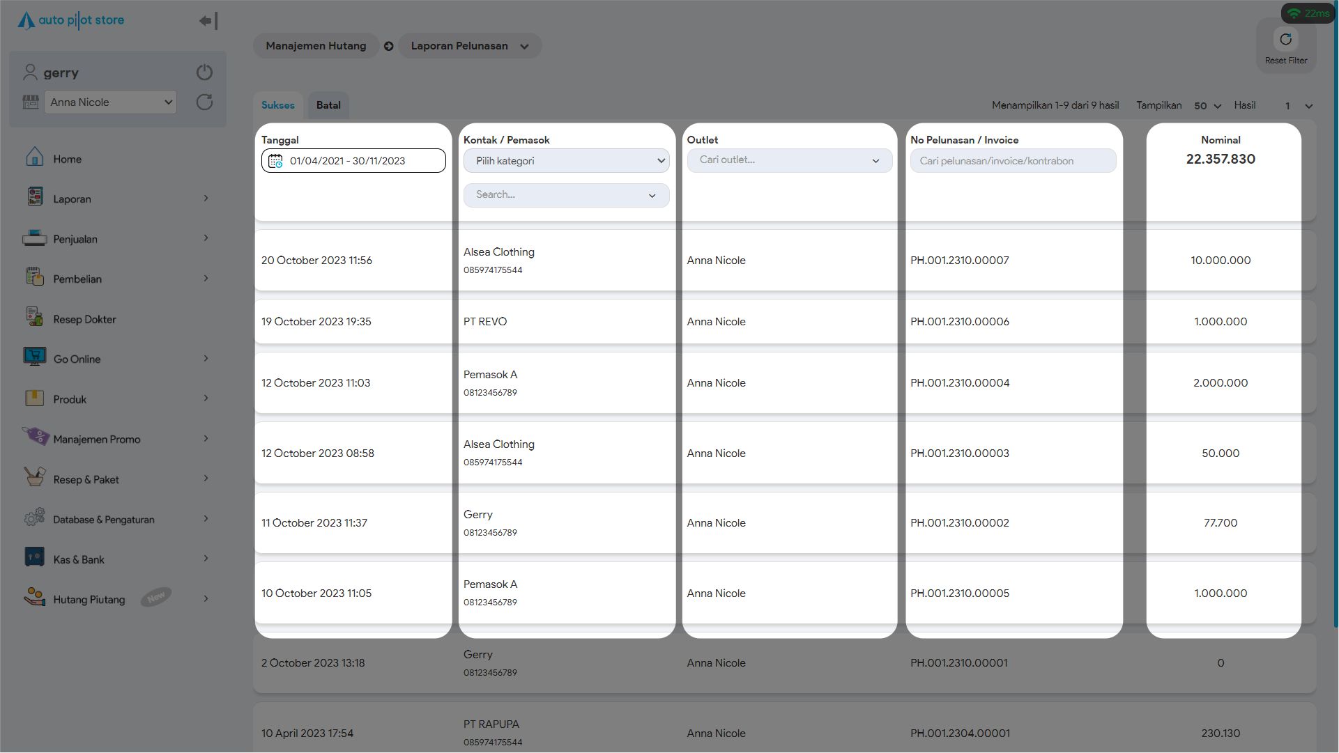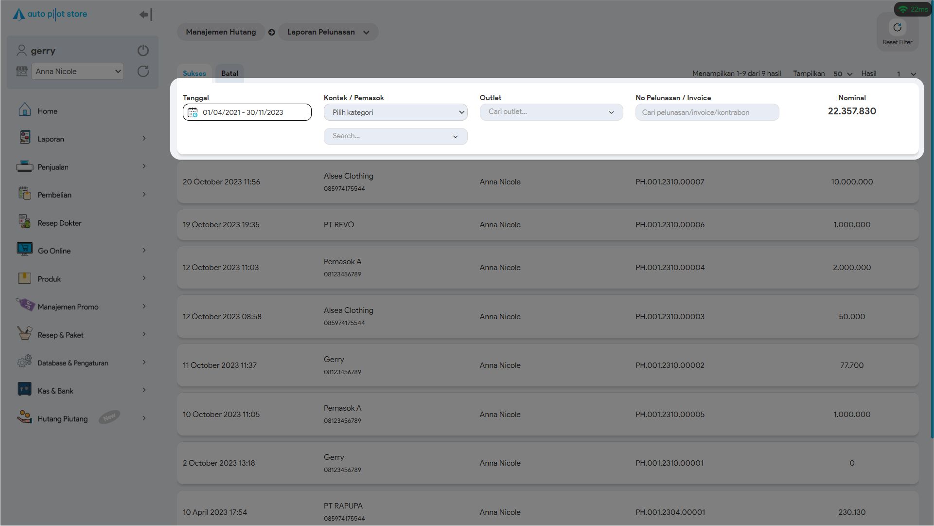 6. Untuk mencari pelunasan hutang tertentu, gunakan pembatasan filter jika diperlukan (tanggal, kontak/pemasok, outlet, no pelunasan hutang)