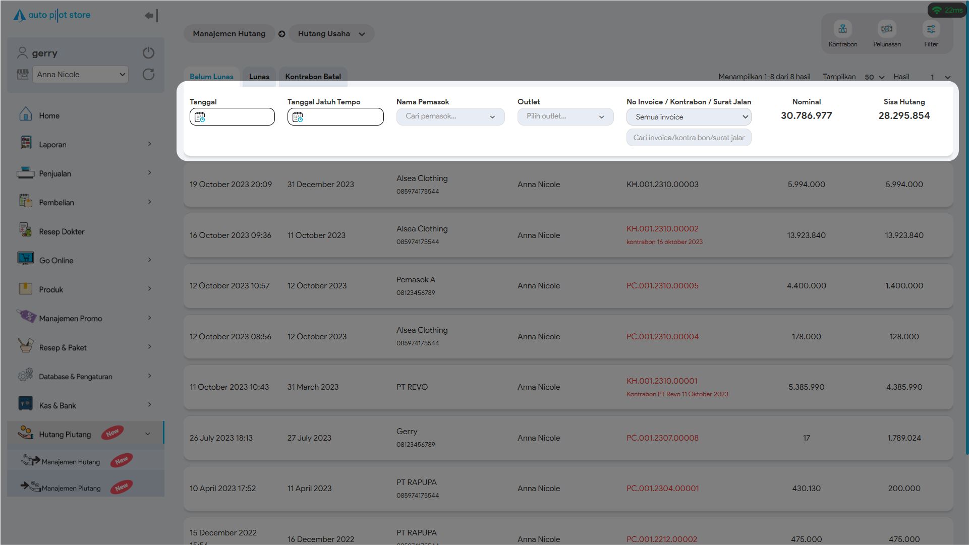 3. Cari transaksi kontrabon yang diinginkan. Gunakan pembatasan filter jika diperlukan (tanggal, pemasok, jatuh tempo, outlet, nomor invoice/ kontrabon / surat jalan)