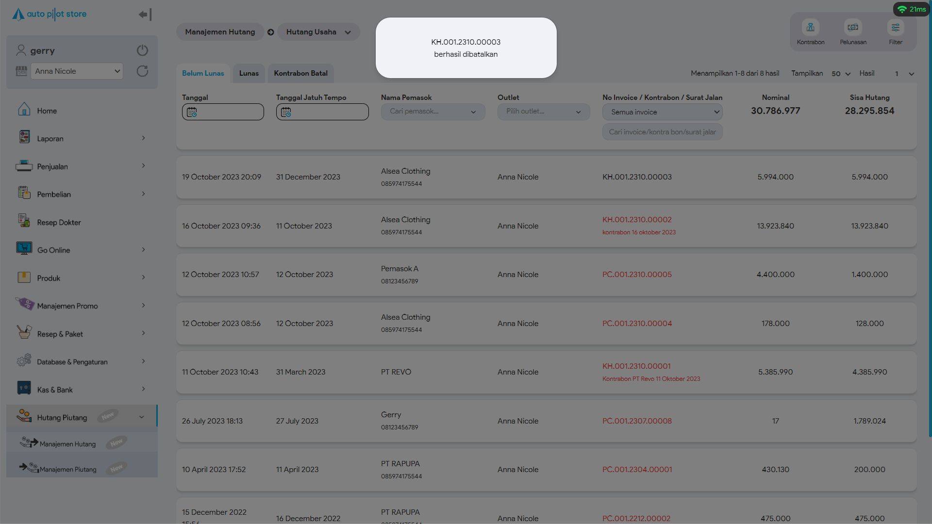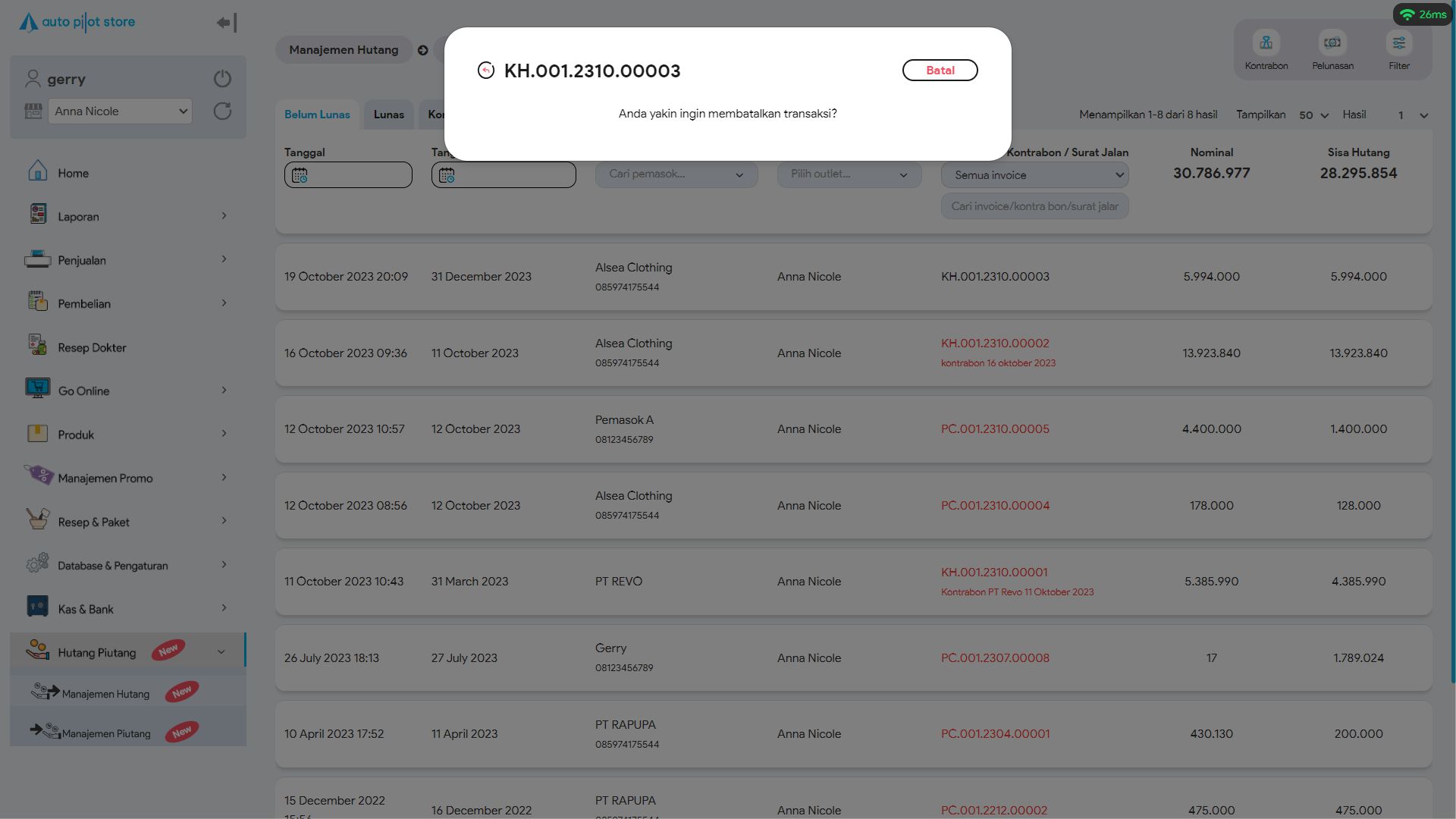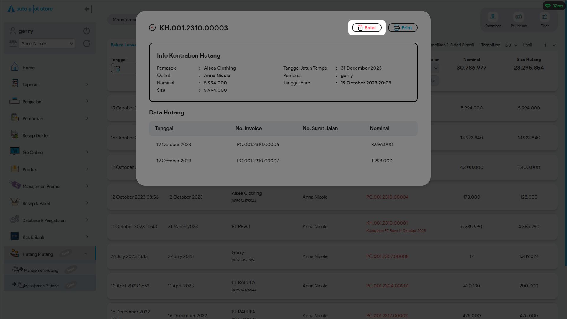Note : kontrabon Hutang dengan status lunas atau pernah dilakukan pelunasan, tidak dapat dibatalkan