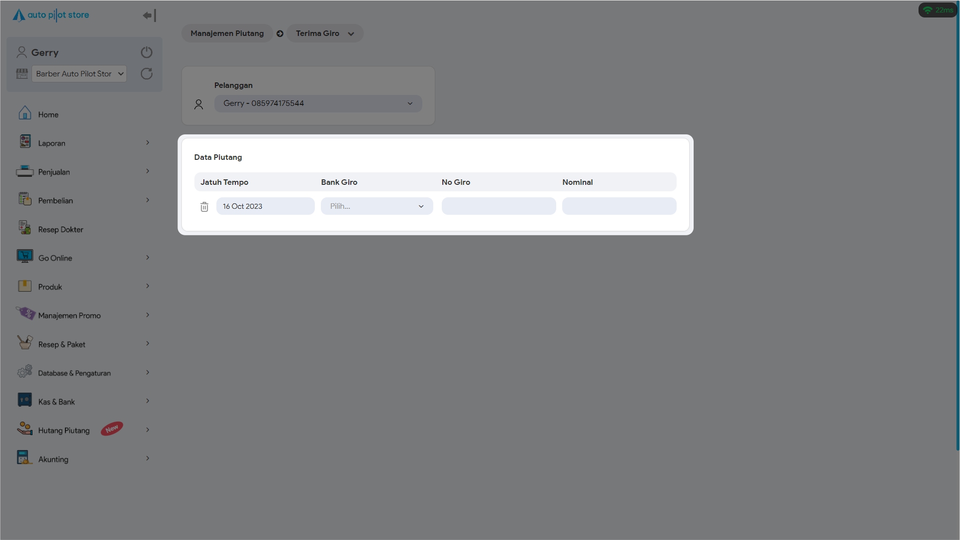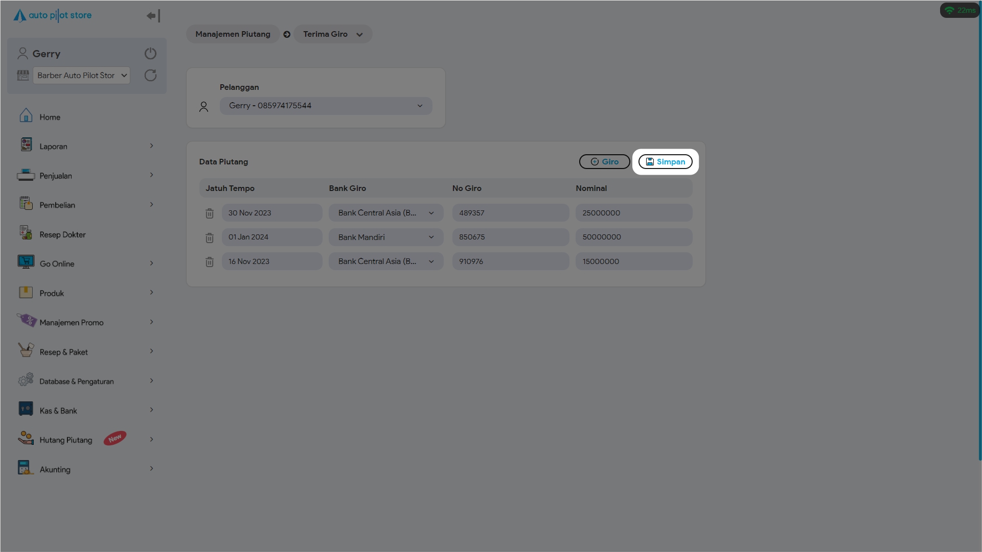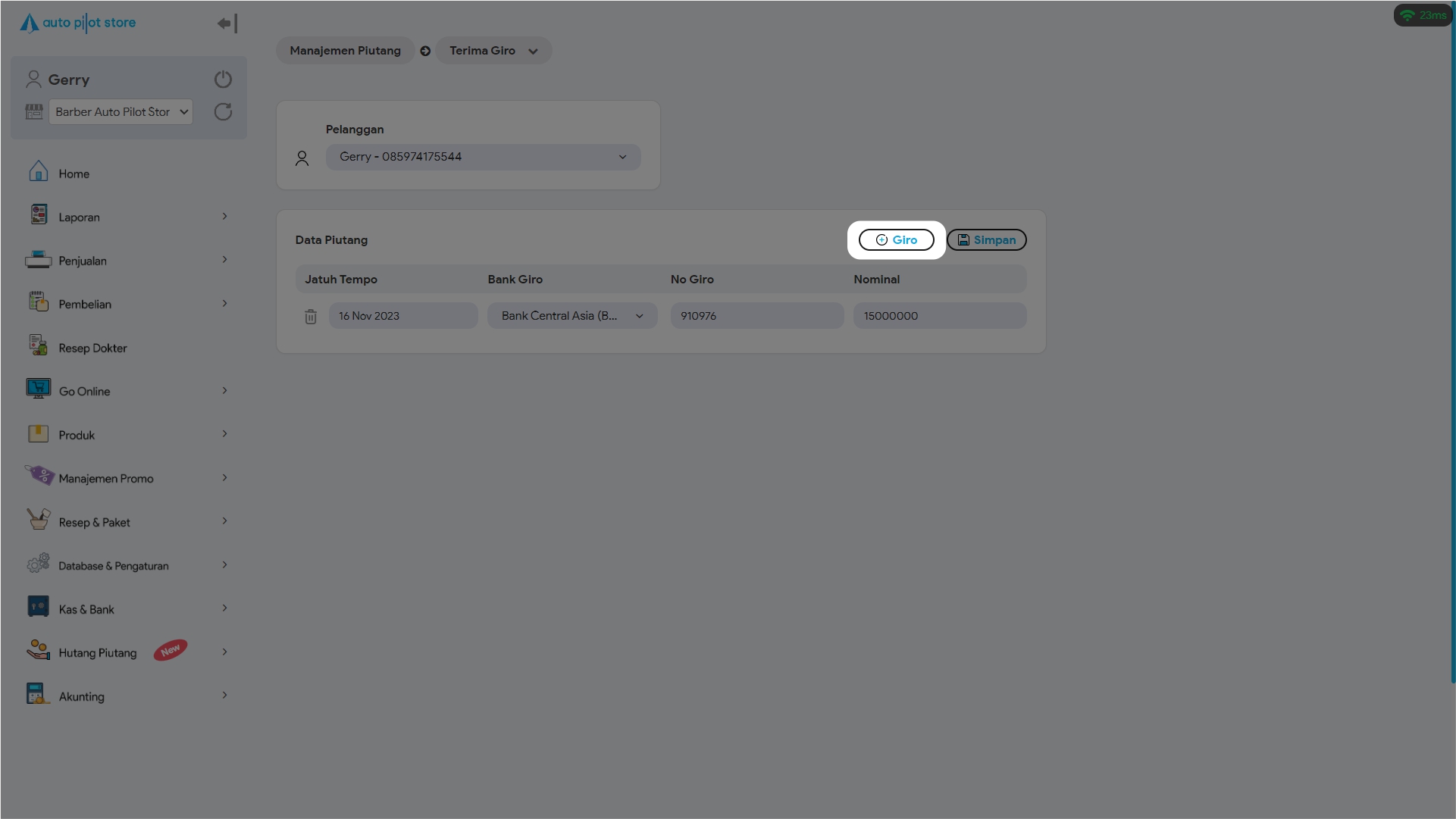 7. Pilih +Giro untuk mencatatkan giro lain