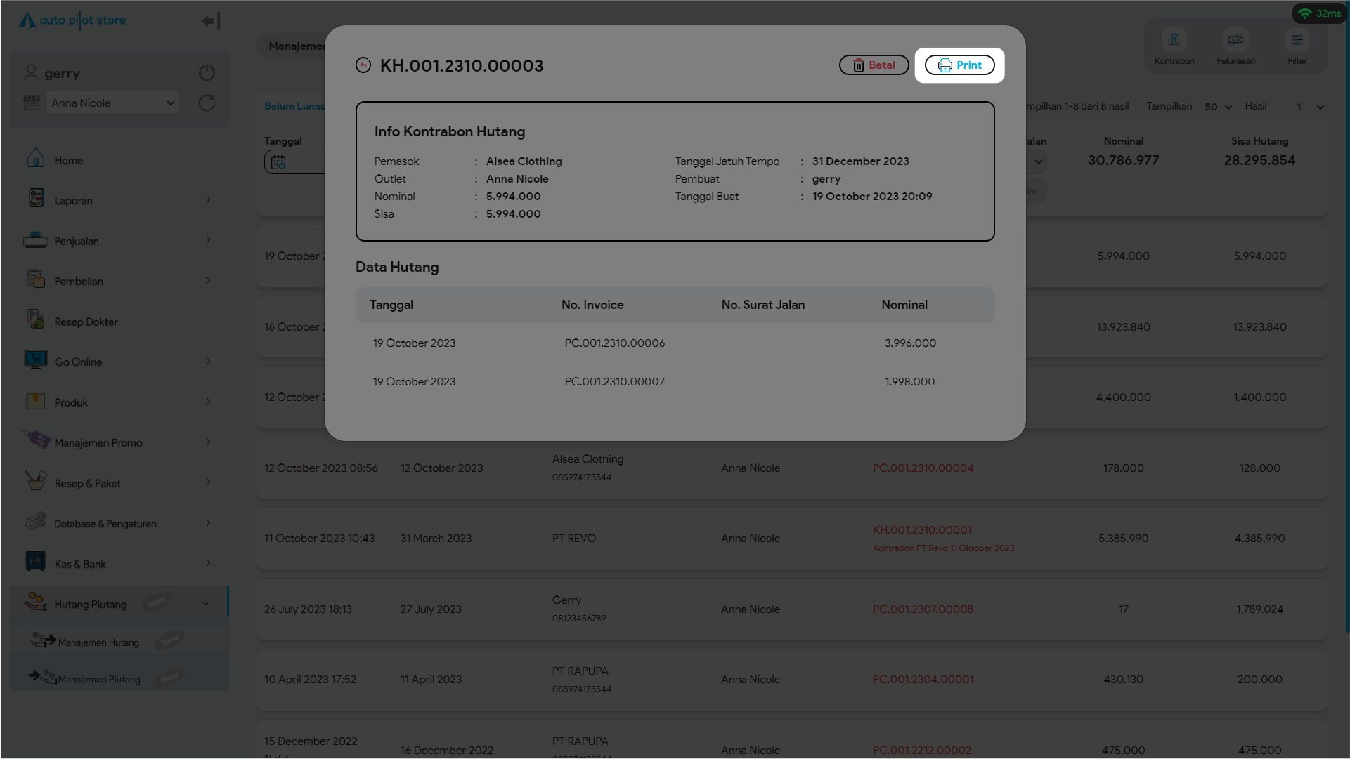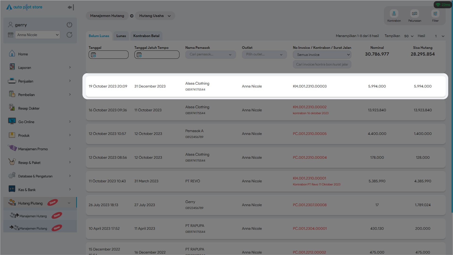 3. Cari transaksi kontrabon yang diinginkan. Gunakan pembatasan filter jika diperlukan (tanggal, pelanggan, jatuh tempo, outlet, nomor invoice/ kontrabon)