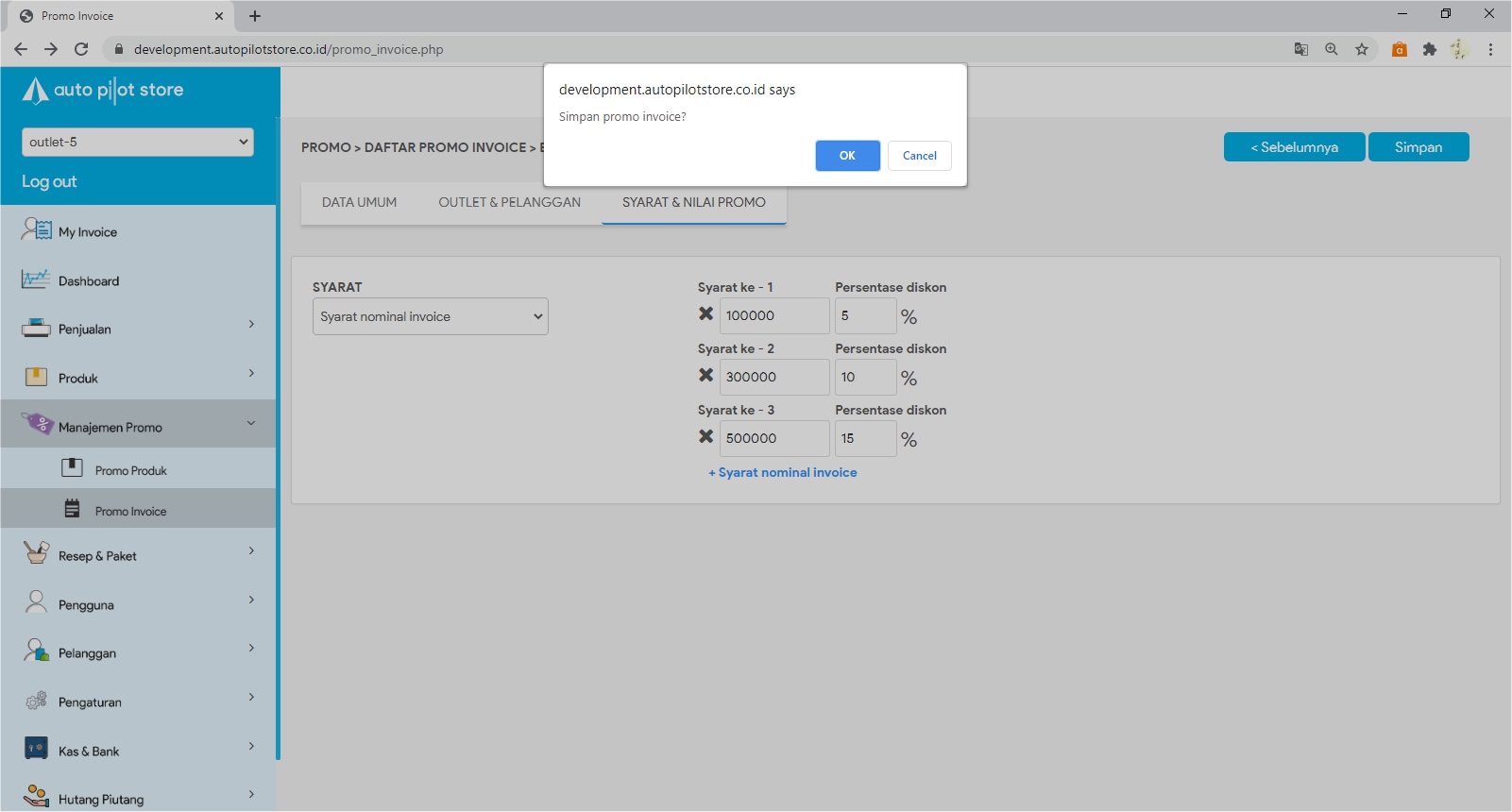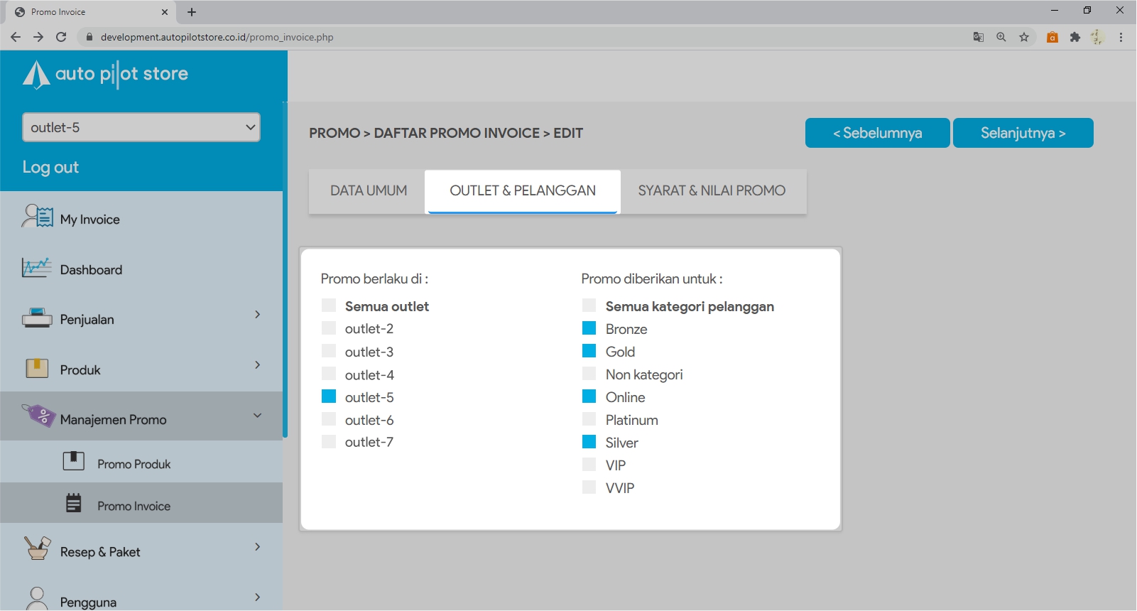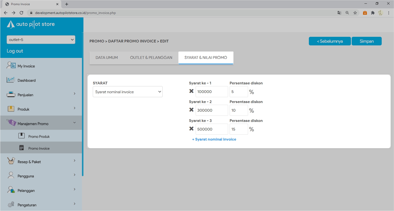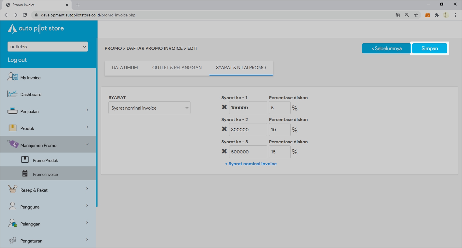 5. Lakukan perubahan yang diinginkan pada Tabulasi Data Umum, Outlet & Pelanggan, Syarat & Nilai Promo