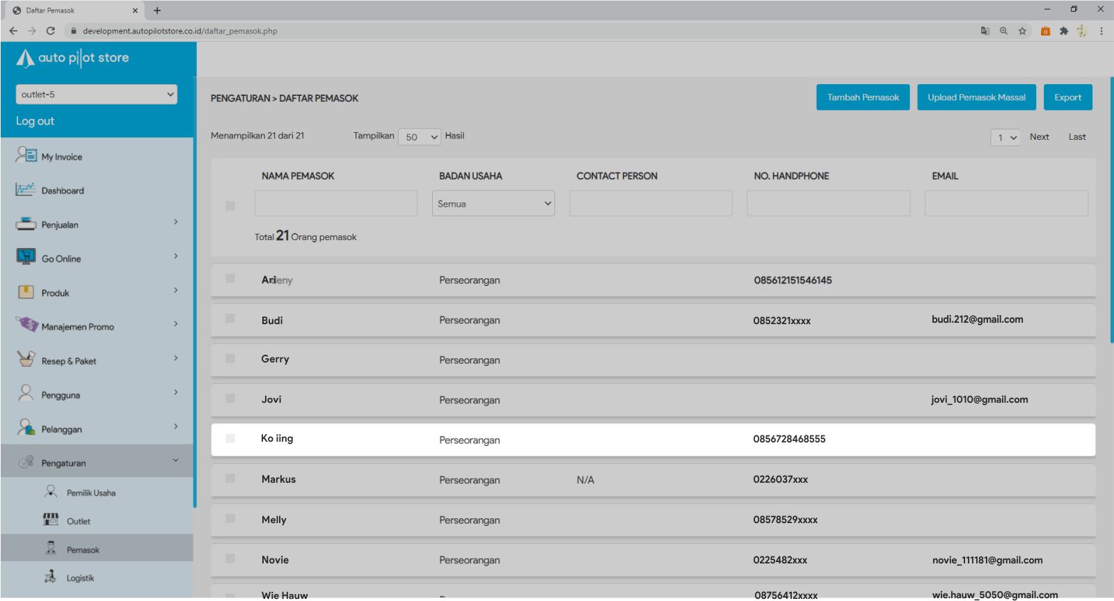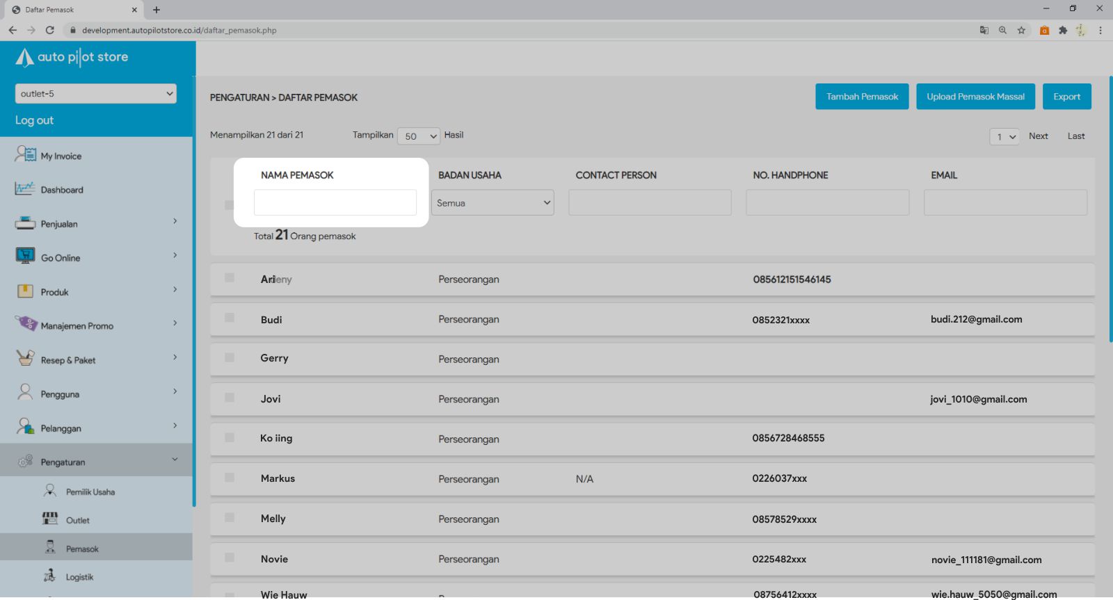 3. Masukkan nama pemasok yang ingin diatur pada kolom pencarian