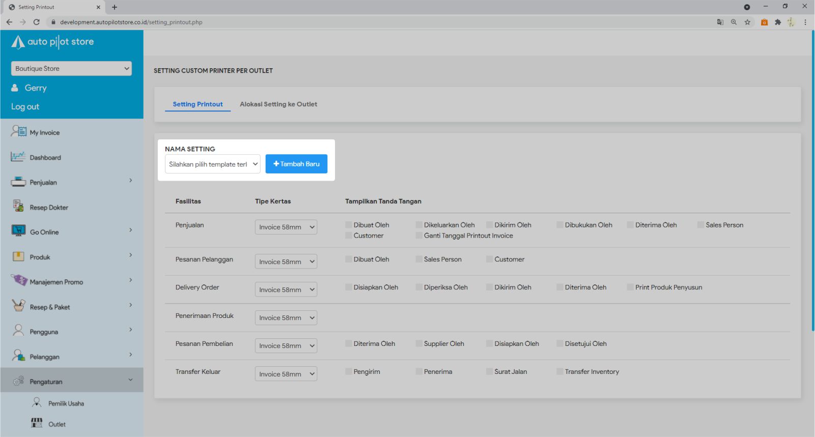 5. Di tabulasi Alokasi Setting ke Outlet, silakan pilih template printout yang akan Anda gunakan di setiap outlet Anda
