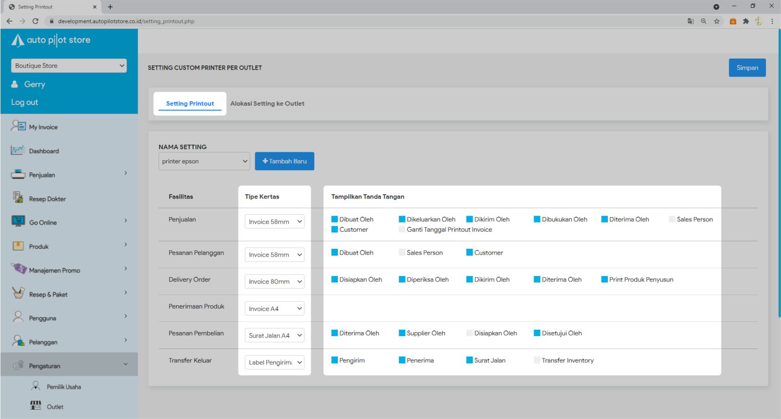 4. Setelah memilih Nama Template Printout, silakan atur