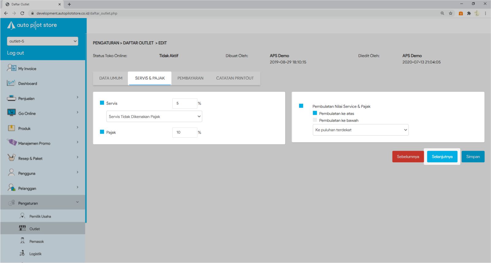 5. Pilih Selanjutnya untuk masuk ke Tabulasi Servis & Pajak