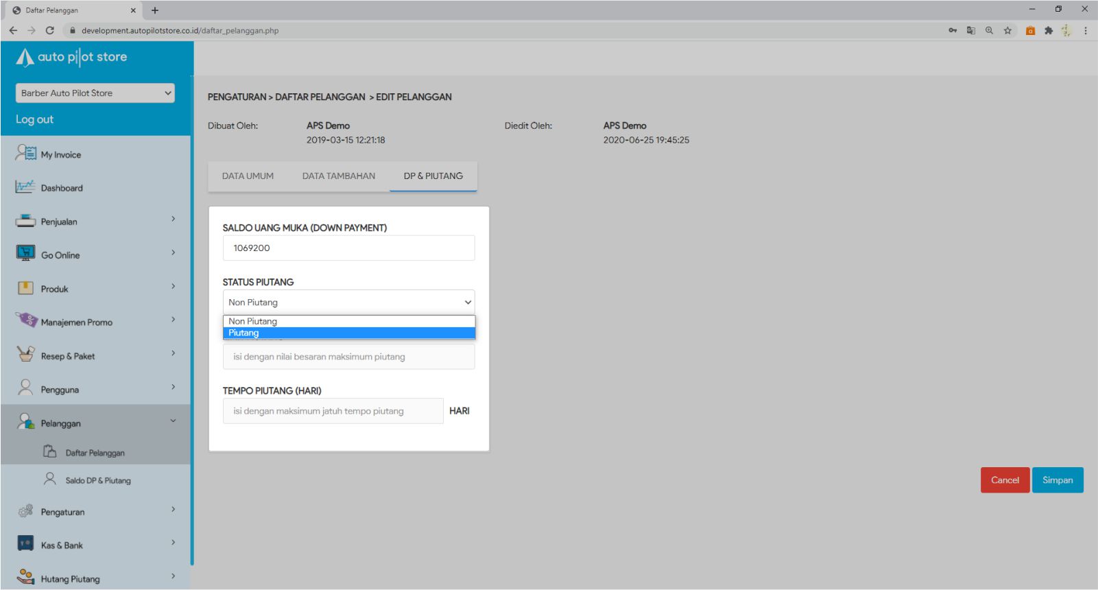 6. Pilih Status Piutang untuk pelanggan tersebut. Pilih Piutang bila pelanggan diberikan akses untuk melakukan pembayaran dengan cara piutang