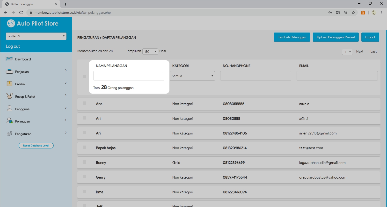 3. Cari Nama Pelanggan yang ingin dihapus di kolom search