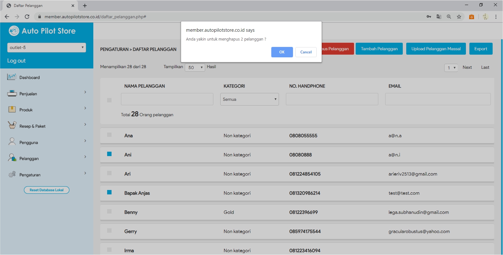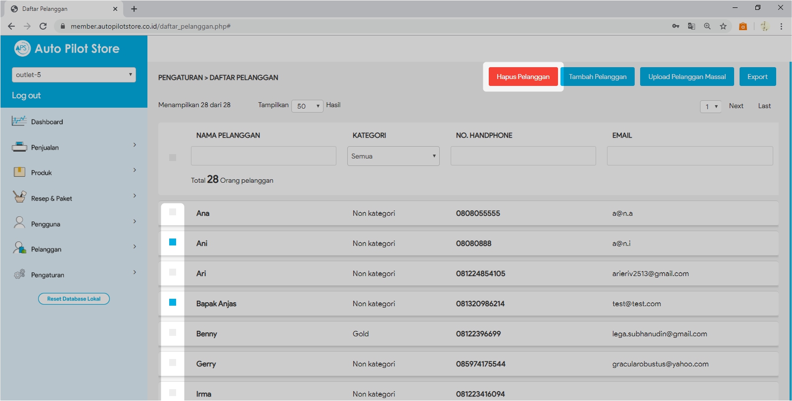 4. Klik cheklist pada bagian depan Nama Pelanggan yang ingin dihapus (bisa dilakukan lebih dari satu nama pelanggan)