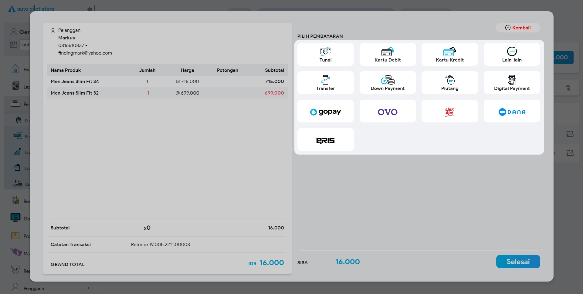 15. Selesaikan proses pembayaran (apabila nilai barang pengganti lebih besar). Pilih jenis pembayaran dan masukkan jumlah pembayaran