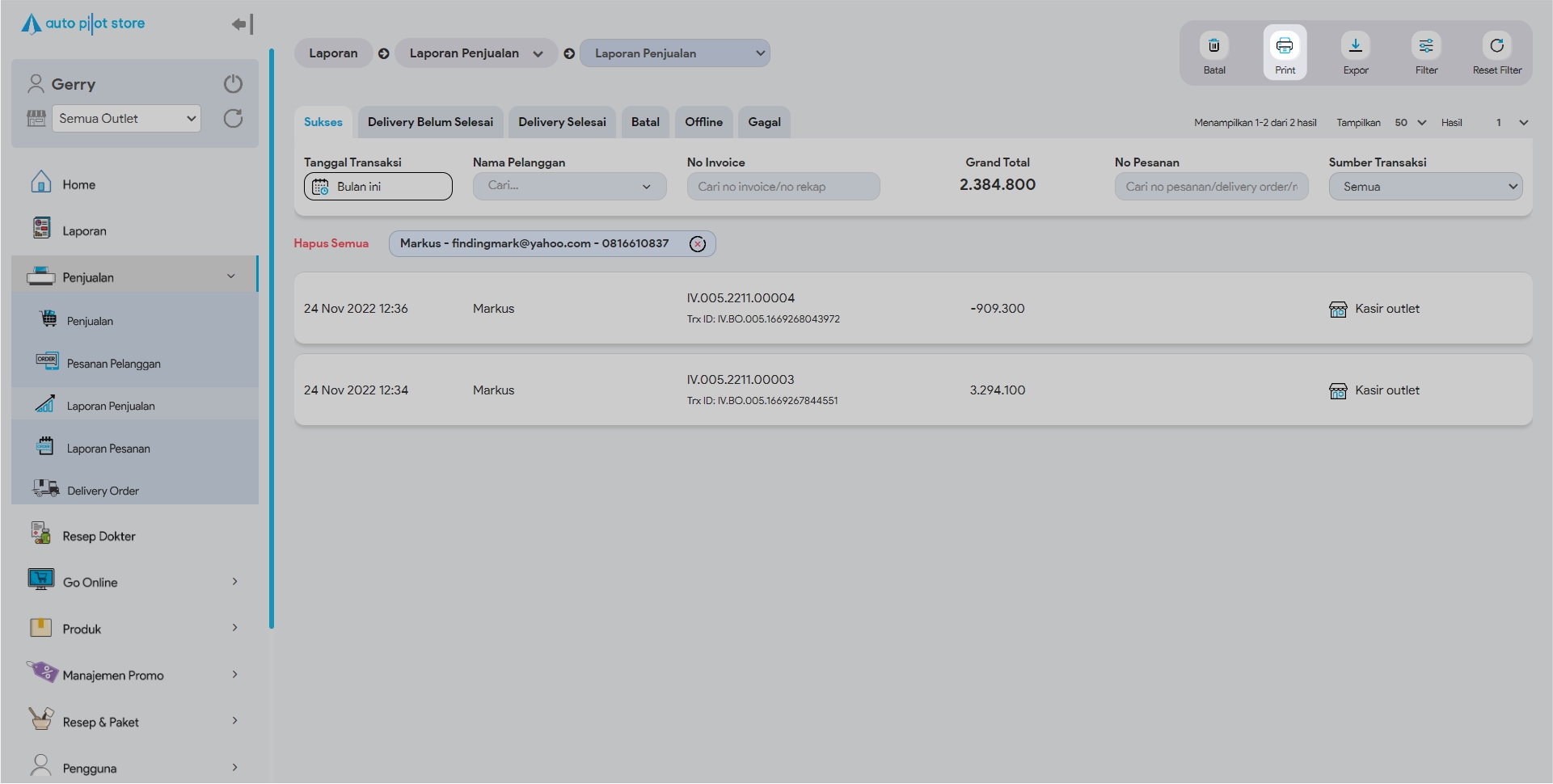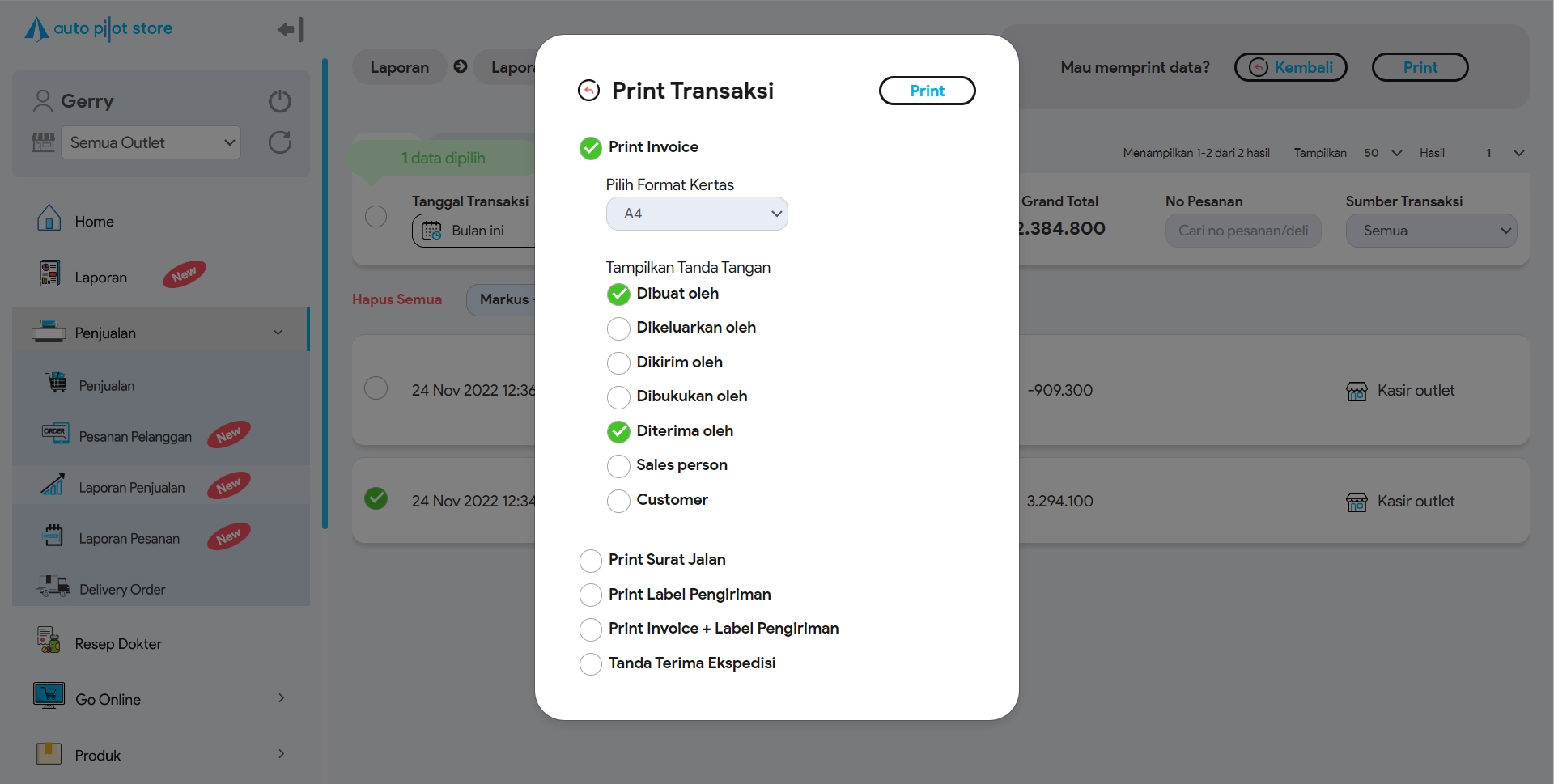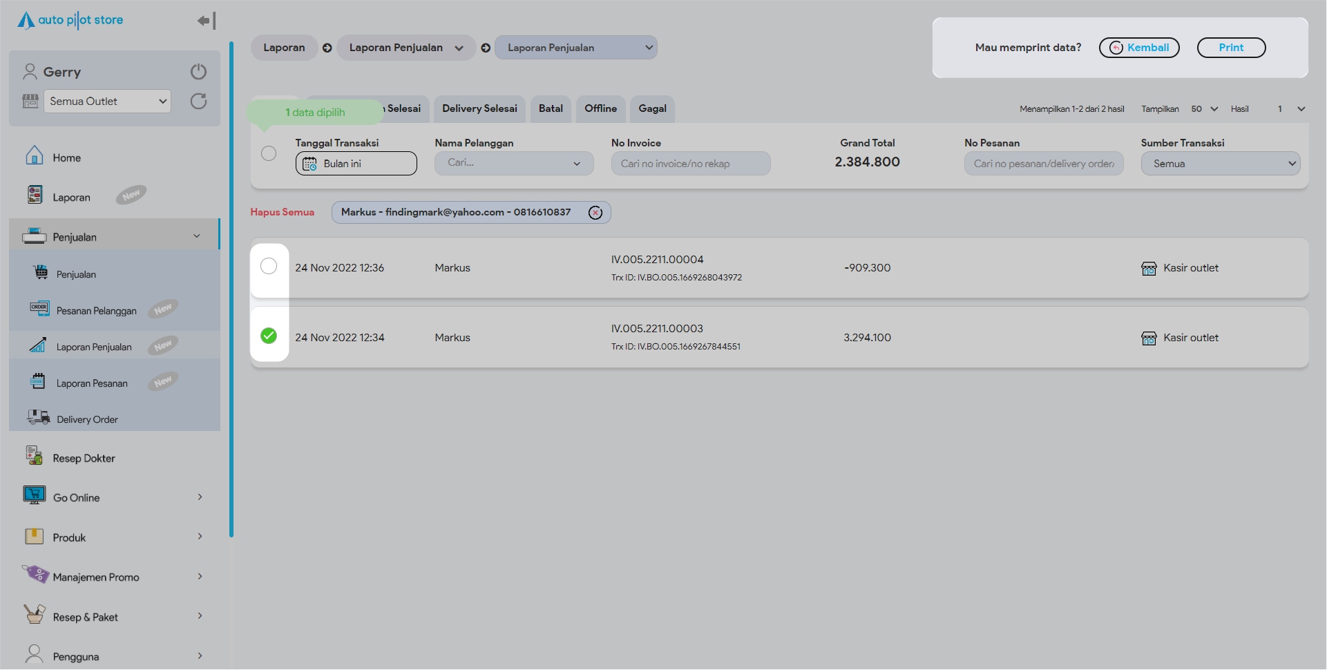 3. Cari transaksi penjualan yang hendak di print (melalui pembatasan Filter jika diperlukan), jika sudah klik button Print