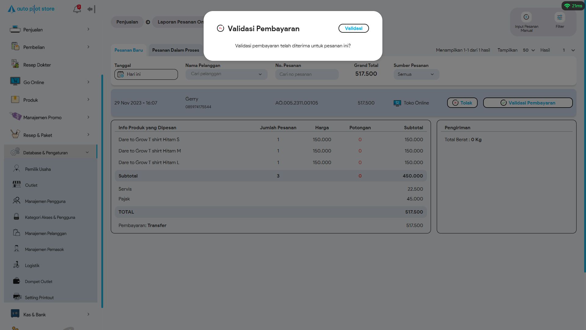 3. Klik Validasi Pembayaran pada pesanan yang bersumber pada Toko Online
