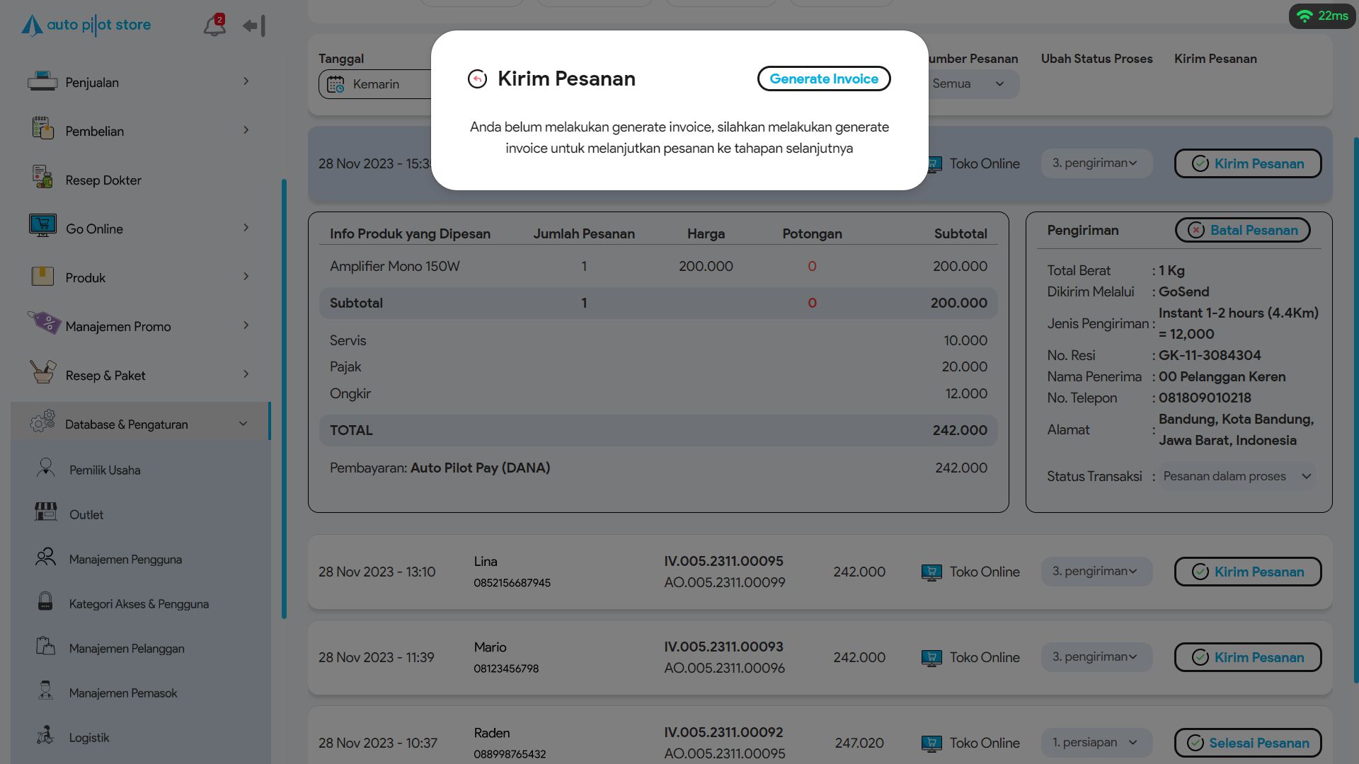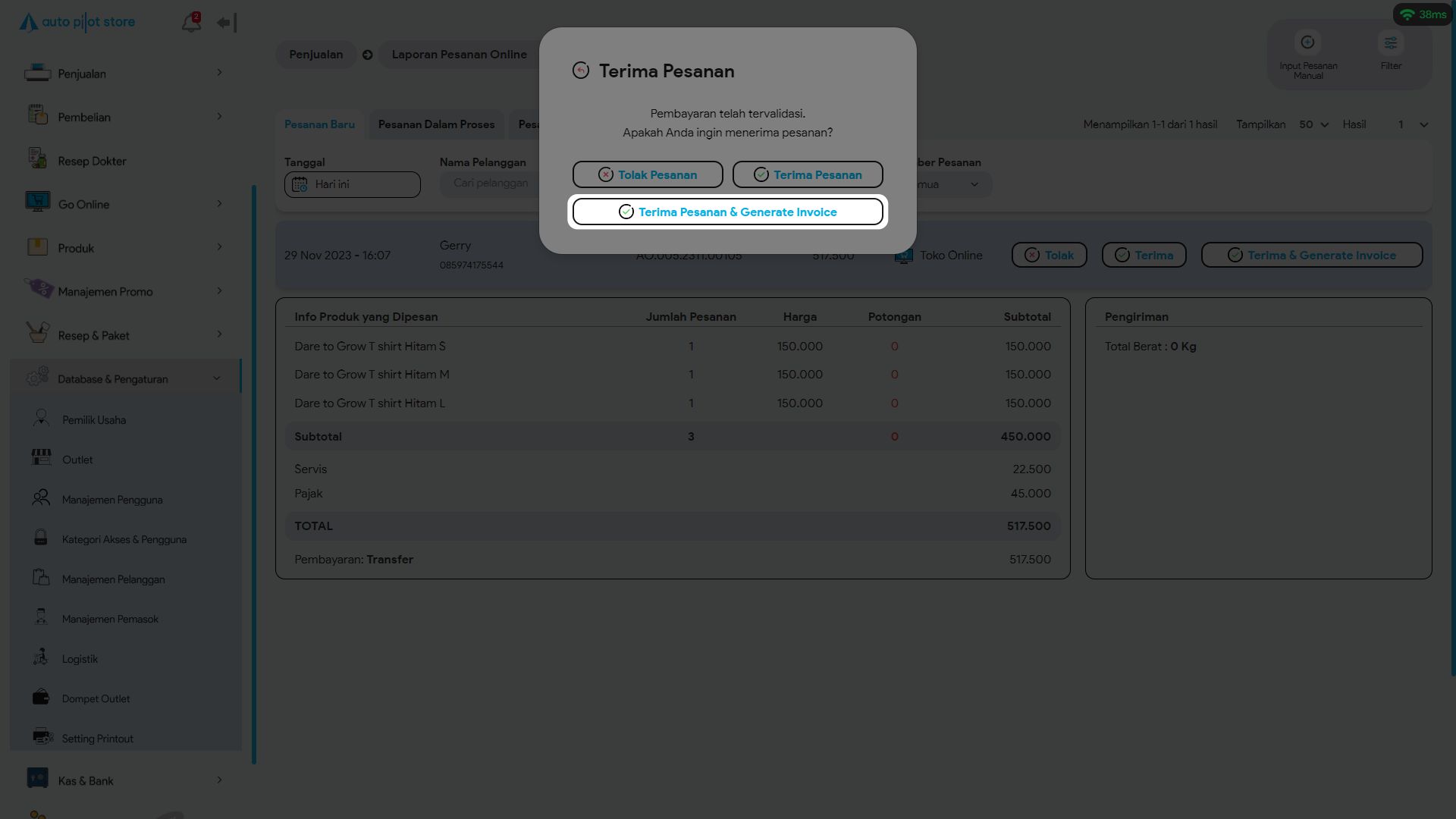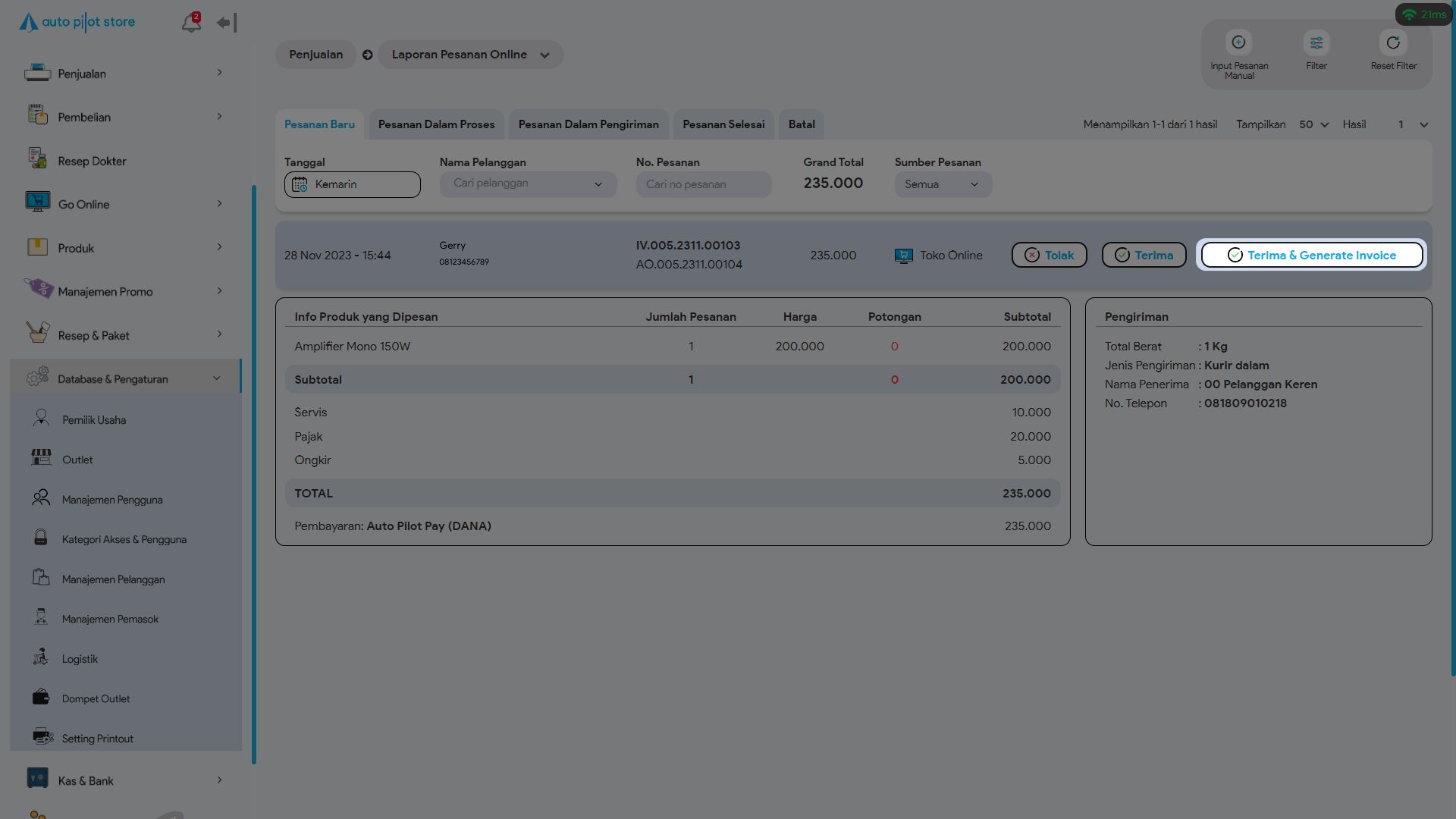 5. Klik button Terima Pesanan & Generate Invoice