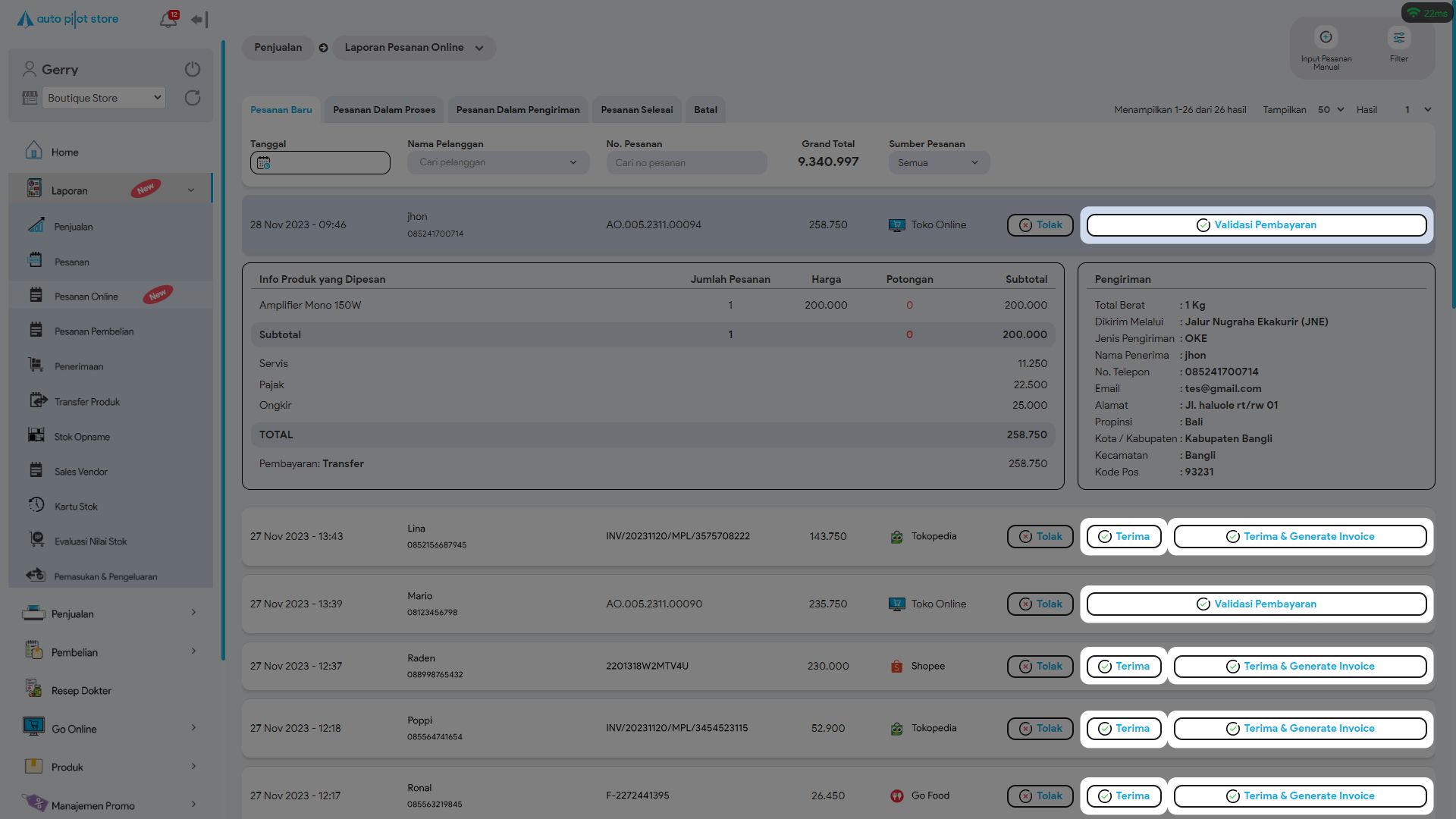 3. Klik Validasi Pembayaran (khusus toko online APS), Terima atau Terima & Generate Invoice untuk memproses pesanan