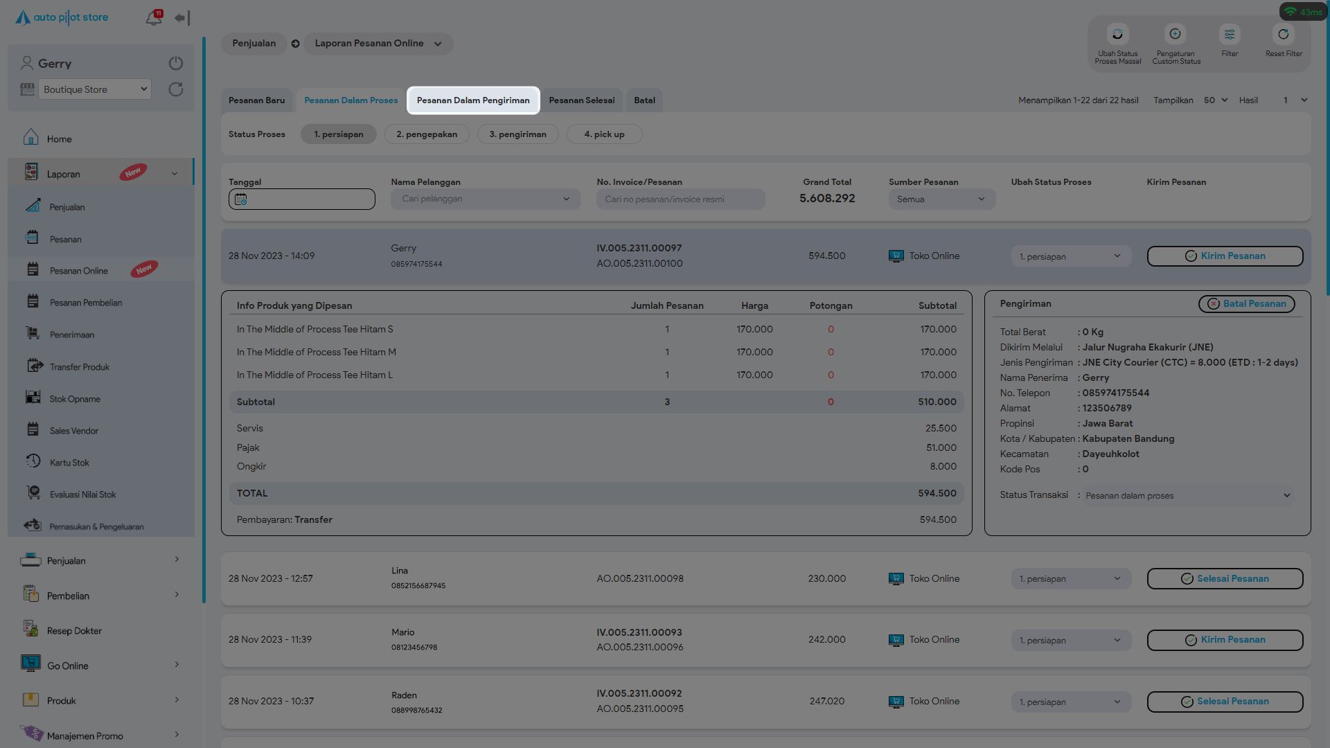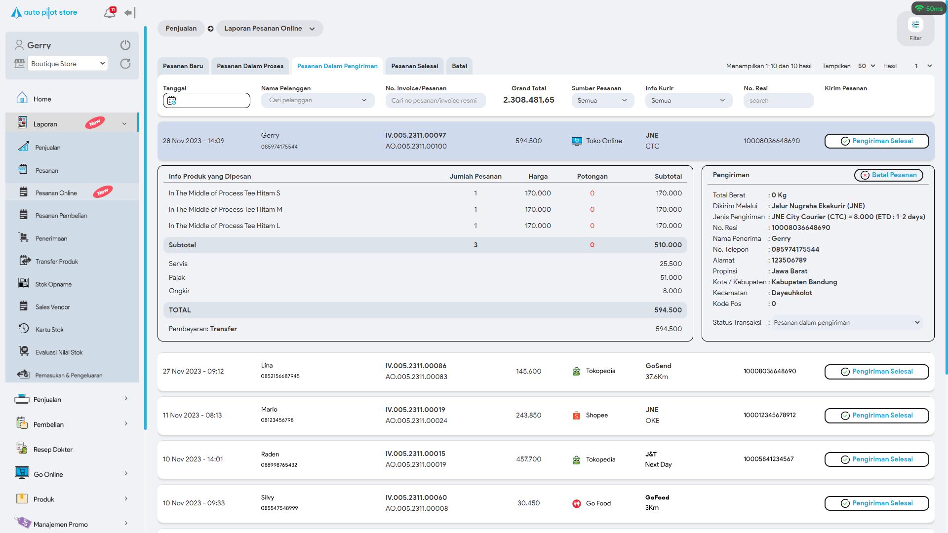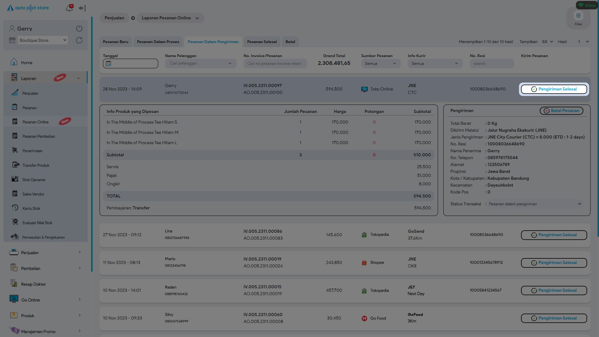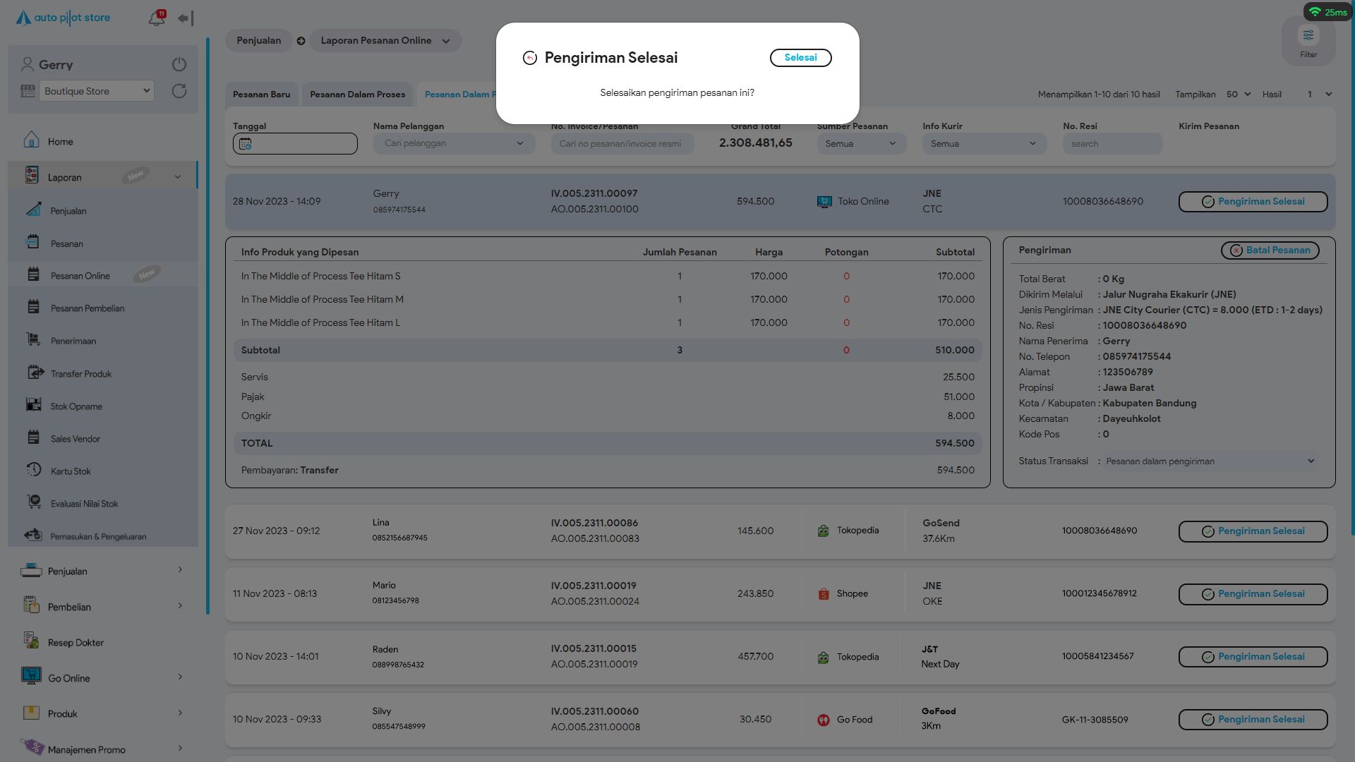 10. Sistem APS akan menampilkan pesanan online yang sedang dalam pengiriman