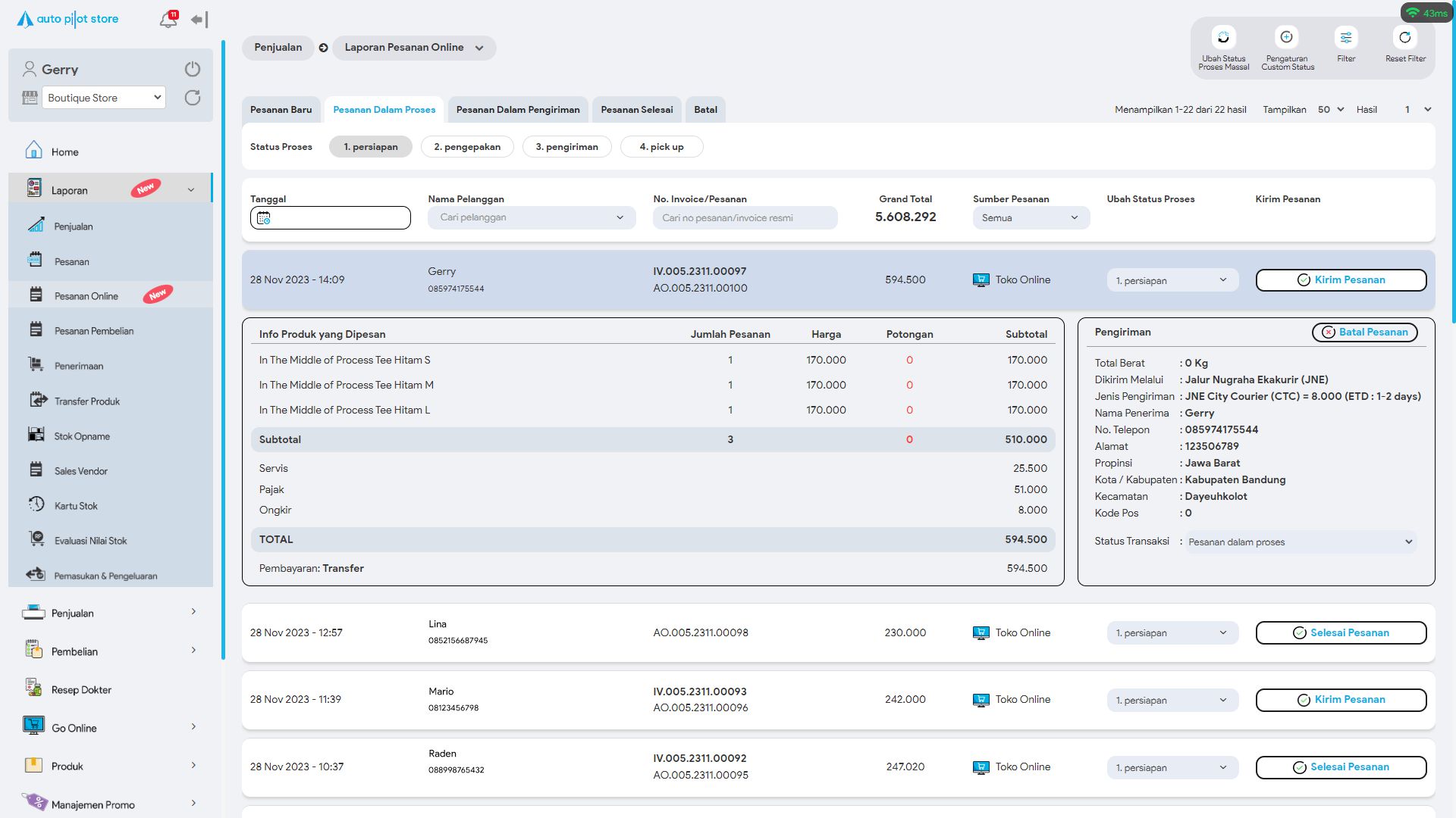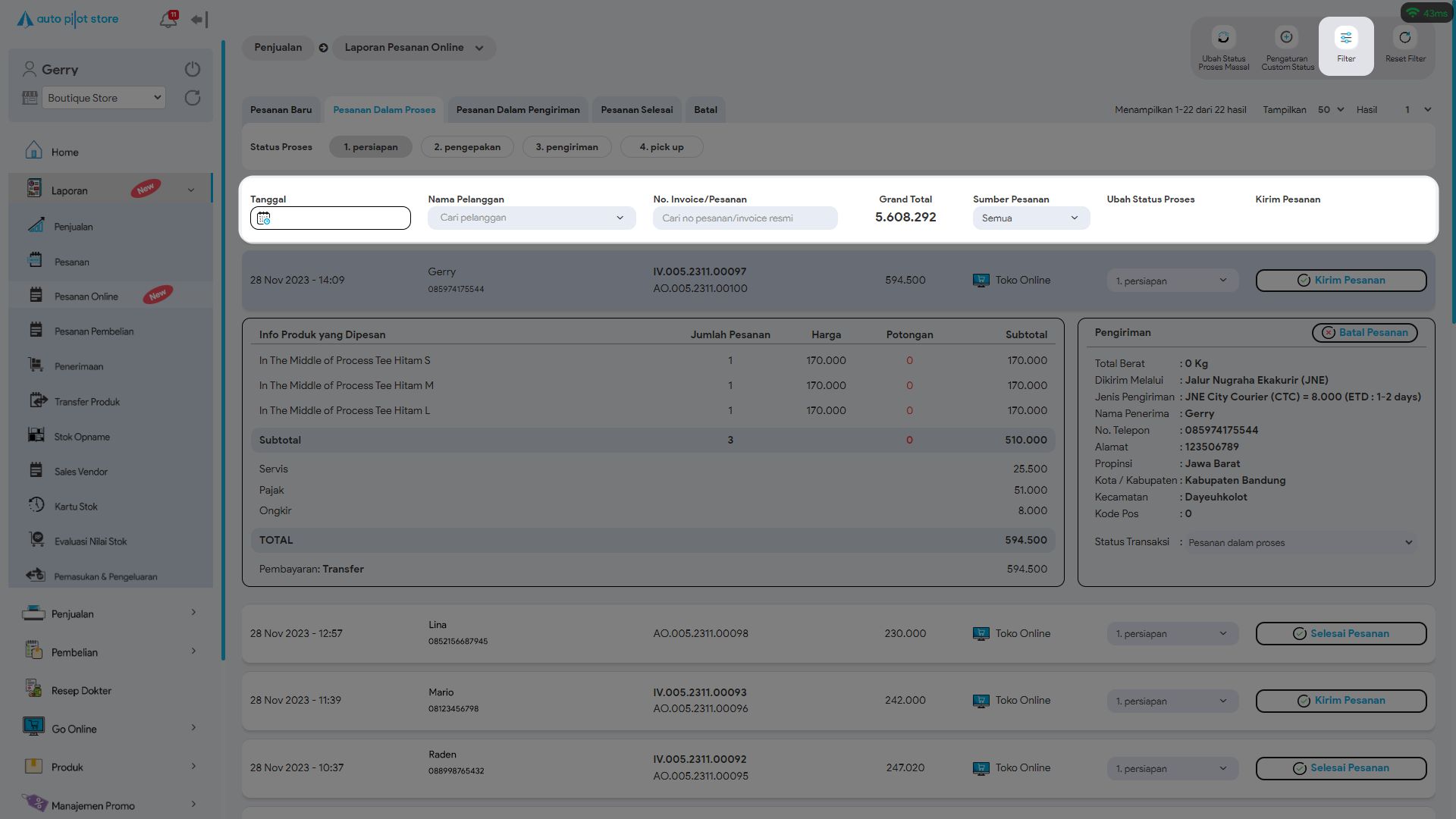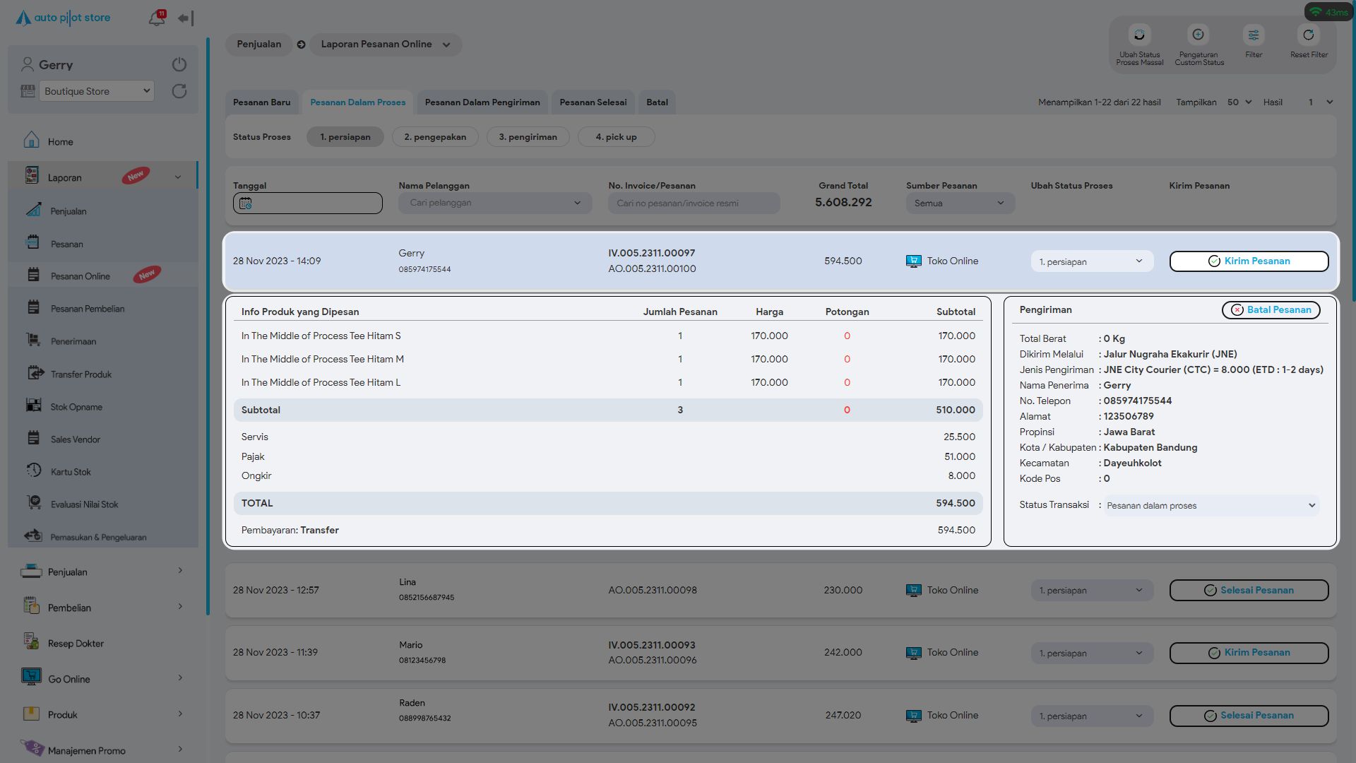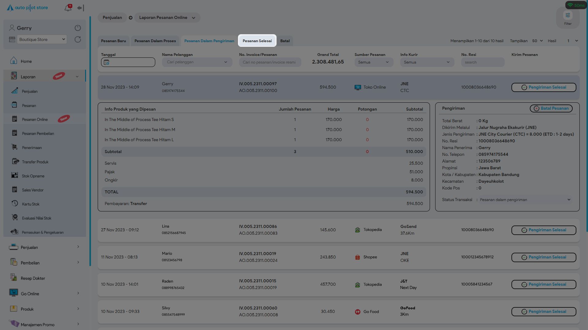 10. Sistem APS akan menampilkan pesanan online yang sedang dalam pengiriman