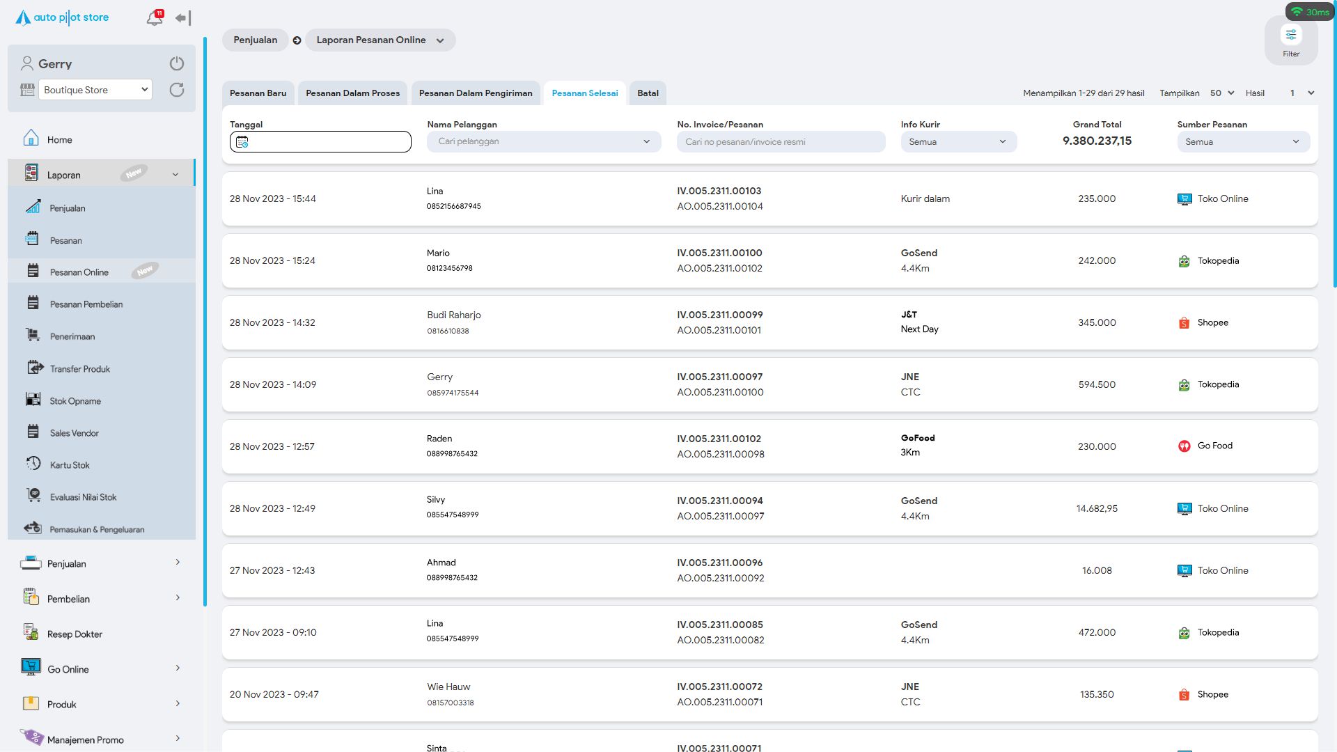 14. Sistem APS akan menampilkan pesanan online yang sudah selesai.