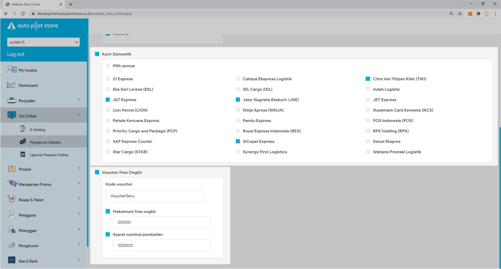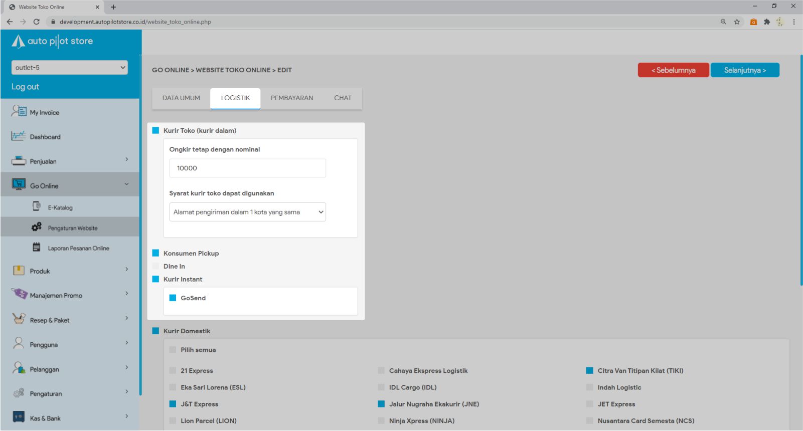 5. Tabulasi LOGISTIK berisi pilihan logistik yang dapat tampil di toko online, seperti: