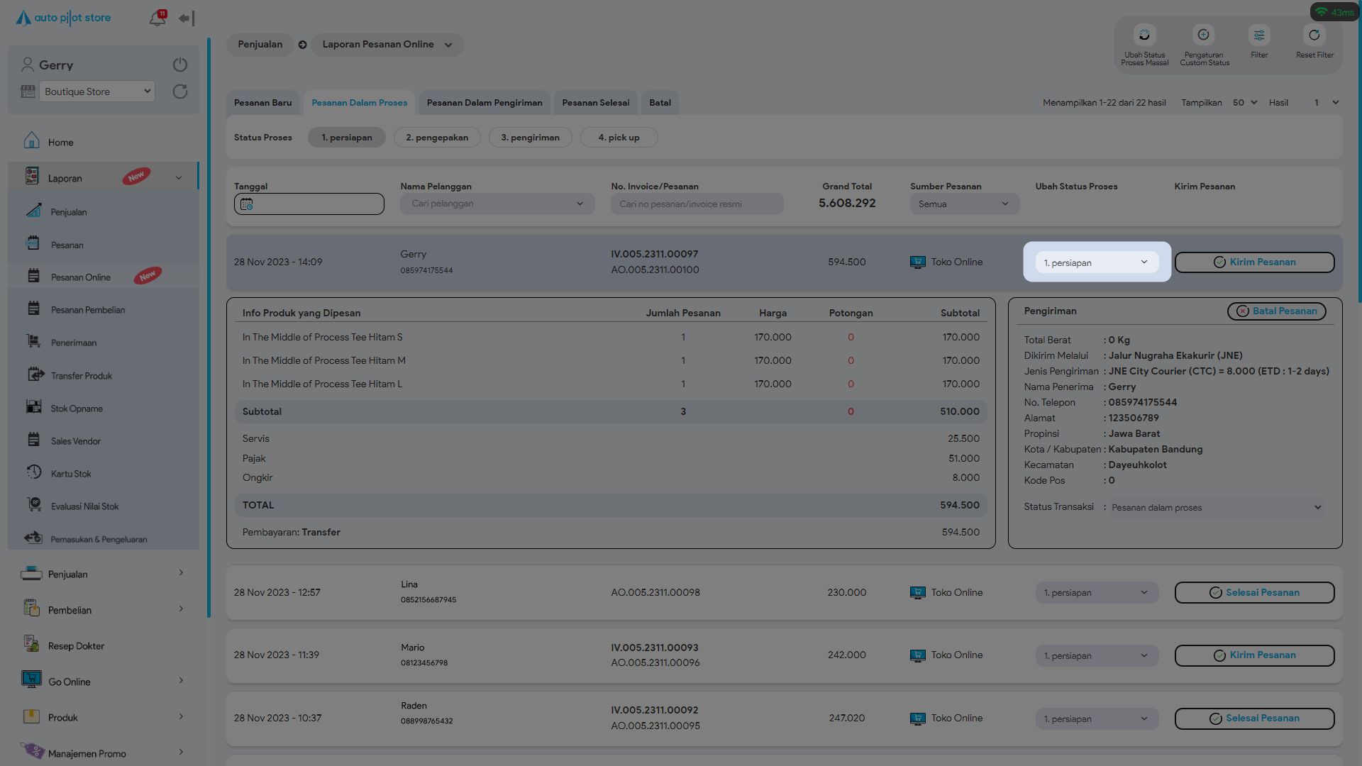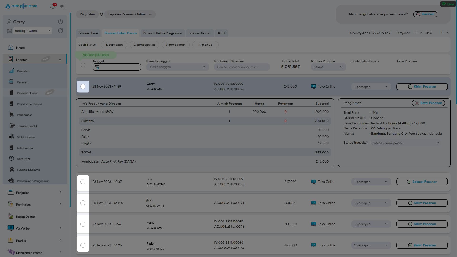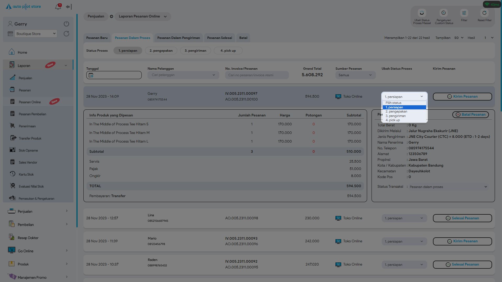 7. Pilih pesanan yang ingin diubah statusnya